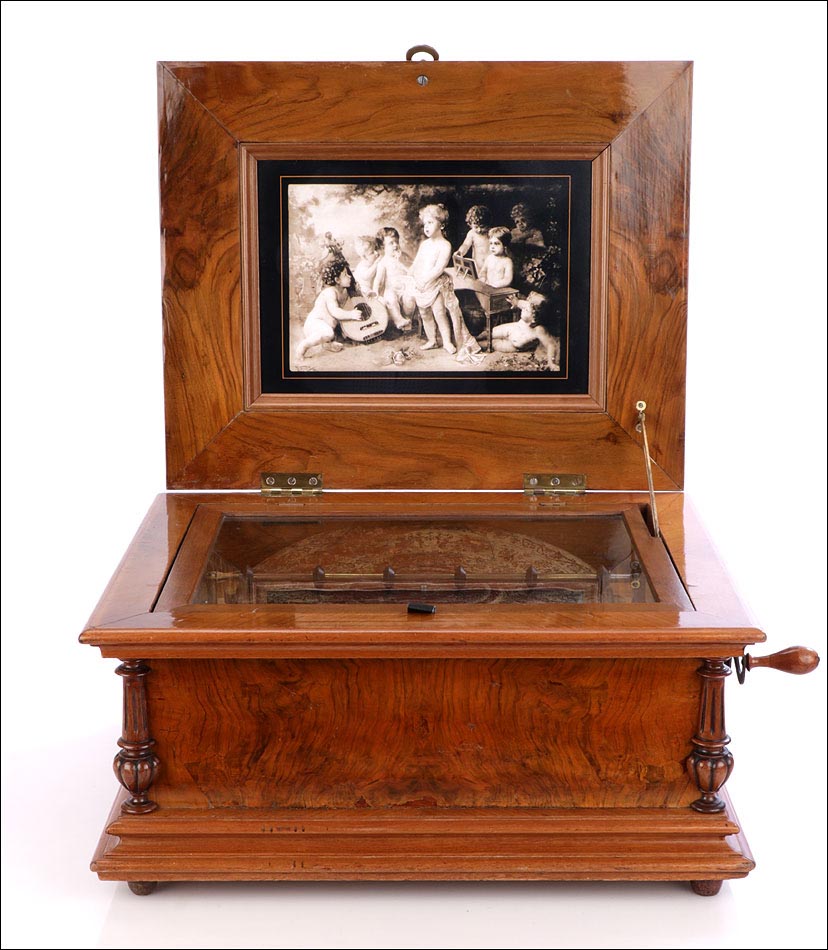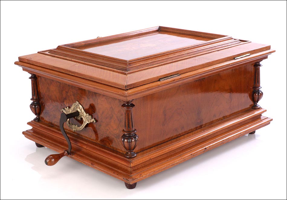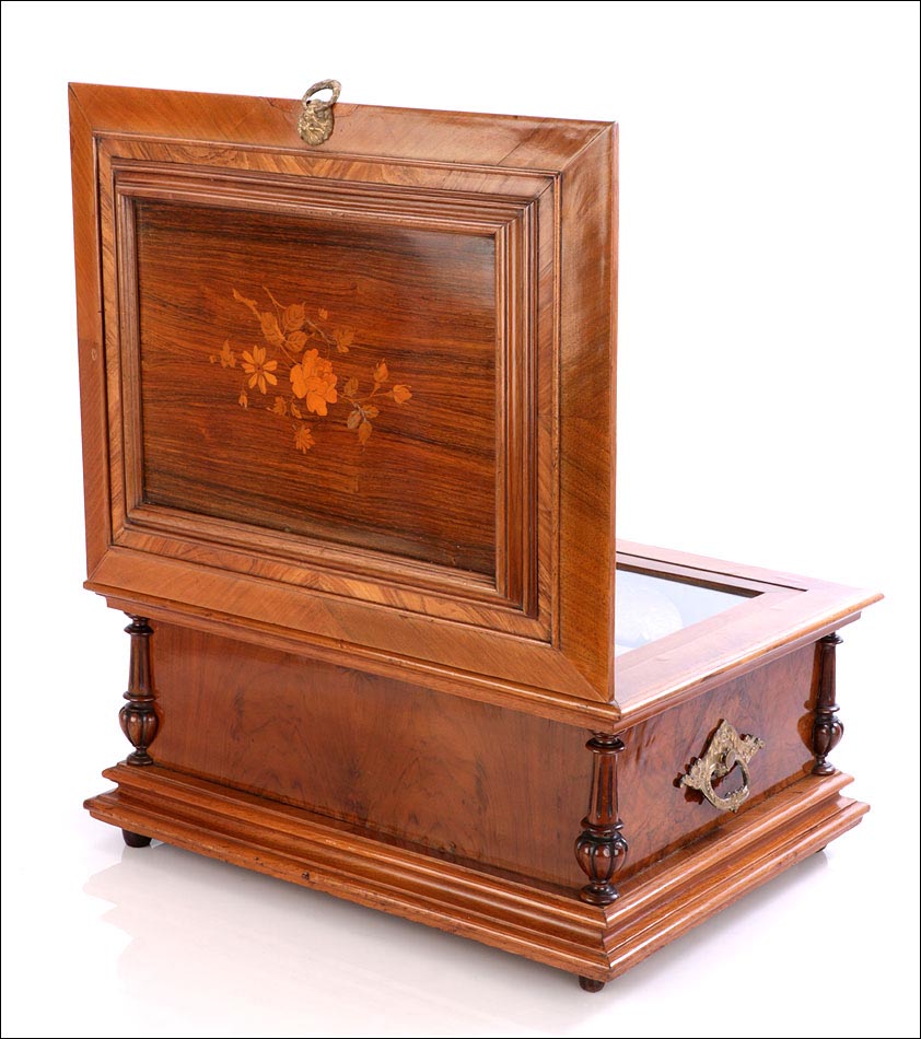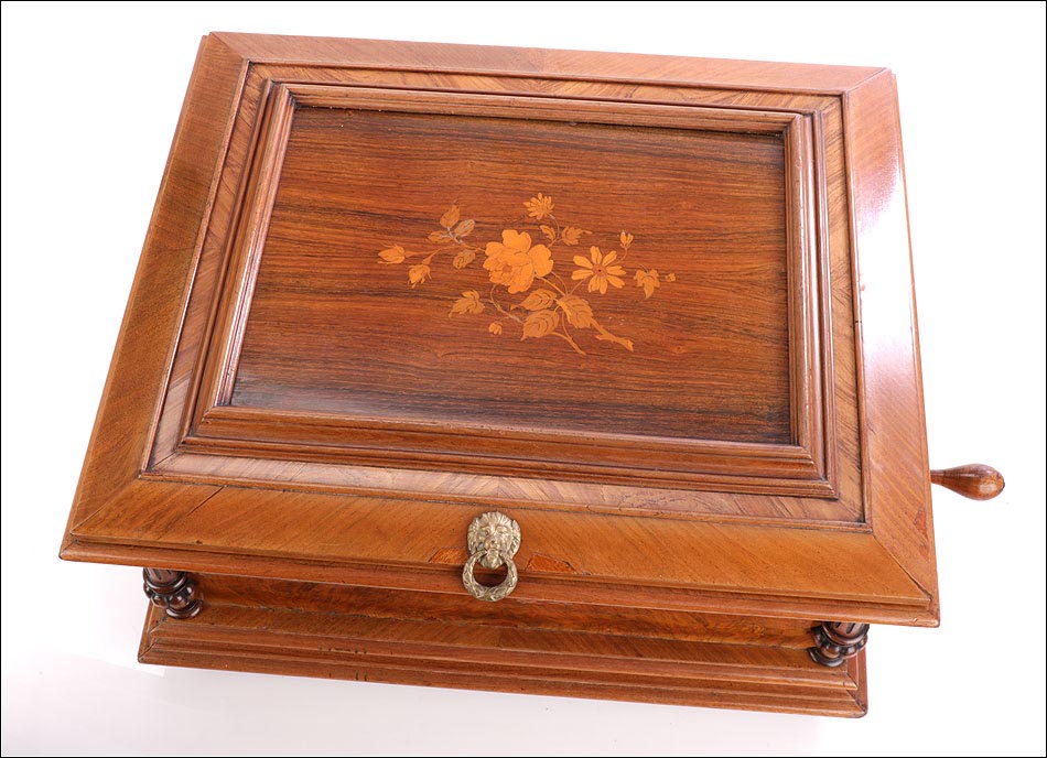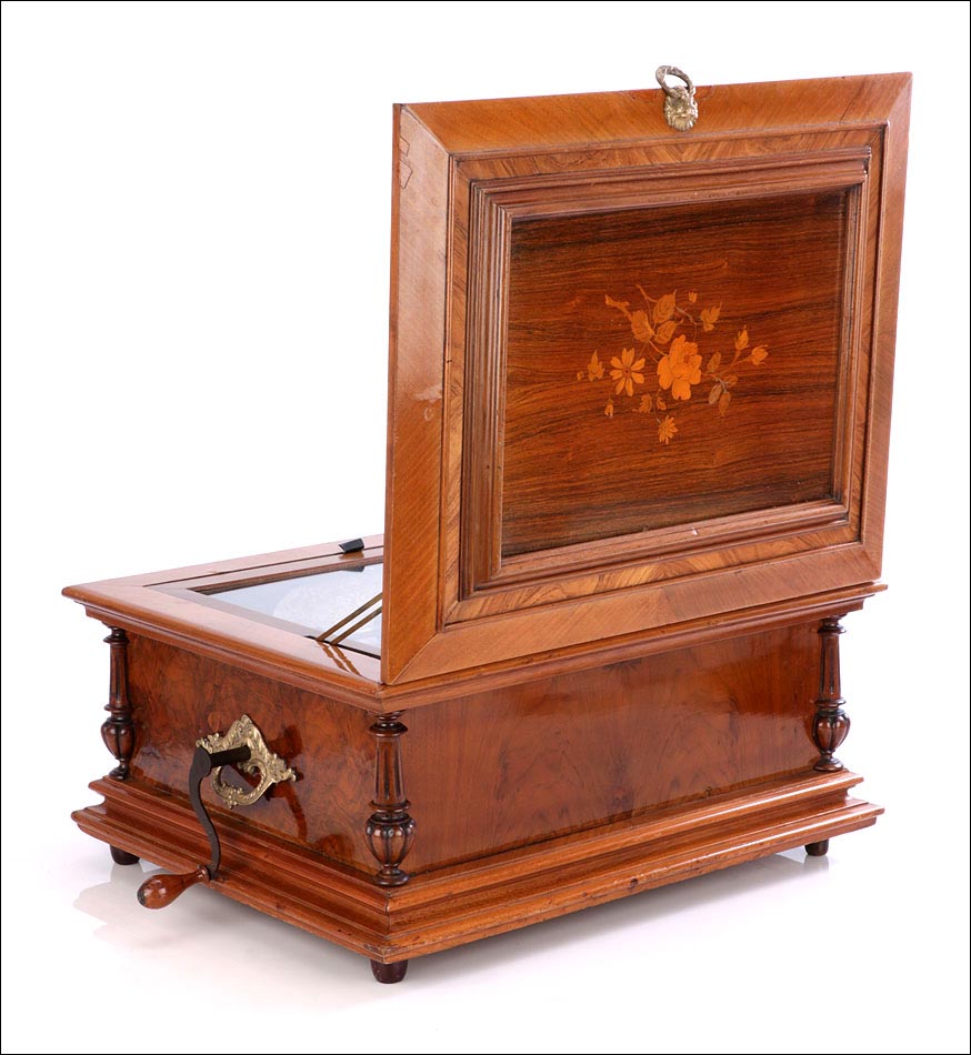 El encanto del sonido de finales del siglo XIX se suma al precioso diseño de esta antigua caja de música de gran tamaño, conformando una pieza de primera calidad y magnífico estilo.