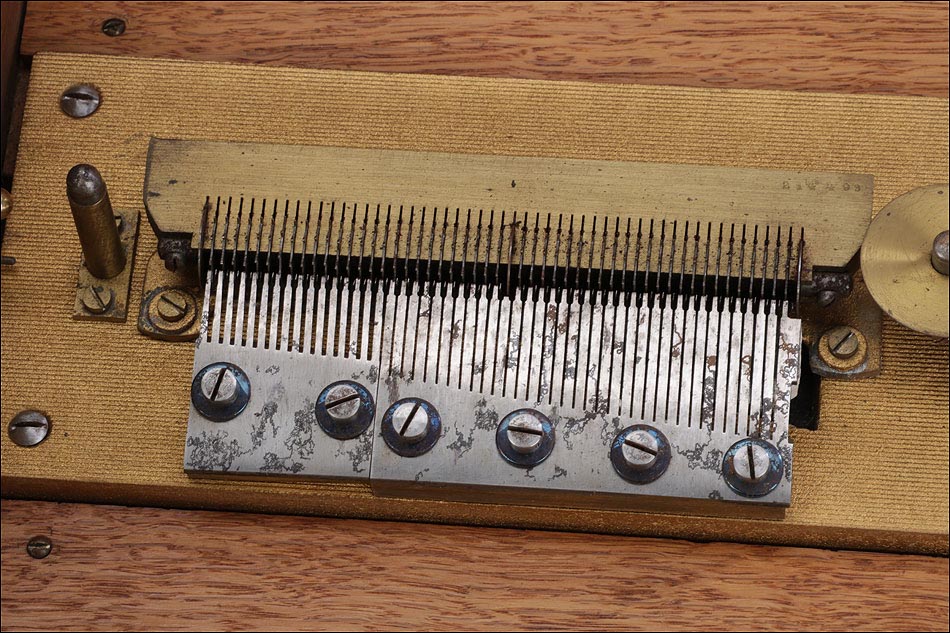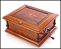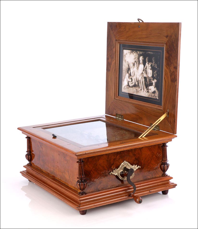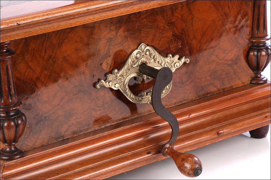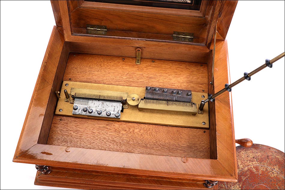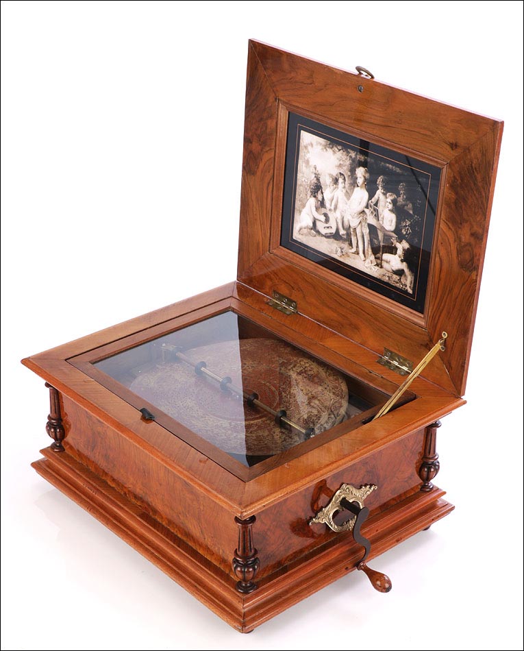 El encanto del sonido de finales del siglo XIX se suma al precioso diseño de esta antigua caja de música de gran tamaño, conformando una pieza de primera calidad y magnífico estilo.