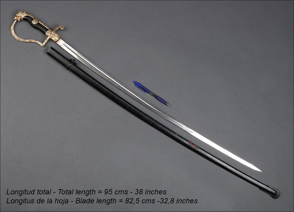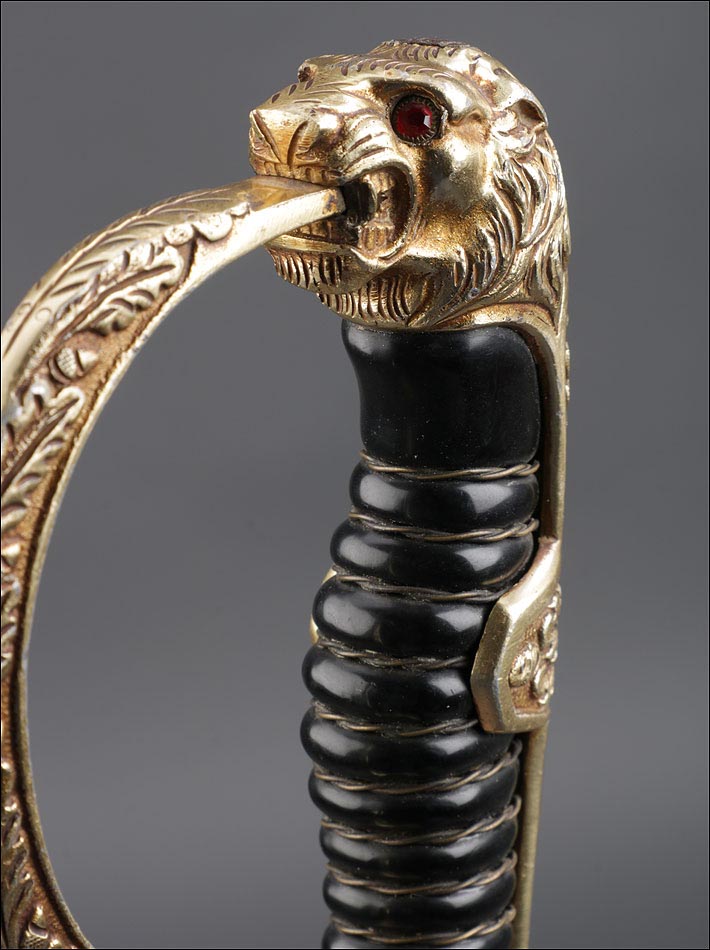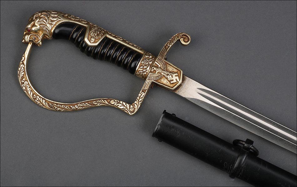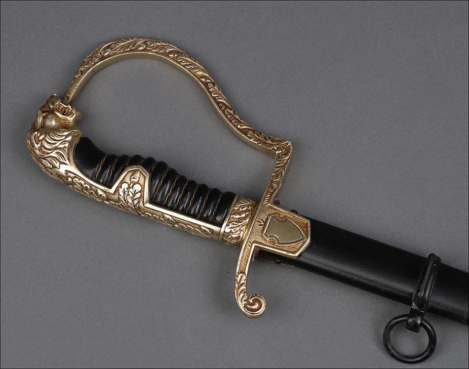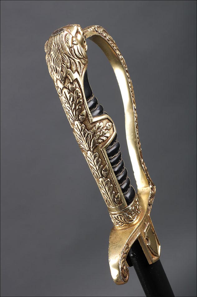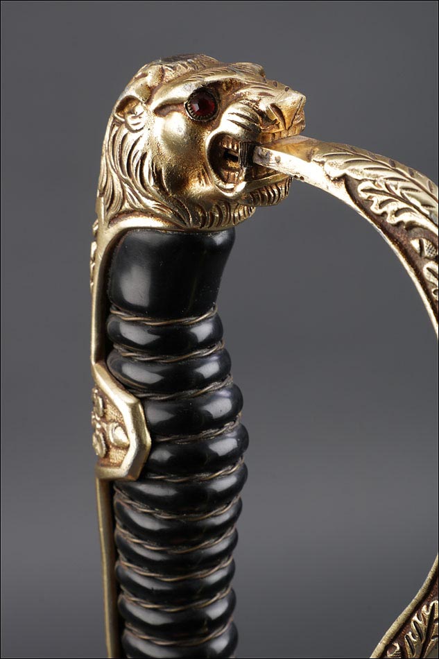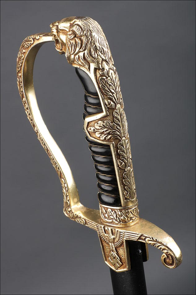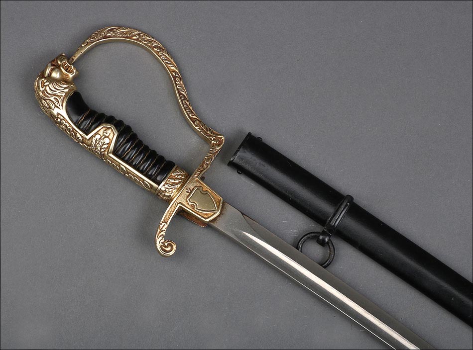 Antigua espada de gala de suboficial de infantería alemán nazi, fabricada en Alemania que conserva su estética de época. La espada se encuentra en muy buen estado de conservación; el único signo de desgaste es un pequeño rastro de óxido en la parte inferior de la vaina, que apenas interfiere en la belleza estética de la pieza. La empuñadura lleva guardamano de latón grabado y puño de madera ebonizada, en perfecto estado y con el torzal completo. Por una de sus caras la cruz muestra un escudo sin grabar, mientras que en la otra podemos ver el águila nazi posada sobre la esvástica. De la cruz sale el guardamano labrado, que termina en un pomo con forma de cabeza de un león. El animal tiene ojos de cristal rojo, originales de época, y atrapa el extremo del guardamano con la boca. El refuerzo de latón que cubre el dorso del puño está decorado con un motivo de hojas grabadas en el metal.