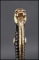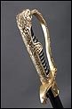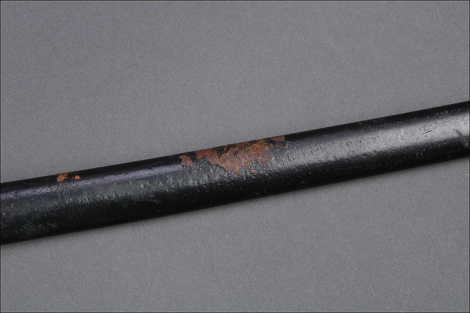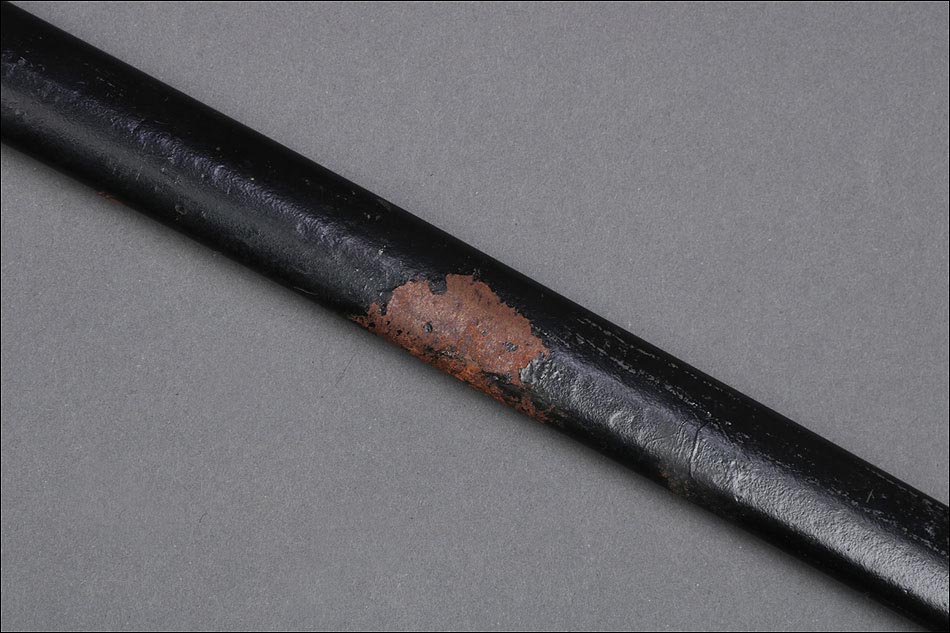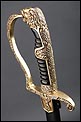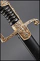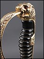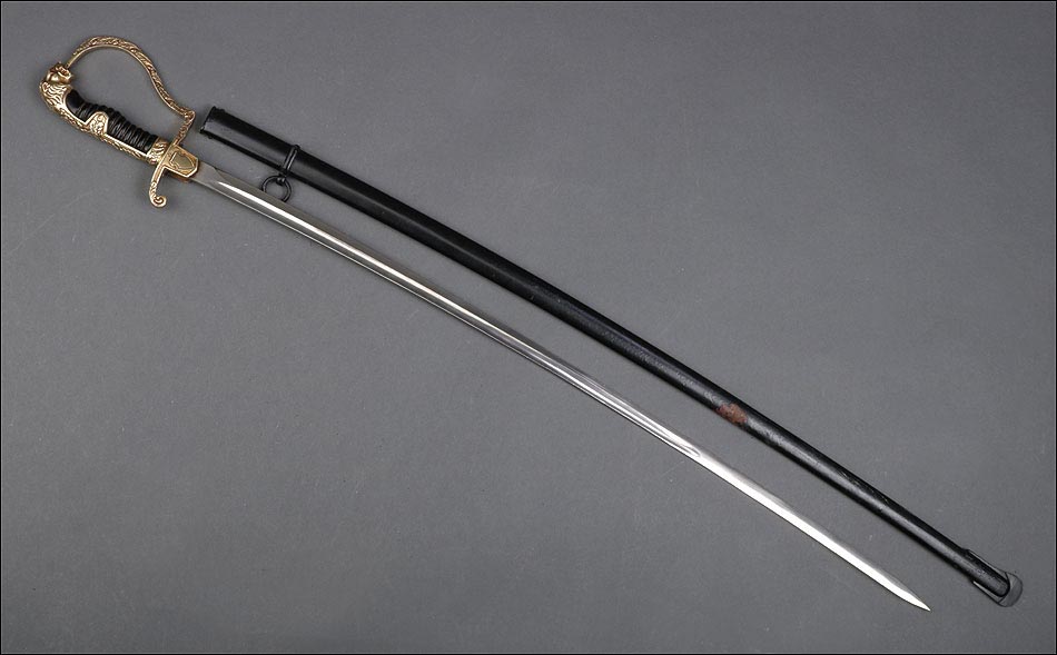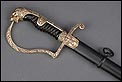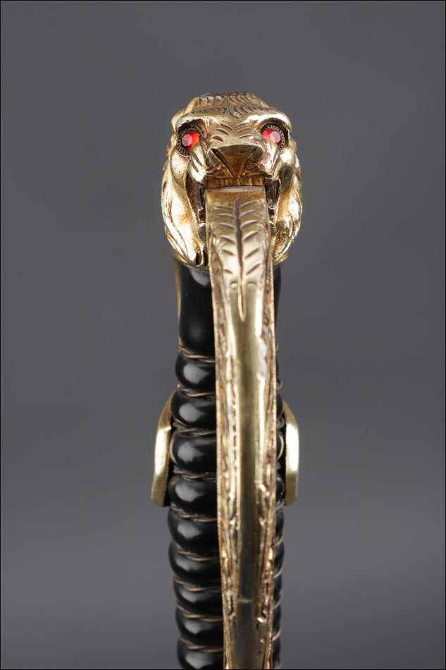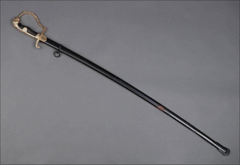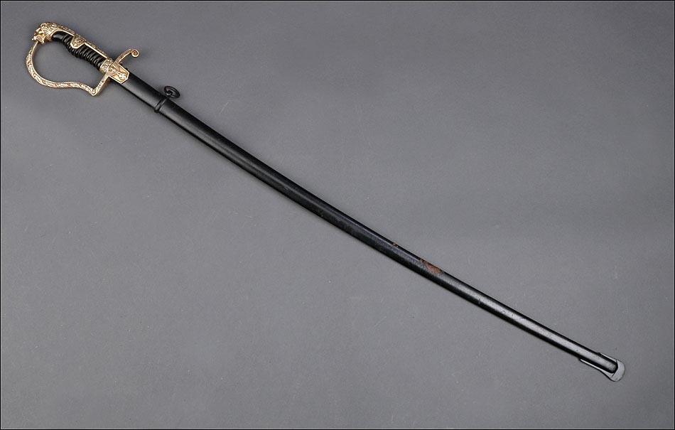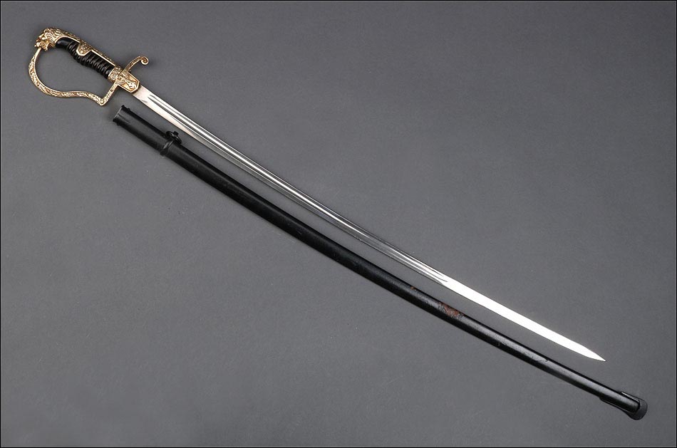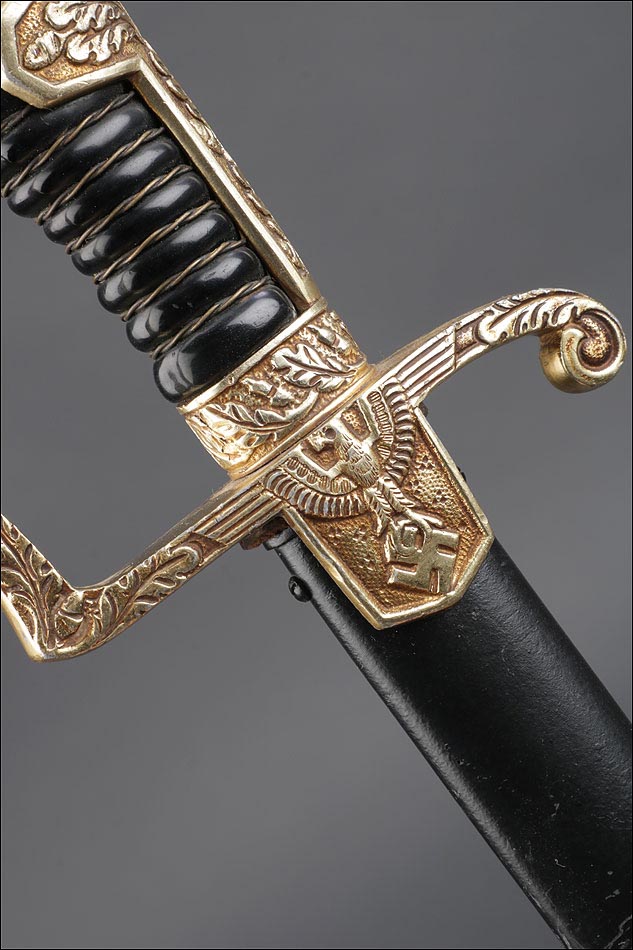 Antigua espada de gala de suboficial de infantería alemán nazi, fabricada en Alemania que conserva su estética de época. La espada se encuentra en muy buen estado de conservación; el único signo de desgaste es un pequeño rastro de óxido en la parte inferior de la vaina, que apenas interfiere en la belleza estética de la pieza. La empuñadura lleva guardamano de latón grabado y puño de madera ebonizada, en perfecto estado y con el torzal completo. Por una de sus caras la cruz muestra un escudo sin grabar, mientras que en la otra podemos ver el águila nazi posada sobre la esvástica. De la cruz sale el guardamano labrado, que termina en un pomo con forma de cabeza de un león. El animal tiene ojos de cristal rojo, originales de época, y atrapa el extremo del guardamano con la boca. El refuerzo de latón que cubre el dorso del puño está decorado con un motivo de hojas grabadas en el metal.