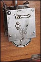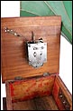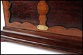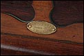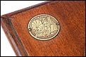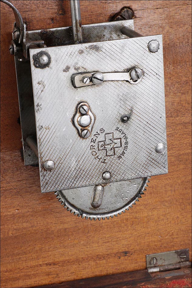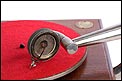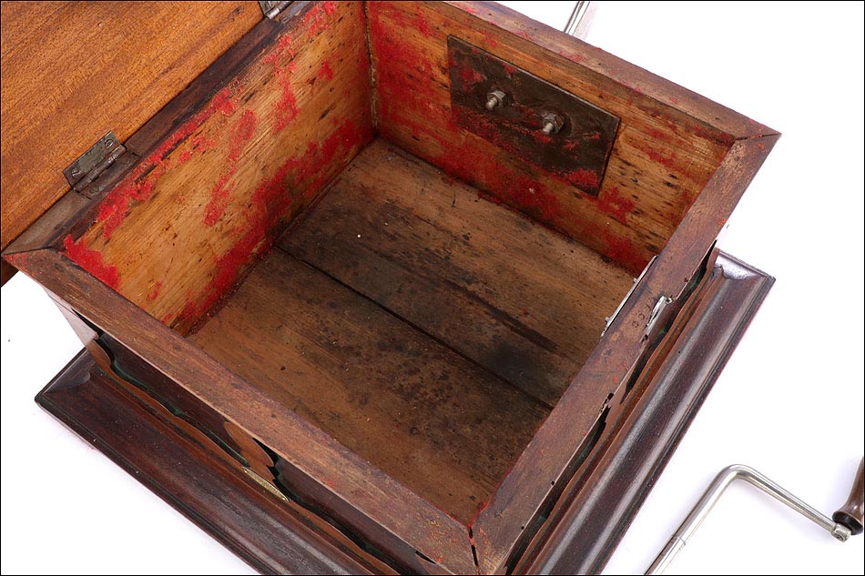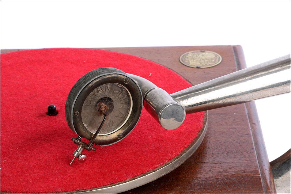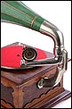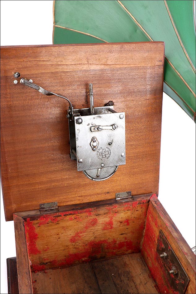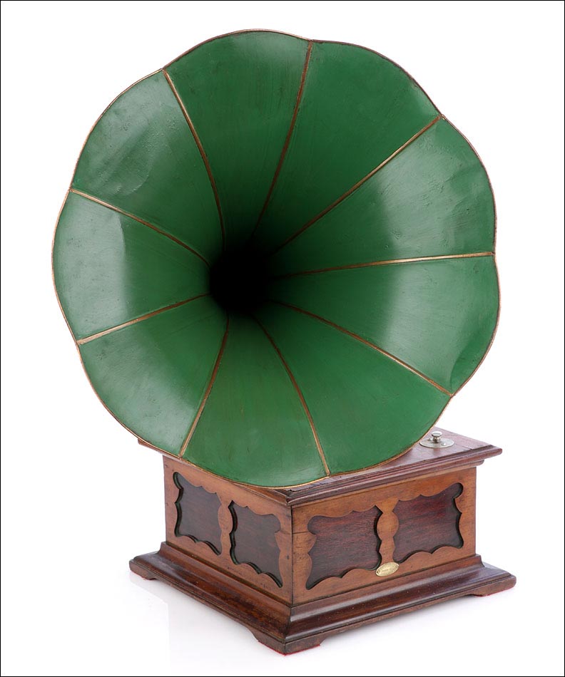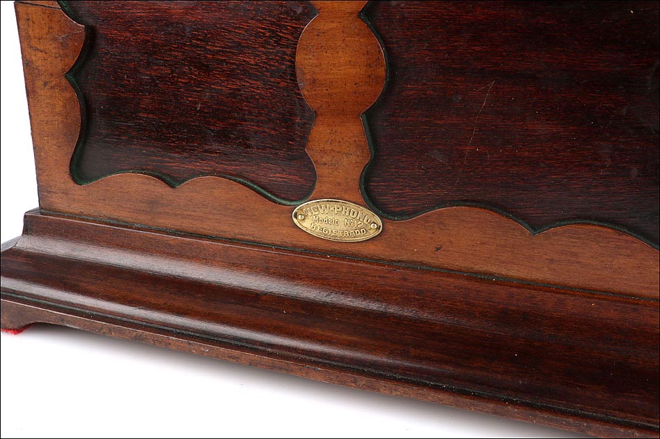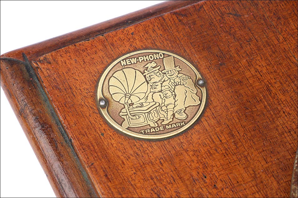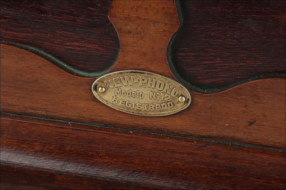 La caja está en muy buen estado; la madera lleva un elegante barniz satinado que la protege y embellece. En uno de los laterales podemos ver una placa de latón de forma ovalada con la inscripción NEW PHONO – Modelo Nº 12 – REGISTRADO. Por otro lado, en la tapa superior y junto al plato para los discos hay otra placa con el nombre de la marca NEW PHONO y un curioso logotipo que representa a una familia (padre, madre e hijo) escuchando un gramófono. El codo de metal plateado, conectado a la caja mediante un brazo del mismo metal, lleva un reproductor GRAMOLINA y sostiene también la impresionante trompeta. Esta pieza va esmaltada en verde esmeralda con los nervios pintados en dorado, una combinación muy atractiva que evoca un lujo aristocrático.