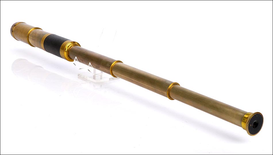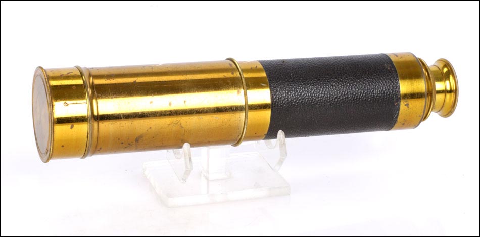 Espectacular catalejo antiguo de gran tamaño (81 cm de longitud) con parasol original, magníficamente conservado y fechado en el siglo XIX. El catalejo se encuentra en un estado de conservación realmente impresionante; además, la óptica está en buenas condiciones y permite disfrutar de una visión clara y nítida de los objetos y paisajes situados en la lejanía. Este artículo cuenta con un fuerte potencial decorativo por su hermoso y sencillo diseño y su antigüedad (más de 120 años). Consta de cuatro cuerpos y va acompañado de un parasol de latón, perfecto para utilizar el catalejo sin miedo a los deslumbramientos. El latón del que está fabricado conserva la laca protectora transparente original de época, que le aporta el tono cálido y patinado característico de las piezas antiguas. El cuerpo principal conserva el forro de piel oscura original, también en excelentes condiciones.