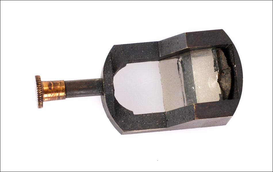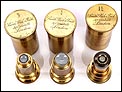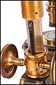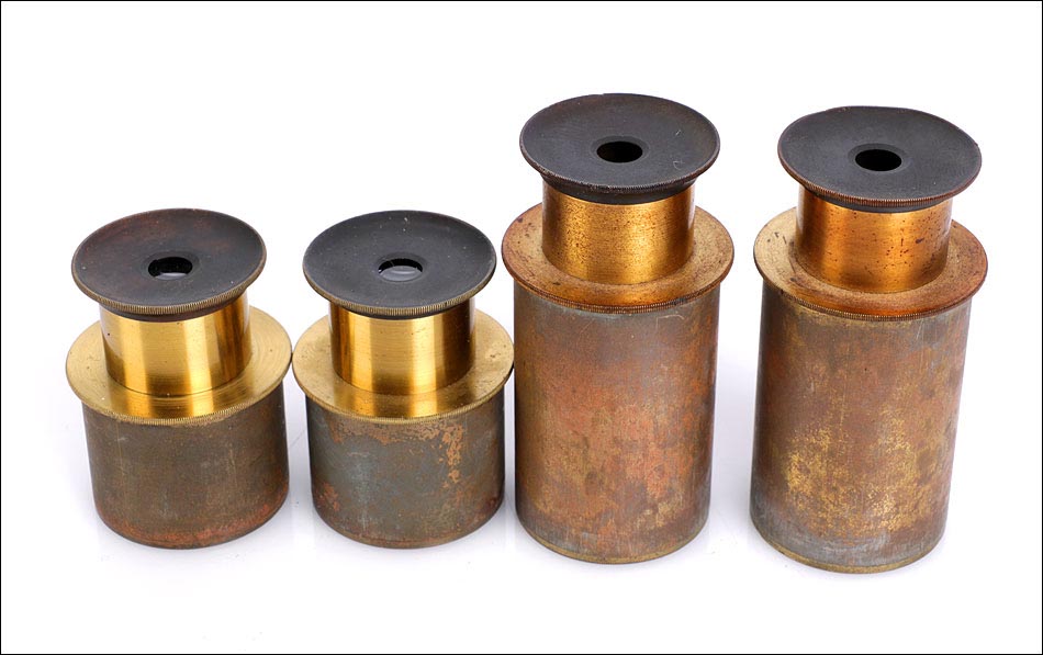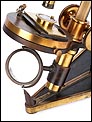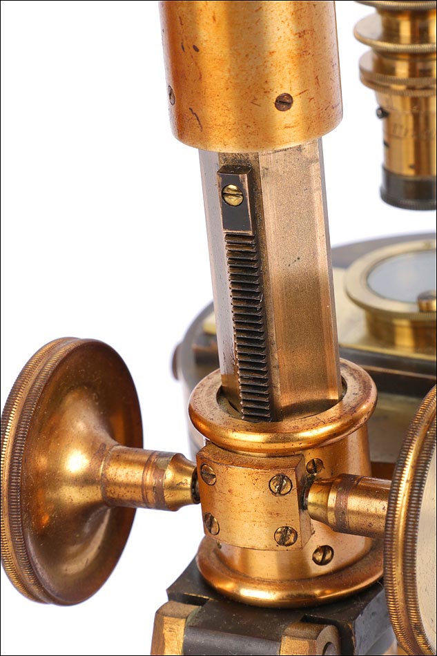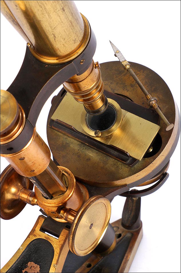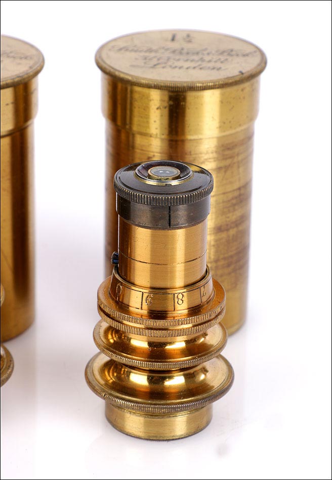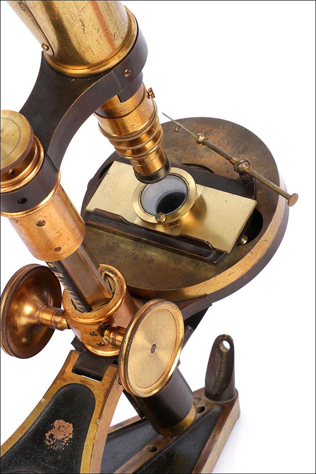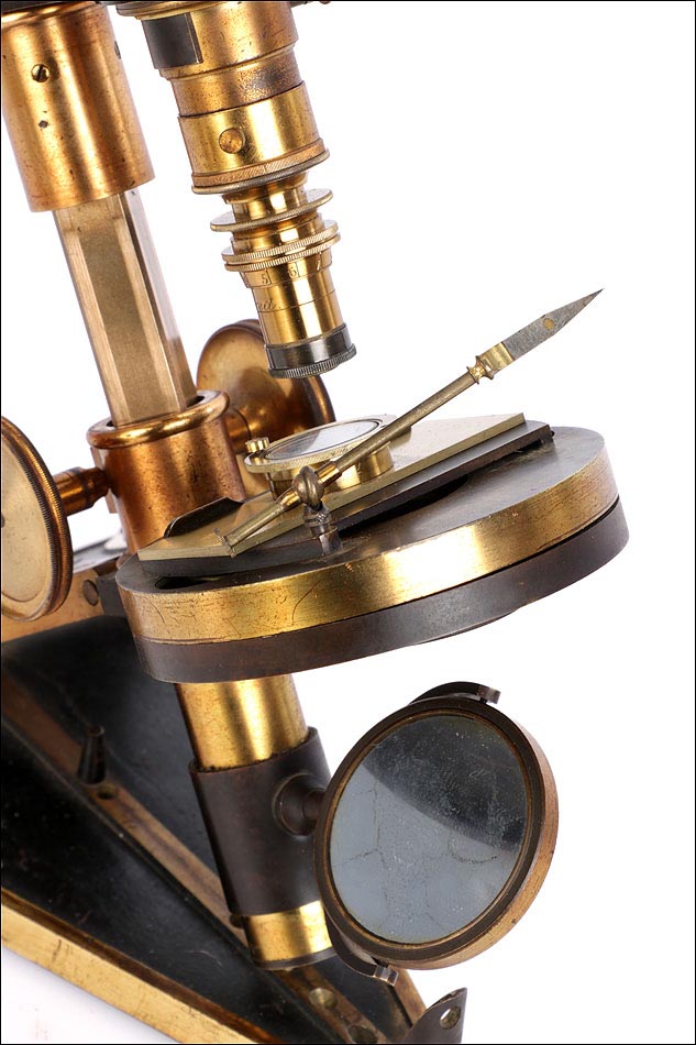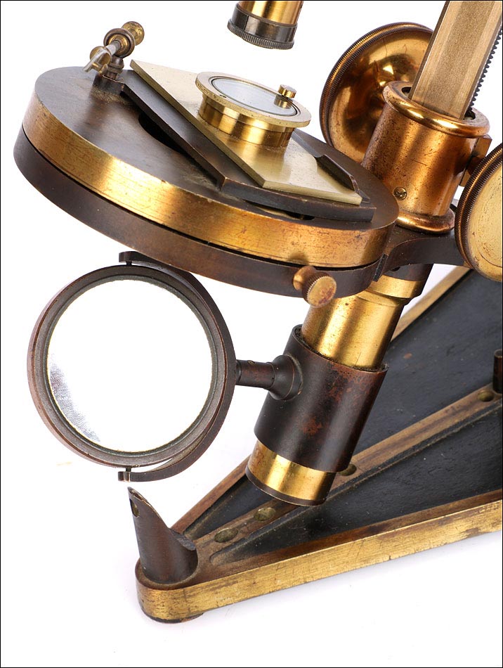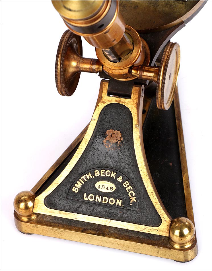 El microscopio tiene un diseño muy atractivo y original. La base triangular combina latón con esmalte negro, creando un juego de tonos muy interesante. En ella podemos ver el nombre de la empresa grabado en el metal, SMITH, BECK & BECK – LONDON, acompañado del número de serie 4548. En lo que respecta a los accesorios, las lentes van protegidas en sus fundas de latón. Las fundas llevan el nombre y la dirección del fabricante grabado en las tapas en hermosa letra cursiva. Además, el set incluye una live box (para observar especímenes vivos) y unas pinzas para manipular muestras. Todo el conjunto se guarda en un espléndido maletín de madera de caoba maciza, original de época y con asa de latón.