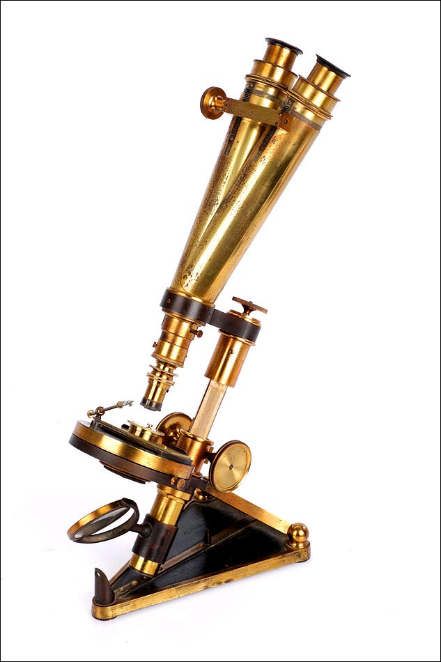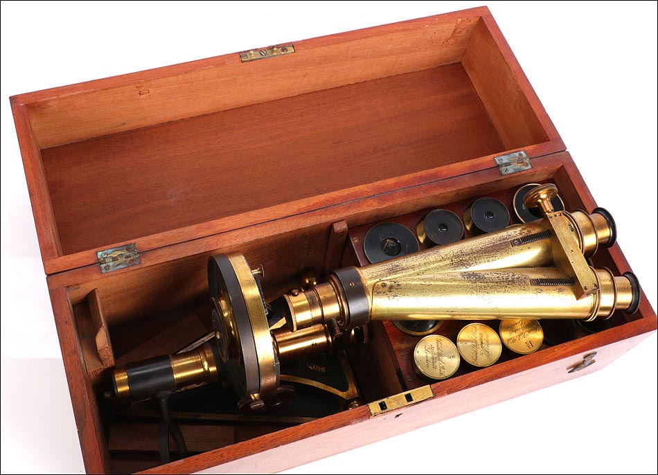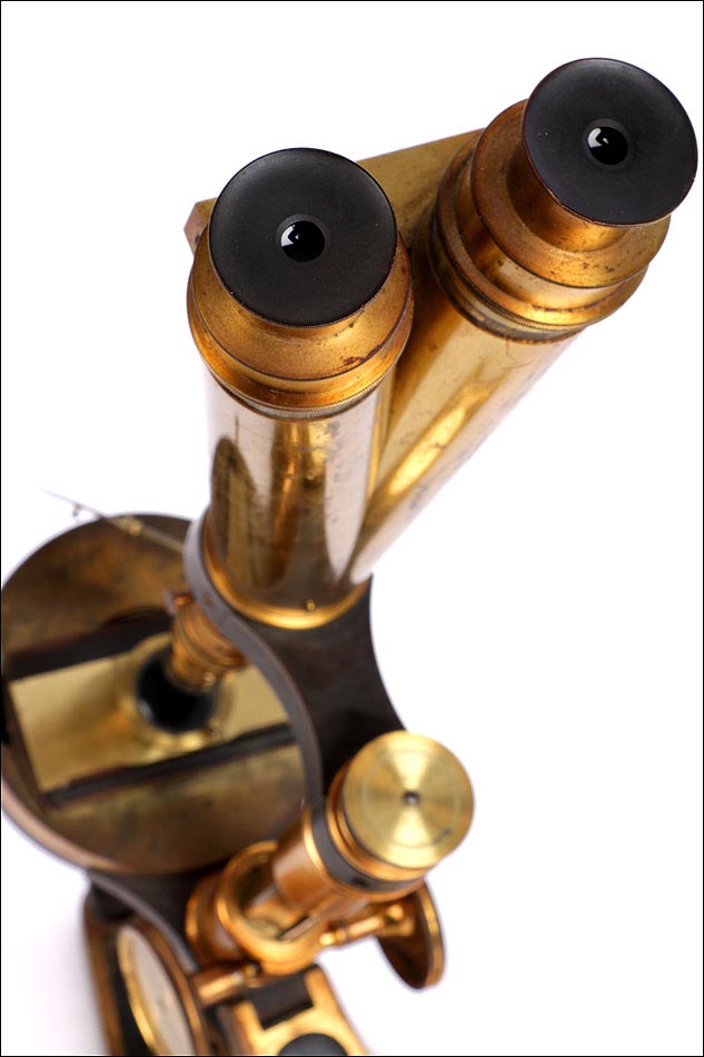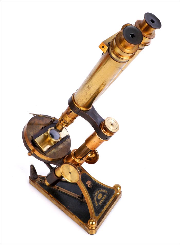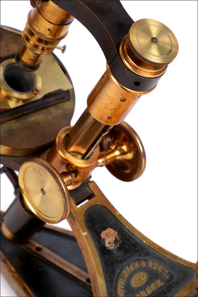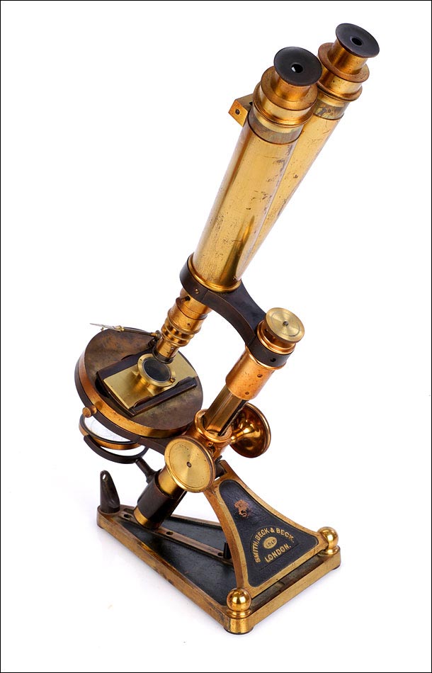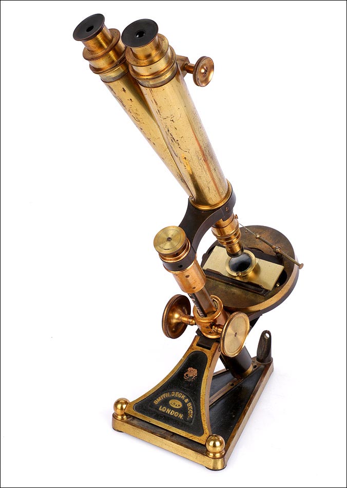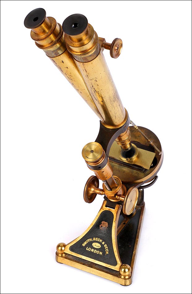 De hermoso diseño y con más de ciento veinte años a sus espaldas, este antiguo microscopio binocular Smith, Beck & Beck es una auténtica pieza de museo.