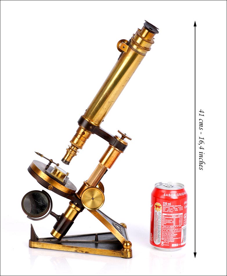 Fantástico y antiguo microscopio binocular Smith, Beck & Beck fabricado en Inglaterra circa 1880. Este artículo está en buenas condiciones y está realmente muy completo: se presenta en su estuche original de madera maciza, acompañado de un set de accesorios profesionales de época. El microscopio funciona perfectamente y está bien conservado. El latón se encuentra algo desgastado por el paso del tiempo y el uso, pero todavía mantiene parte de la laca protectora transparente original y muestra una atractiva pátina, que le aporta personalidad. El set de accesorios incluye dos juegos de oculares y tres objetivos, uno de ellos muy raro.