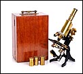 El microscopio lleva pie de hierro fundido esmaltado en negro; su parte superior está formada por piezas de latón en muy buenas condiciones, con la laca protectora original de época que aporta al metal un bello y cálido tono. En la parte posterior del pie podemos ver el nombre de la firma, J. SWIFT & SON - LONDON, grabado en el metal. Este nombre aparece también en los objetivos y la pletina. Por su parte, el estuche es una preciosa caja de madera de caoba rubia maciza también en muy buen estado. Lleva uniones artesanales en cola de milano, sólidas y delicadas, y conserva el asa de latón para su transporte.