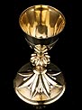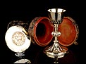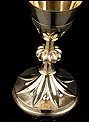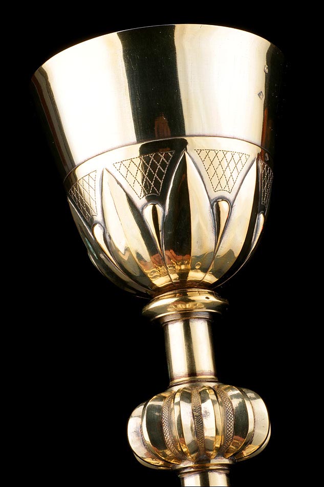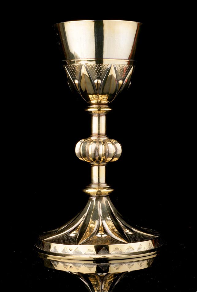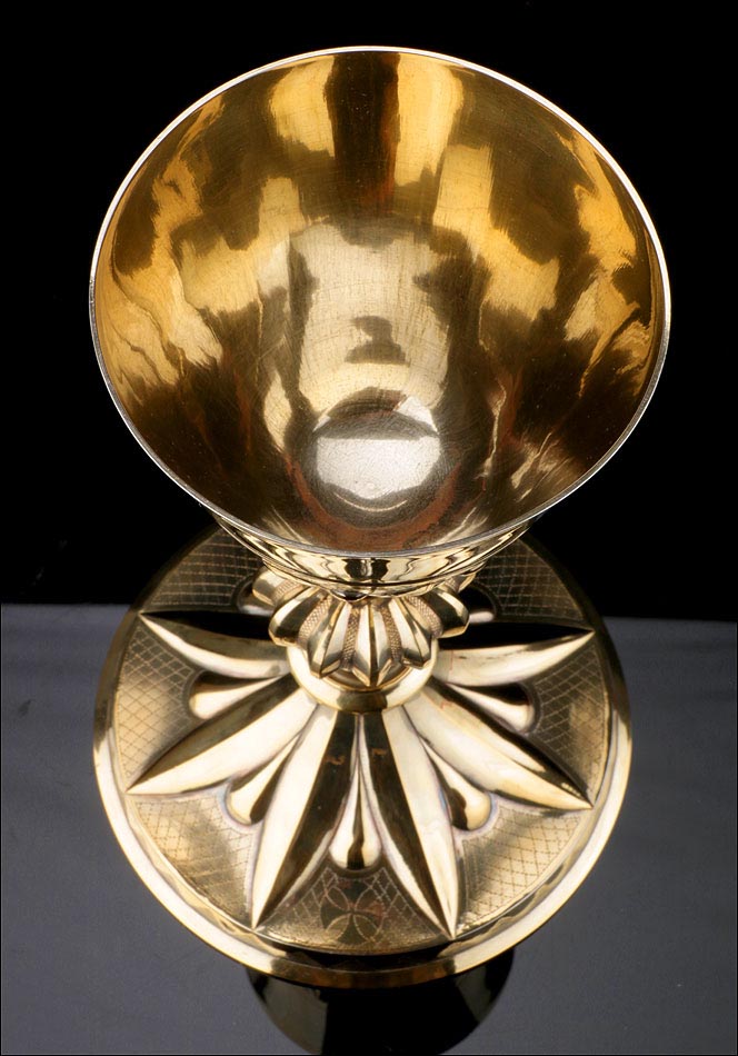 Este sobrio y antiguo cáliz con patena de plata maciza dorada es una pieza muy especial, tan hermosa como elegante.
