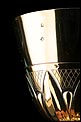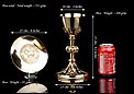Medidas: Cáliz: Ancho de la Base: 14 cm. Ancho de la Copa: 10 cm. Altura: 23 cm. Peso: 440 g. Patena: Diámetro: 15 cm. Peso: 93 g. Peso Total: 533 g.