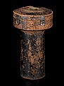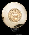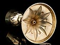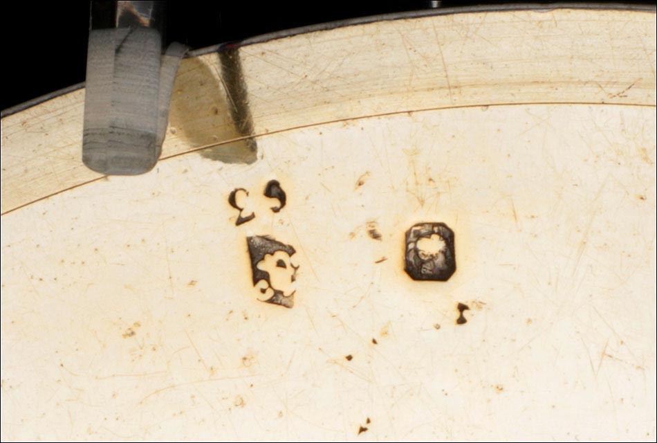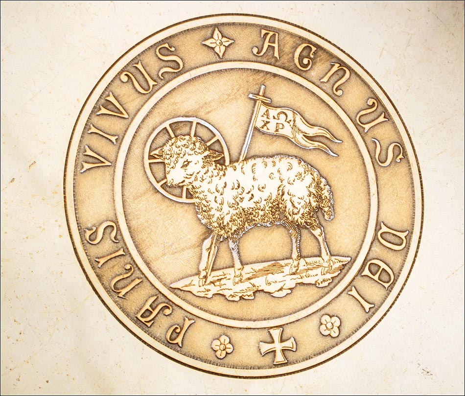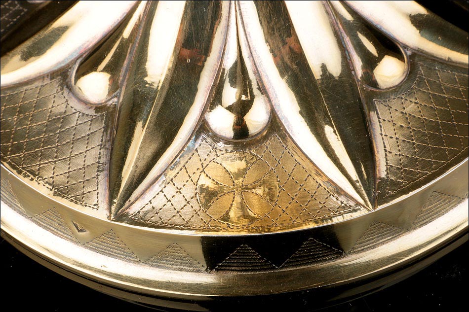 Las distintas partes del cáliz están marcadas con contrastes. Podemos ver dos marcas: la de la plata francesa antigua (el perfil de la diosa Minerva) y el contraste del platero, un ánfora flanqueada por las iniciales TE. En la base también distinguimos el número 63. Por su parte, la patena está decorada con un bello grabado representando al Agnus Dei (el Cordero de Dios, símbolo de Jesucristo), rodeado de la inscripción latina PANIS VIVUS AGNUS DEI. El estuche de guardado está algo desgastado por el paso del tiempo, pero aún cumple perfectamente su función protectora.