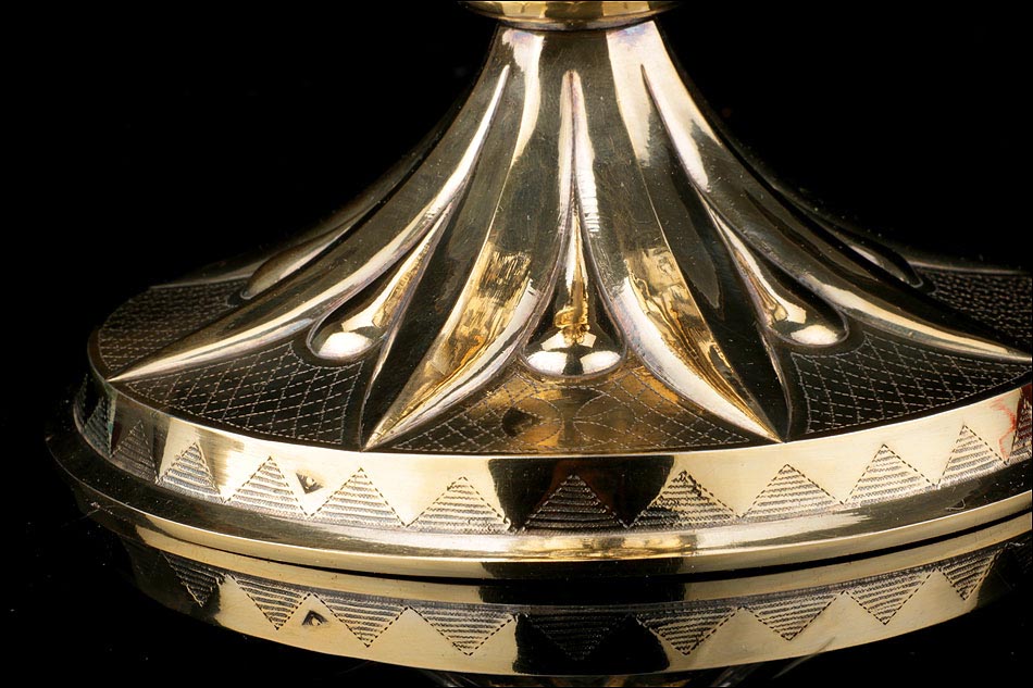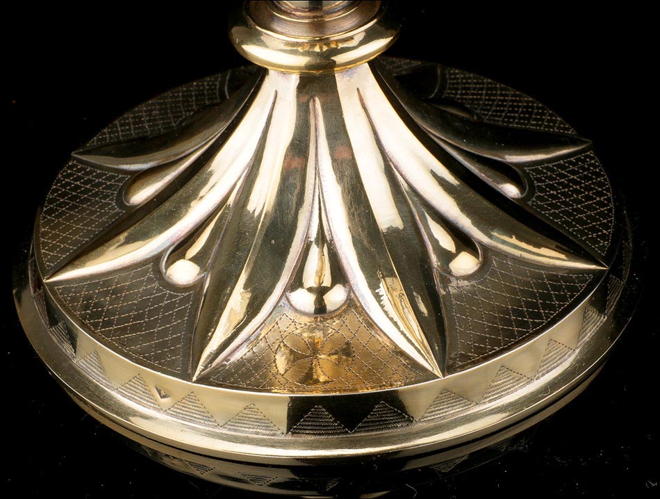 El cáliz muestra un diseño de estilo neogótico, característico de la época (principios del siglo XX). La base es amplia y circular, con forma cónica y decoración de hojas lanceoladas en relieve. Las hojas parten del tallo y se extienden simétricamente por la base, creando un motivo de inspiración medieval. El resto de la base está decorada con una fina cuadrícula grabada; en la parte delantera podemos ver también una cruz griega dentro de un círculo. Sobre la base, el tallo liso está decorado con un nudo esférico separado en secciones, a modo de gajos. En la parte superior del cáliz, la copa repite el diseño de la base combinando hojas puntiagudas con una cenefa cuadriculada.