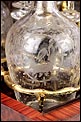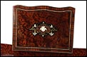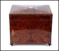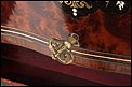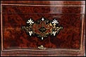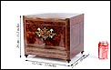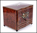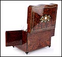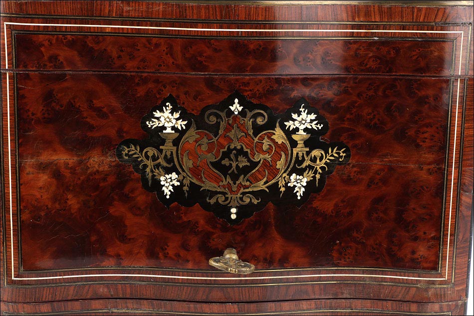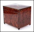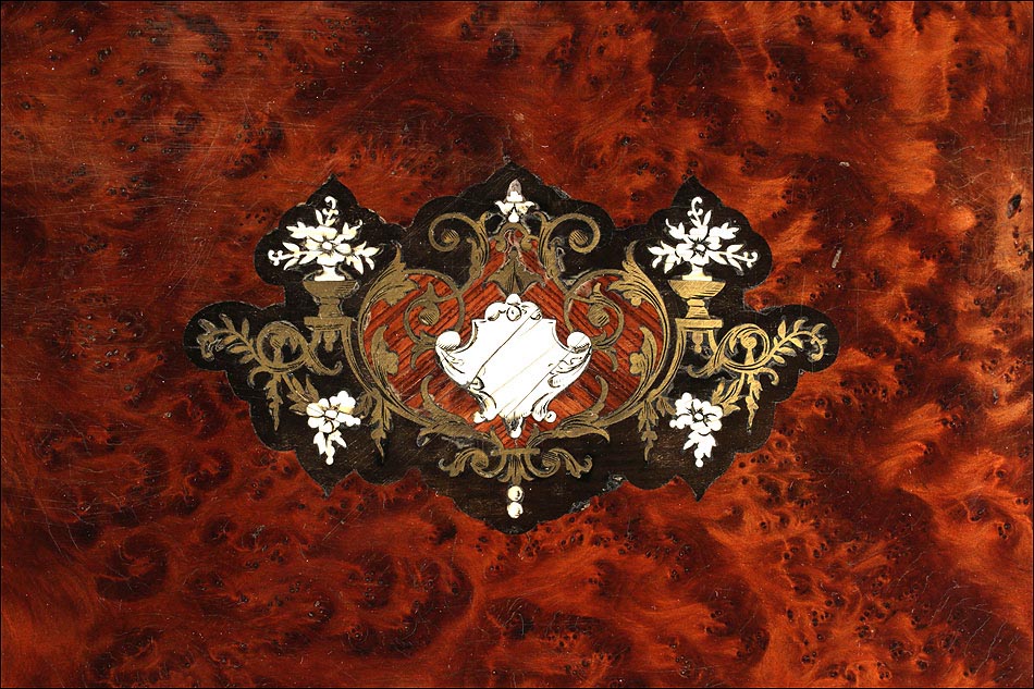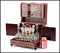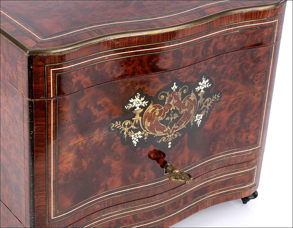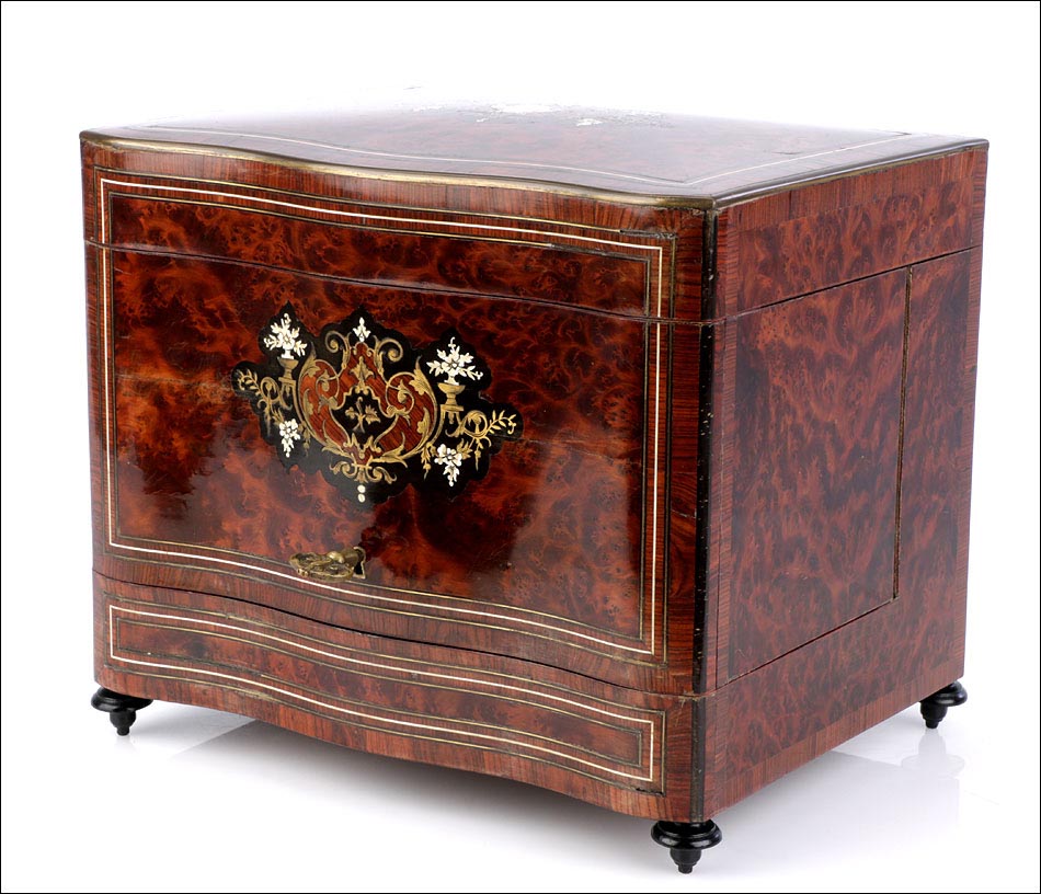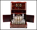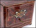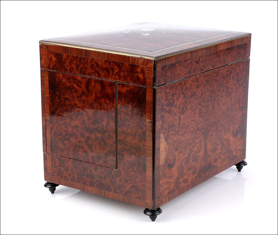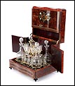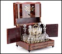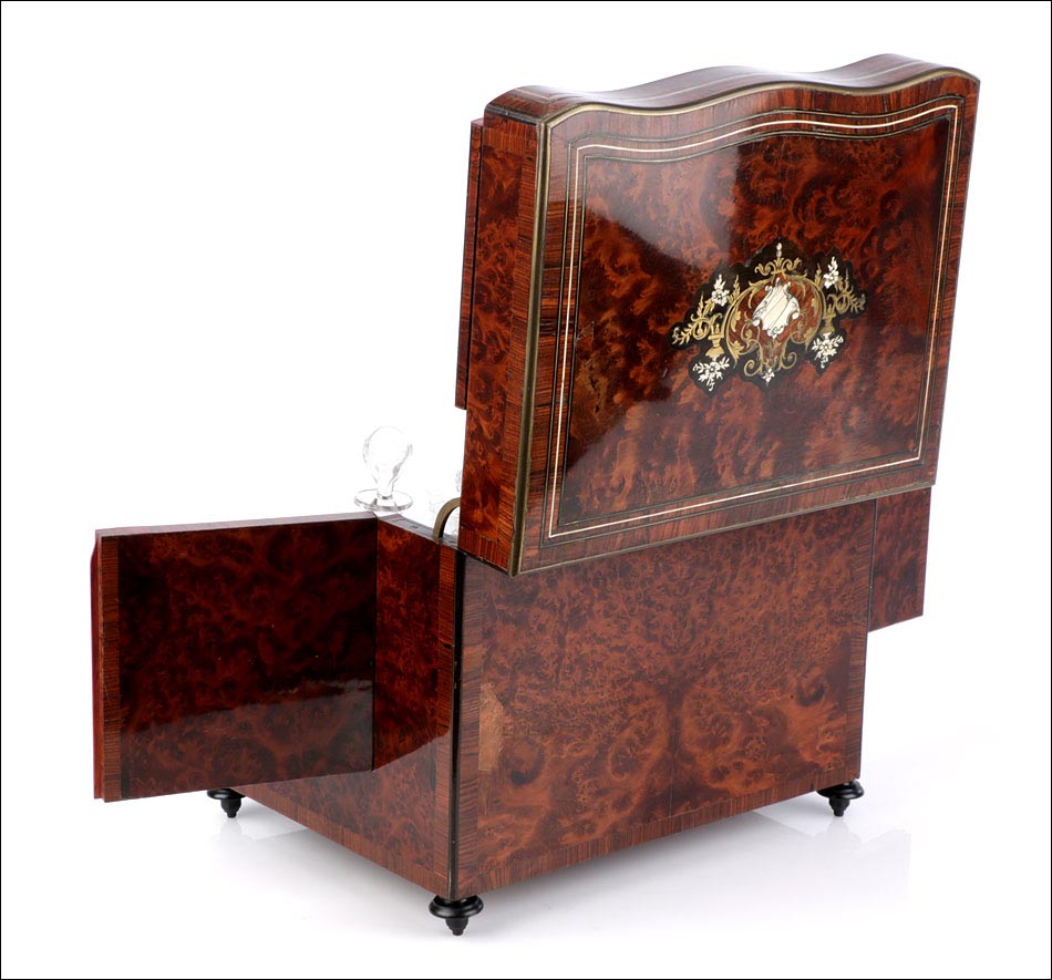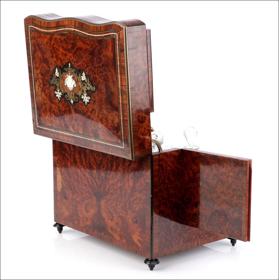 La licorera está totalmente revestida con chapa de raíz de caoba, una preciosa especie que crea caprichosos diseños y aguas al tiempo que conserva el cálido tono rojizo de la madera. En la tapa podemos ver un gran detalle de marquetería realizado a mano, un motivo simétrico de estilo pompeyano que combina distintos materiales: madera de ébano, hueso y latón. La marquetería está enmarcada por unos filos de los mismos materiales, creando un efecto de conjunto muy atractivo. Los filos se repiten en la parte inferior frontal de la licorera. Los laterales, trasera y puertas también están revestidos de madera de raíz, combinada con marcos de madera rojiza y finas vetas paralelas.