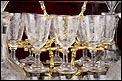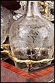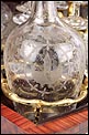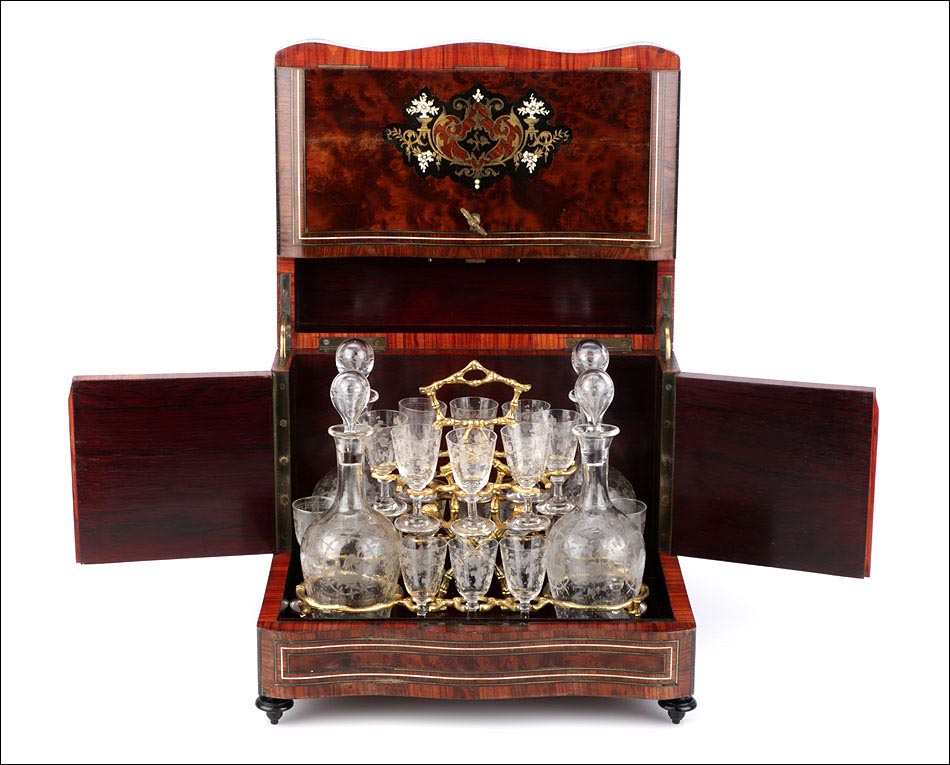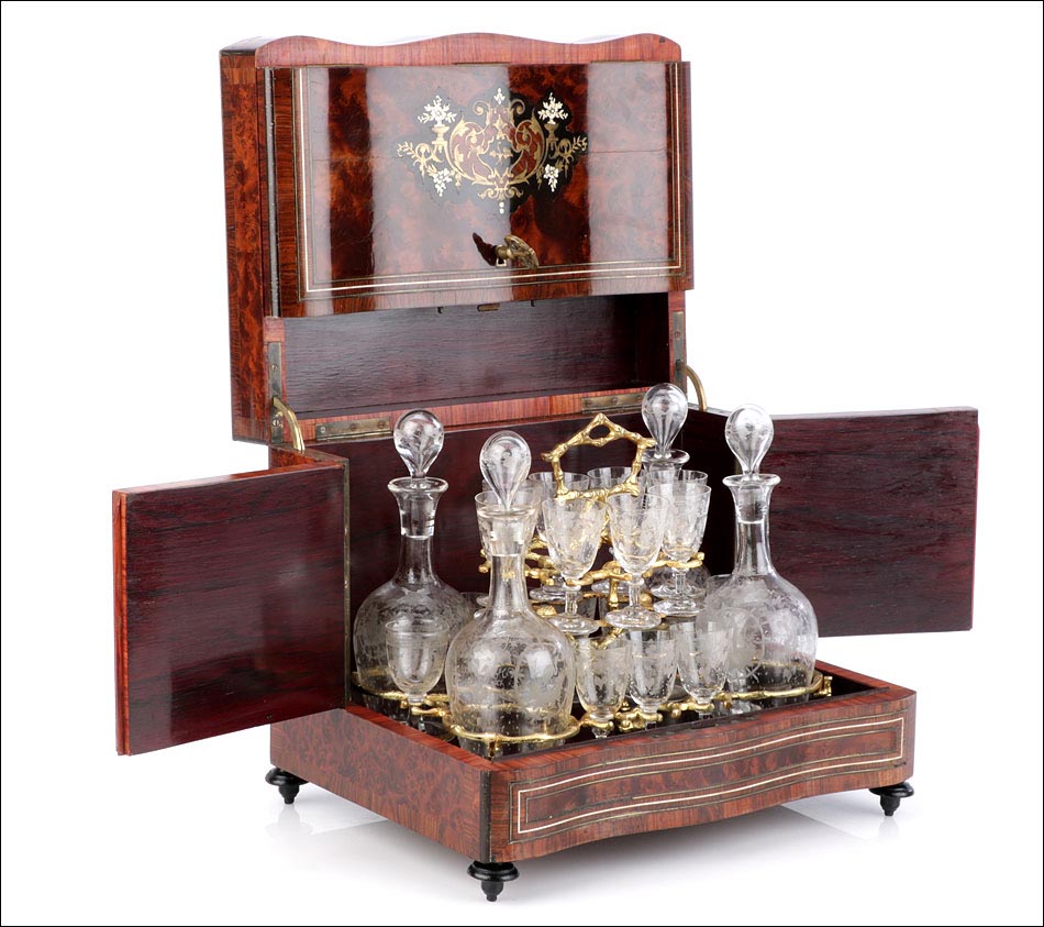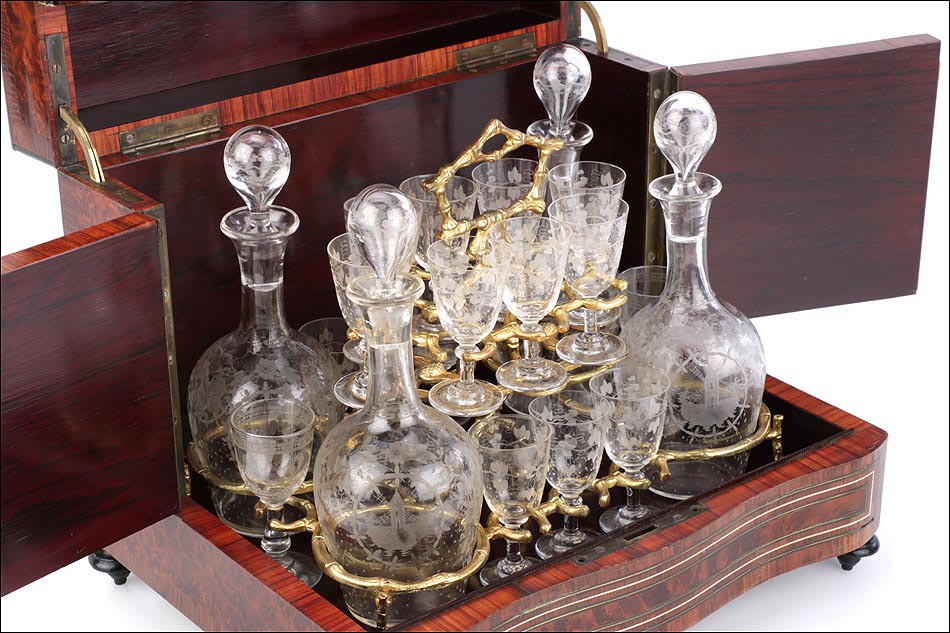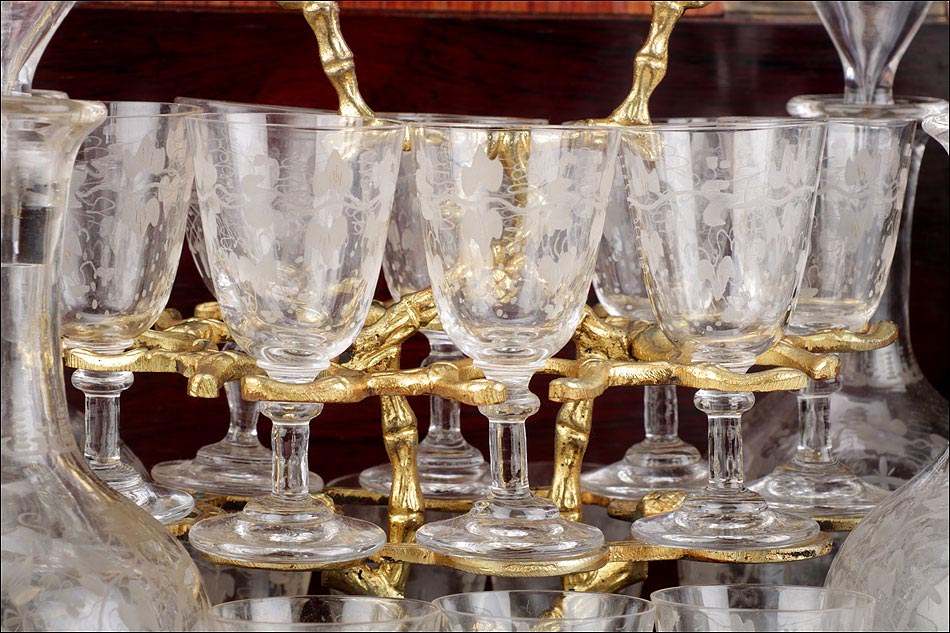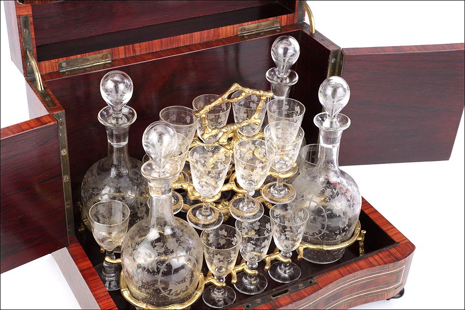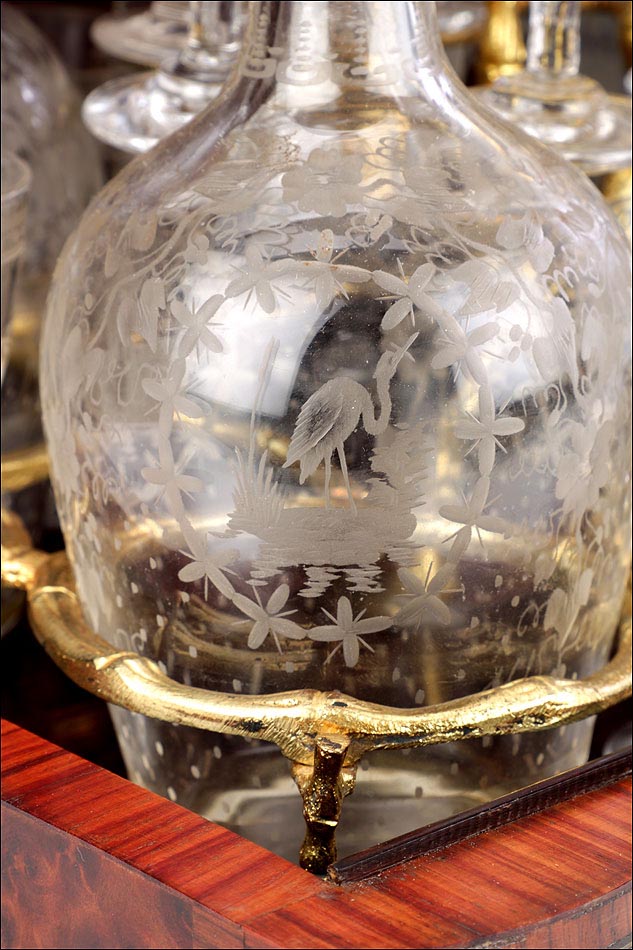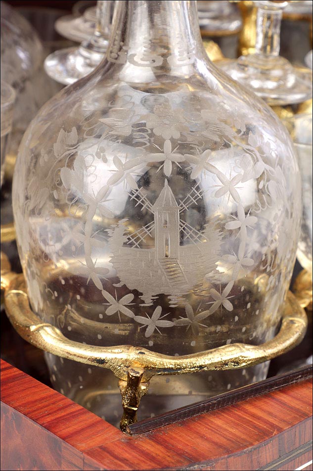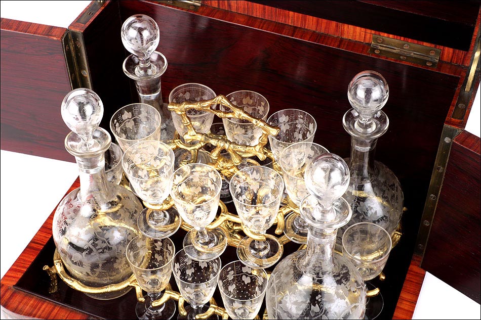 El conjunto del mueble está protegido por un barniz a muñequilla original de época, en buenas condiciones. El interior de la licorera es de madera de caoba oscura; sobre este fondo, la brillante cristalería destaca en sus soportes de latón. La cristalería está formada por un juego de dieciséis copas y cuatro botellas con tapón, íntegramente realizadas en cristal fino y decoradas con motivos campestres tallados a mano: molinos, aves, flores… El conjunto se puede guardar con seguridad gracias a la cerradura y la llave originales, ambas en perfecto funcionamiento.