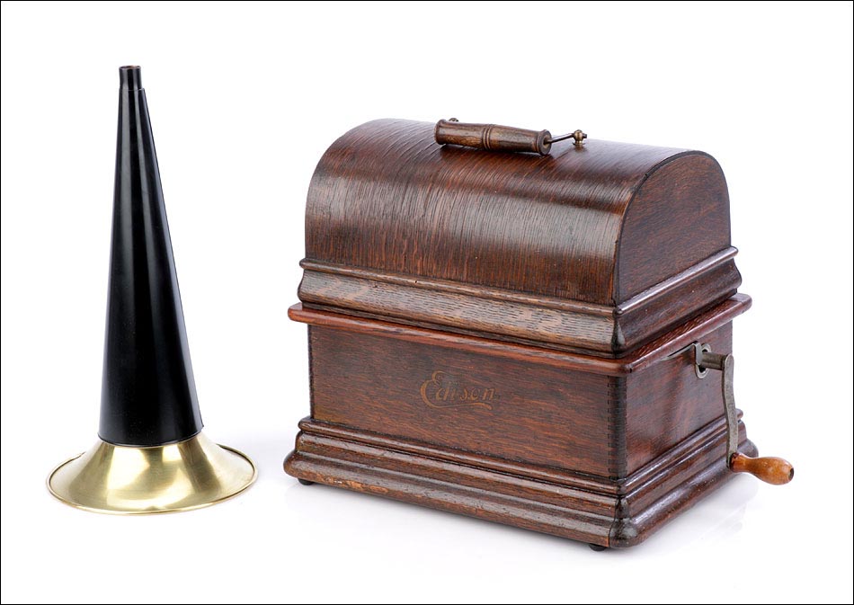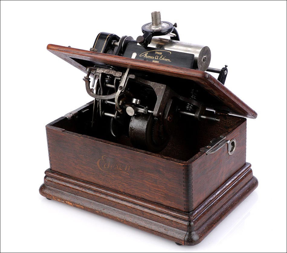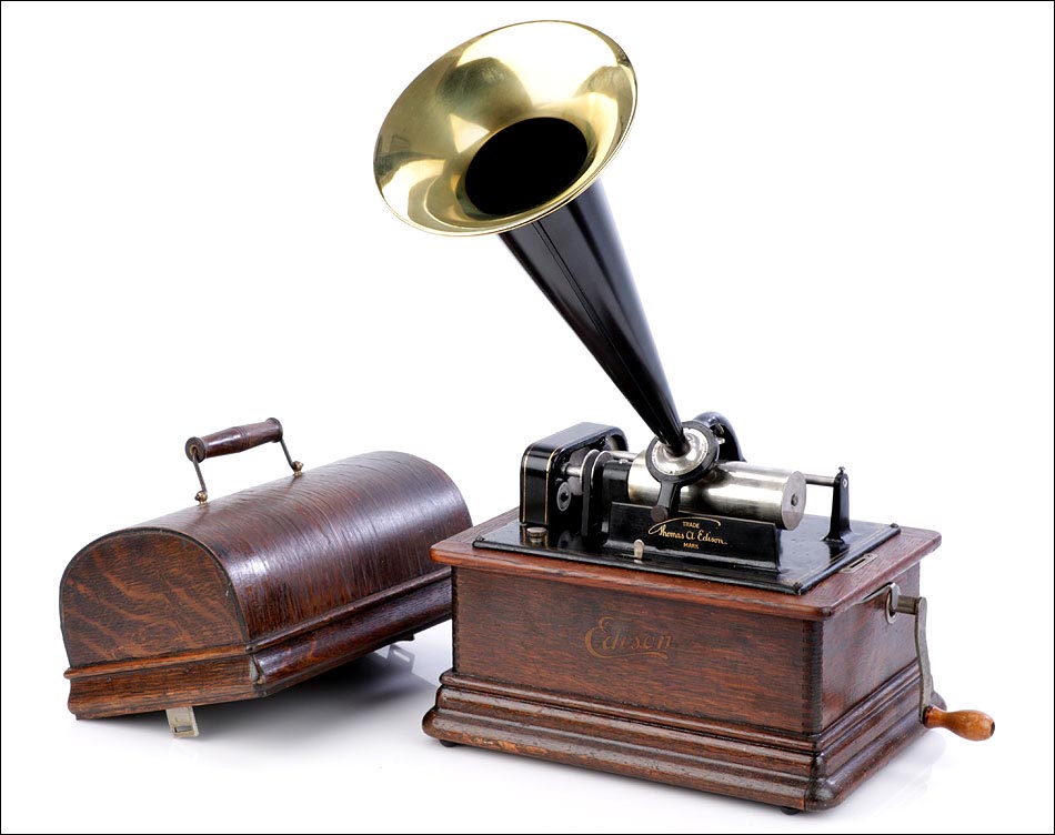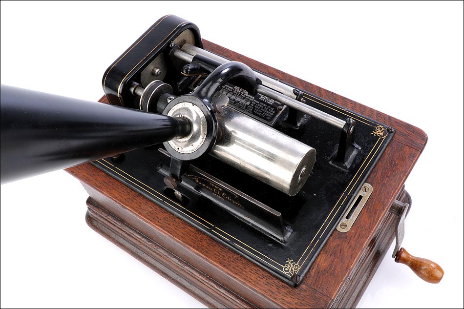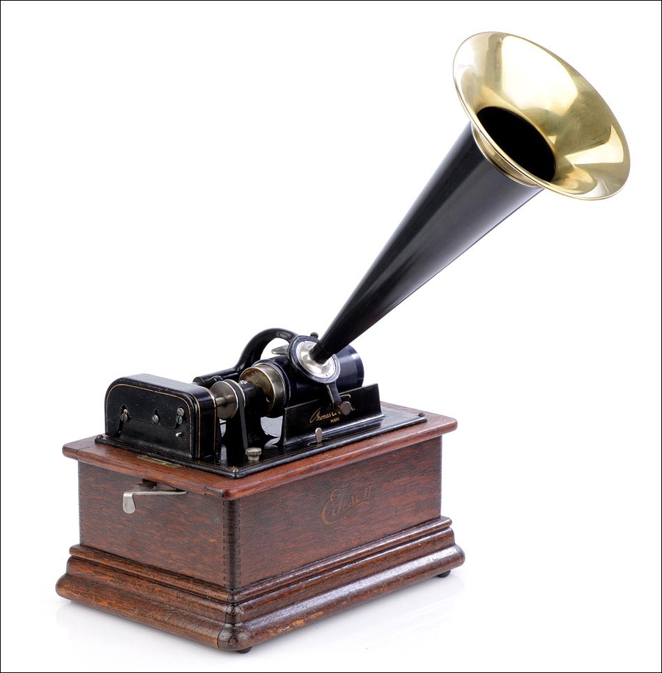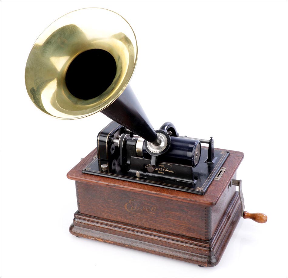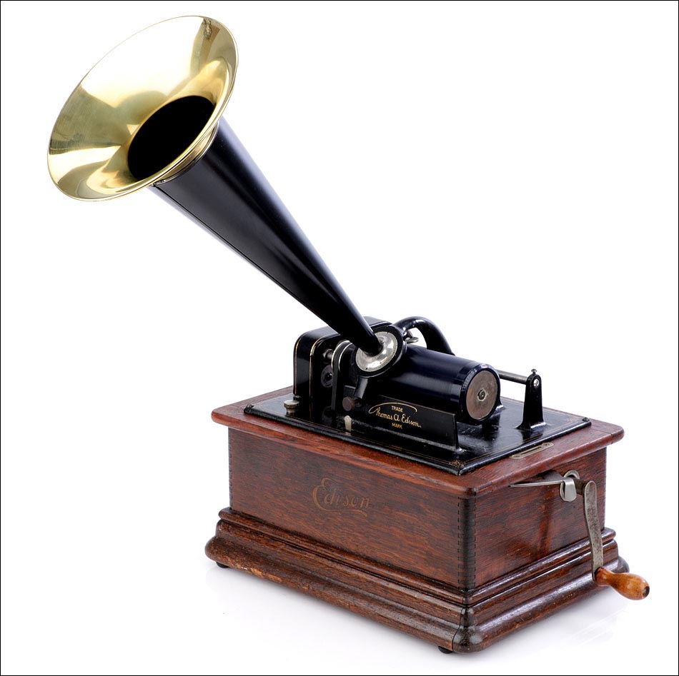 El primer fonógrafo fue creado por Thomas A. Edison a partir de dos aparatos ya existentes: el telégrafo y el teléfono. En 1877, Edison decidió crear una máquina pudiera grabar mensajes mediante perforaciones para luego reenviarlos de nuevo. Tras cambiar el papel por un cilindro de metal, realizó la famosa grabación de la rima infantil “Mary had a Little lamb” (“Mary tenía un corderito”), cuando reprodujo el cilindro, para su asombro la máquina repitió la rima. Edison patentó su invención el 24 de diciembre de 1877. La primera empresa fundada por Edison, The Edison Speaking Phonograph Company, se fundó al año siguiente para exhibir la máquina con fines comerciales. No fue hasta 1887 cuando se creó The Edison Phonograph Company, destinada ya a comercializar fonógrafos. En 1894 el inventor declaró en bancarrota la North American Phonograph Company para poder recuperar los derechos de su invento, y e 1896 fundó la National Phonograph Company con el objetivo de comercializar fonógrafos de uso doméstico. El éxito propició la apertura de filiales de la marca en distintos puntos de Europa. Ya en 1910 la firma se reorganizó bajo el nombre de Thomas A. Edison Inc.; el inventor nunca quiso dejar de fabricar cilindros y pasarse al pujante mercado de los discos para gramófono, lo que supuso el debacle de la empresa, que desapareció en 1929.