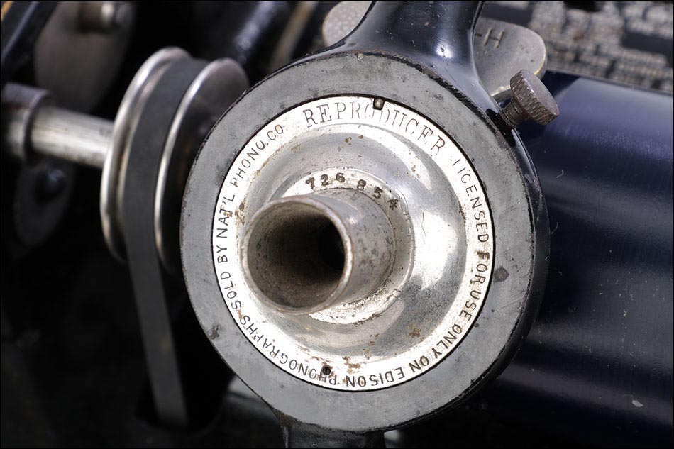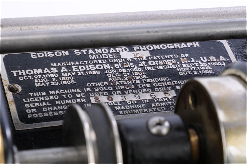 La caja del fonógrafo es de madera de roble oscura, muy bien conservada y con la tapa curvada original. En su cara frontal podemos ver el nombre de la marca en letras doradas, Edison. La madera está en un estado de conservación realmente bueno, sin zonas rotas o desgastadas y con un atractivo brillo satinado. El mecanismo de metal esmaltado en negro lleva también la firma original de Thomas A. Edison en letras doradas. El esmalte negro que embellece el metal está muy bien conservado, liso y regular. La base conserva la decoración de líneas y filigranas doradas original de época. El aparato lleva una placa de metal con el modelo (E) y el número de serie 806305 grabados.