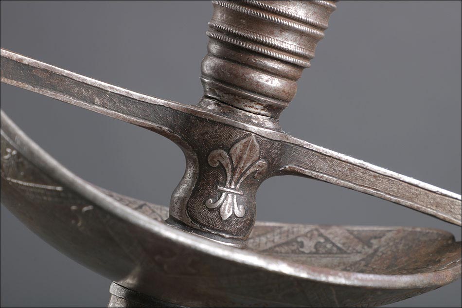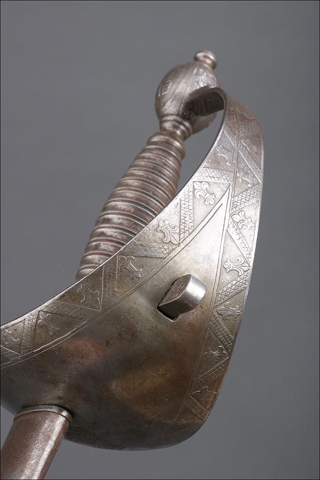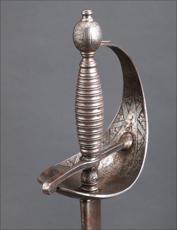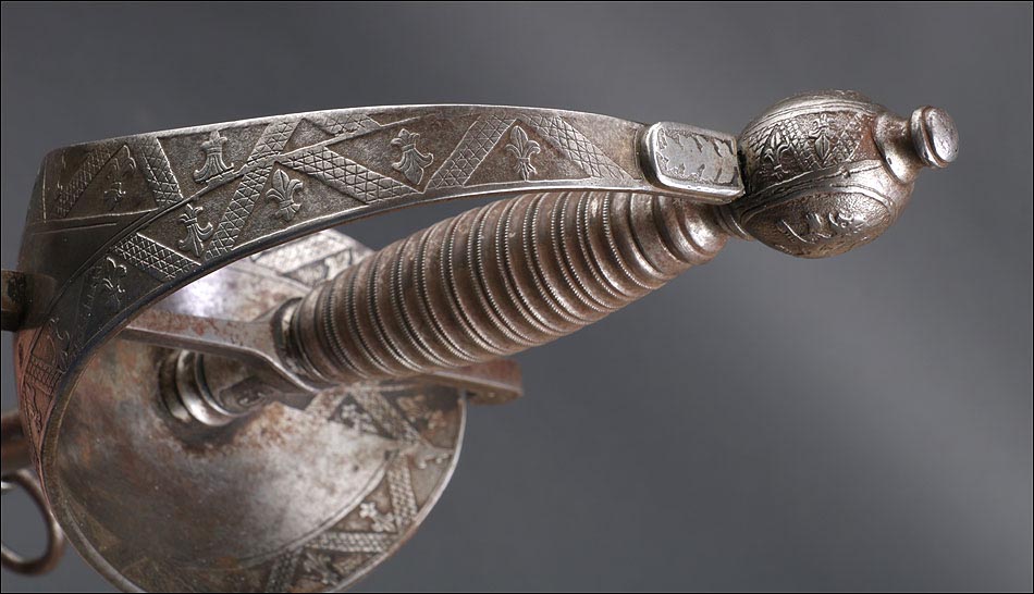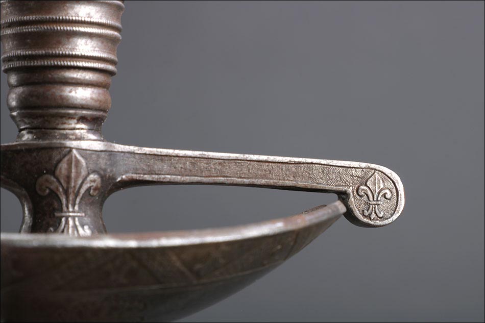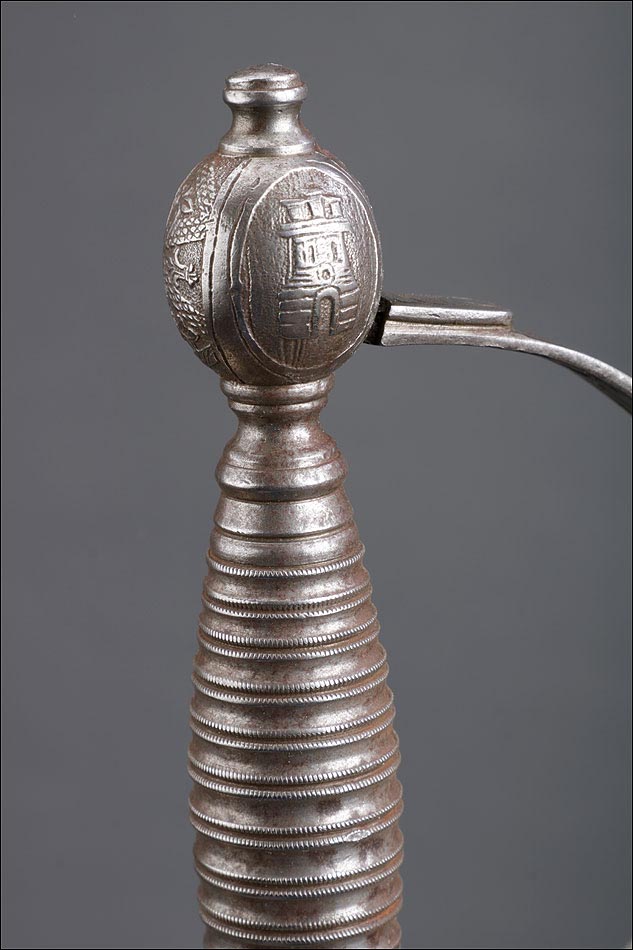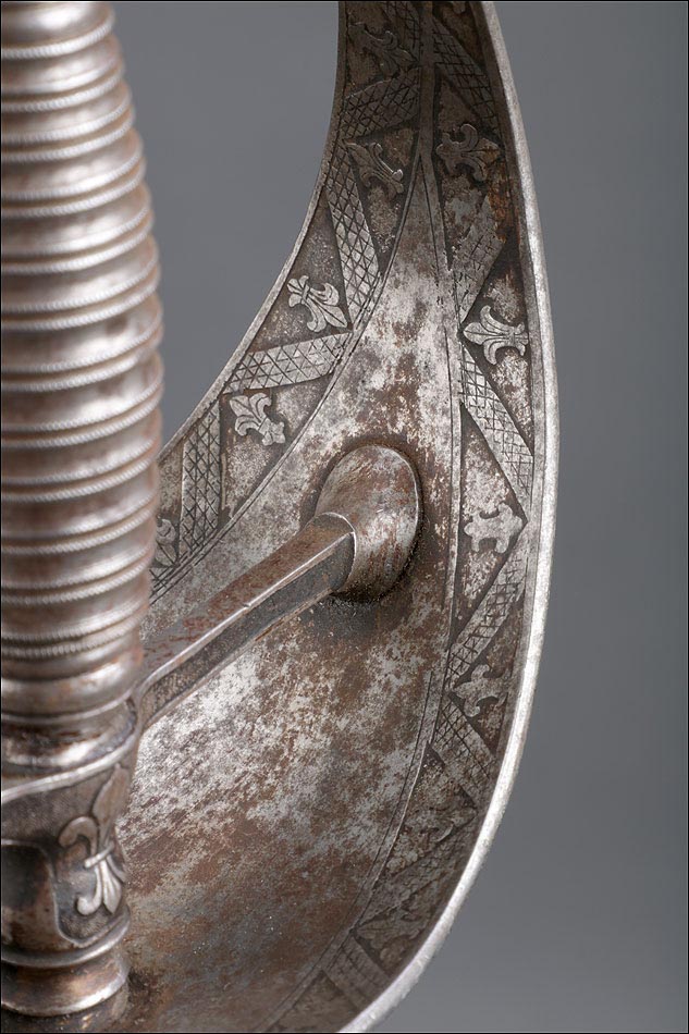 La empuñadura de la espada está fabricada íntegramente de acero. Lleva puño de forma ahusada con ranuras horizontales, rematado por un pomo redondo con los símbolos de Castilla y León grabados en cada lado. Entre ellos hay una cenefa con flores de lis, que se repite también por el exterior y el interior del guardamano. En la cruz también aparece grabada la flor de lis, una en cada extremo y otra el en centro. La vaina de acero también está en buenas condiciones y conserva las anillas para los correajes.