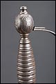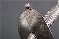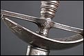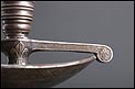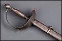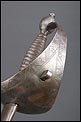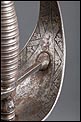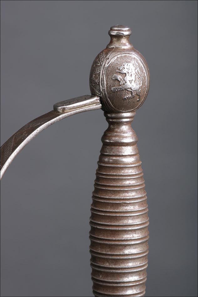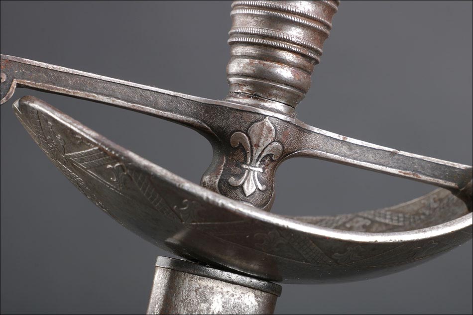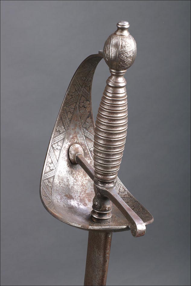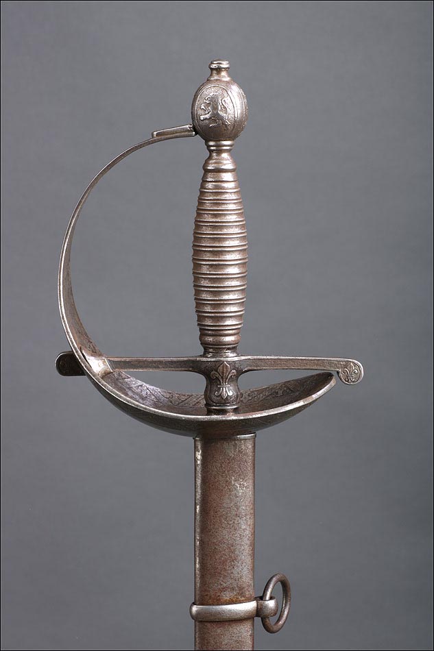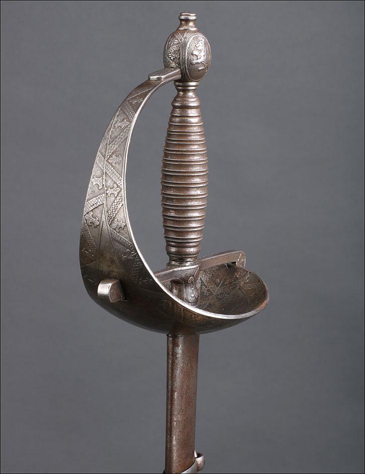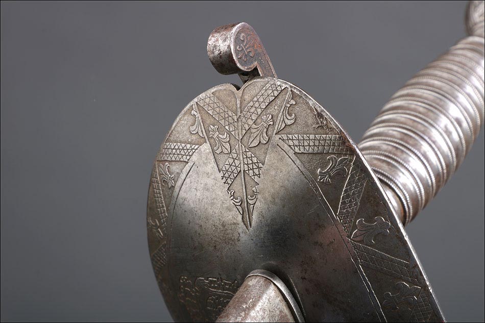 La empuñadura de la espada está fabricada íntegramente de acero. Lleva puño de forma ahusada con ranuras horizontales, rematado por un pomo redondo con los símbolos de Castilla y León grabados en cada lado. Entre ellos hay una cenefa con flores de lis, que se repite también por el exterior y el interior del guardamano. En la cruz también aparece grabada la flor de lis, una en cada extremo y otra el en centro. La vaina de acero también está en buenas condiciones y conserva las anillas para los correajes.