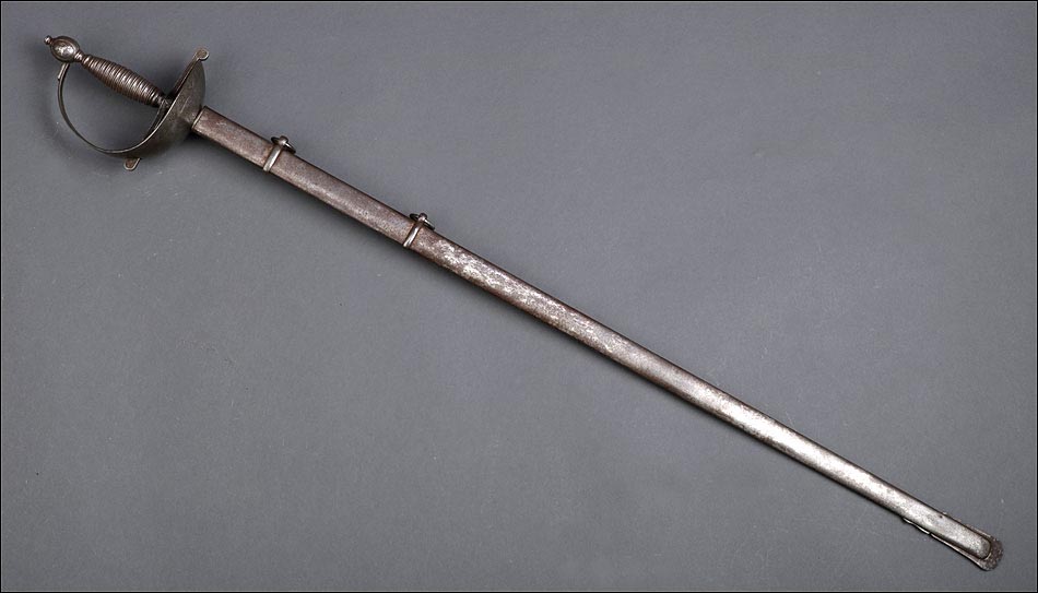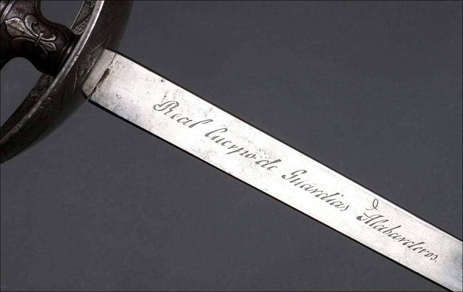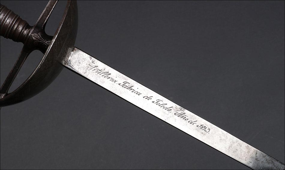Antigua y rara espada para guardia del Real Cuerpo de Guardias Alabarderos, fabricada en España en 1849 y en buen estado de conservación. Se trata de una pieza de coleccionista perteneciente a una serie limitada de la que desaparecieron numerosas unidades, tal y como se cuenta en el párrafo siguiente. La espada conserva los grabados decorativos y las inscripciones en muy buen estado, bastante nítidos y perfectamente legibles. En la hoja se pueden leer claramente dos inscripciones: por un lado aparece escrito “Artillería Fábrica de Toledo Año de 1849”, y por el otro, “Real Cuerpo de Guardias Alabarderos”. La espada va acompañada de una vaina de acero antigua, que tal vez no sea la original pero encaja perfectamente en ella.