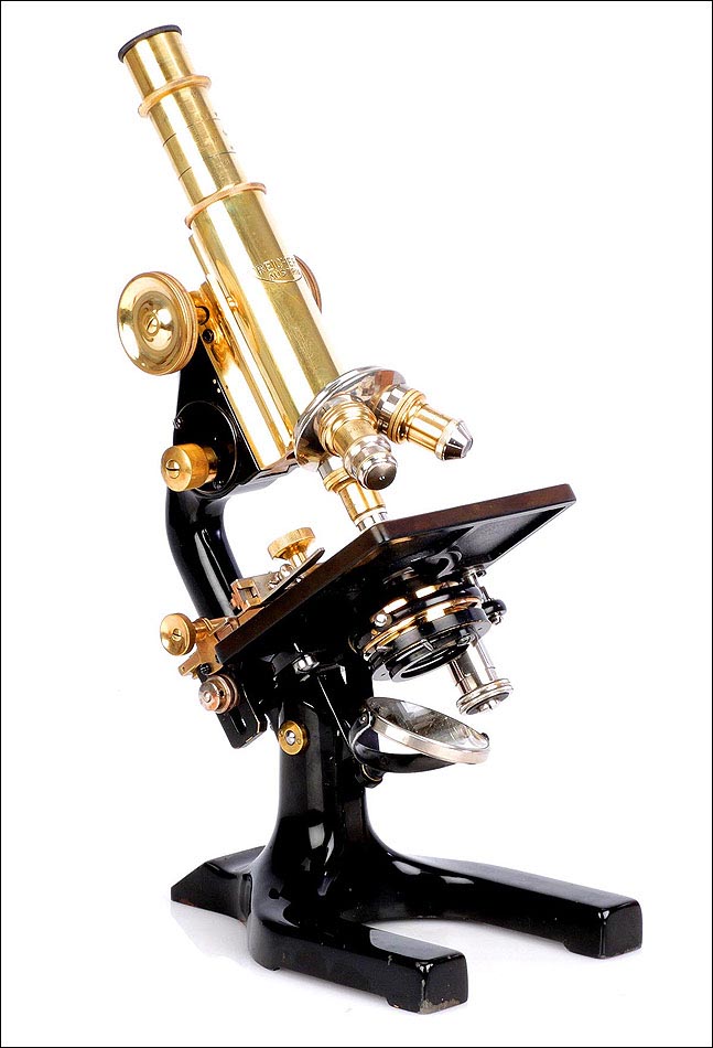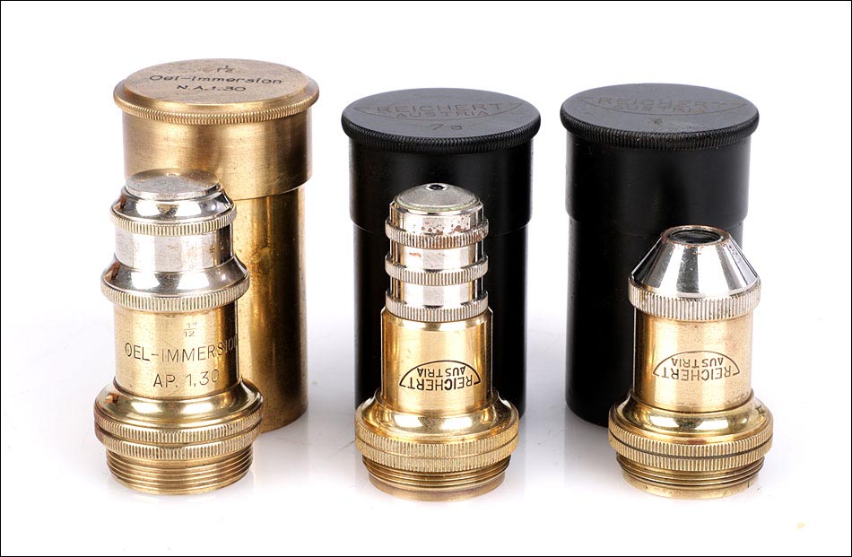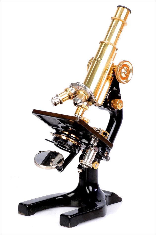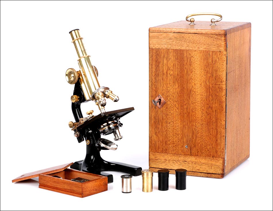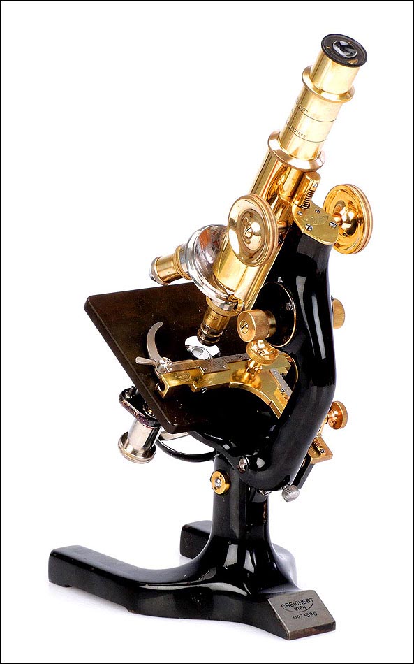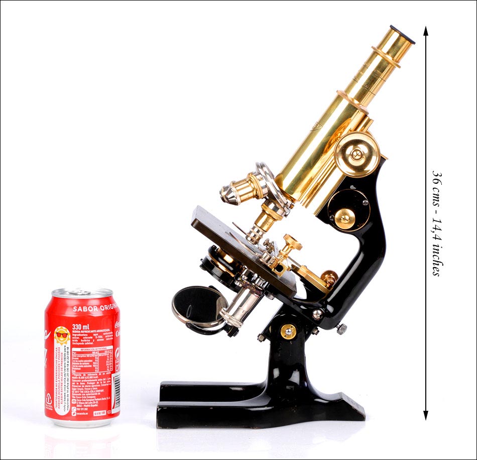 Precioso y antiguo microscopio Reichter fabricado en Austria en 1927, con estuche de madera maciza original y en perfecto estado de funcionamiento. Los microscopios de esta marca eran los favoritos de Santiago Ramón y Cajal, que los usó habitualmente en sus investigaciones. El que vemos en las imágenes está fechado precisamente en la época durante la que vivió el científico y Premio Nobel. El microscopio llama poderosamente la atención por su completo equipamiento e impresionante estado de conservación: lleva revólver de tres lentes y va acompañado de un juego de dos oculares y tres objetivos, todos ellos muy bien conservados y fabricados también por la firma fundada por Carl Reichert.