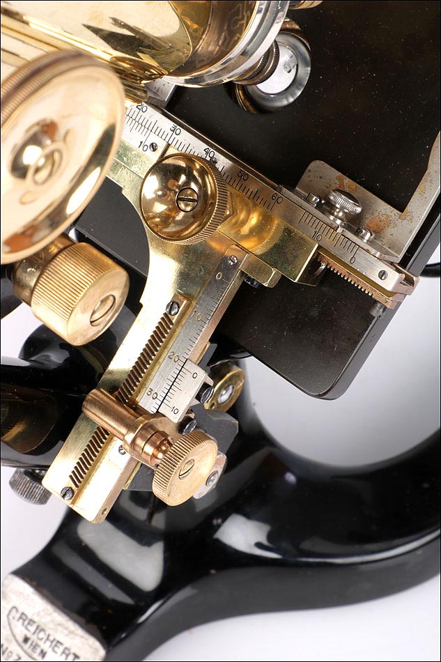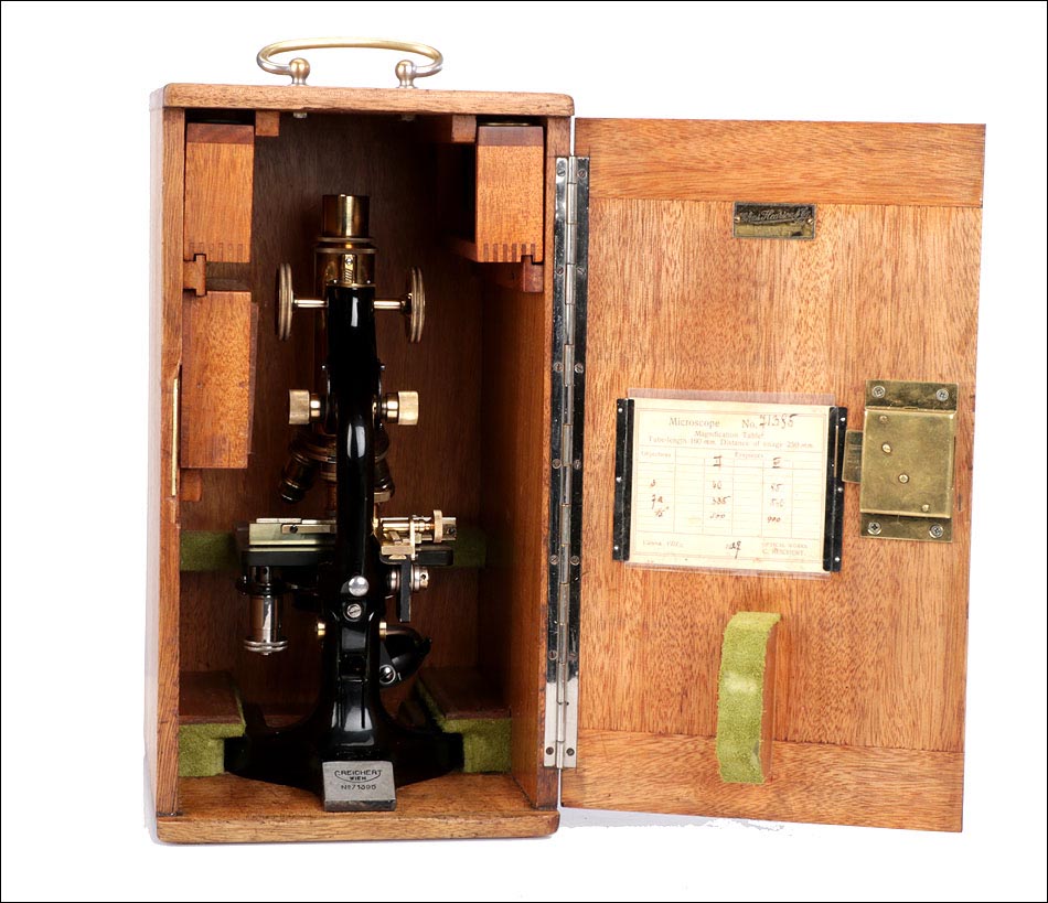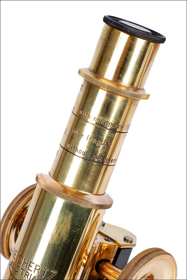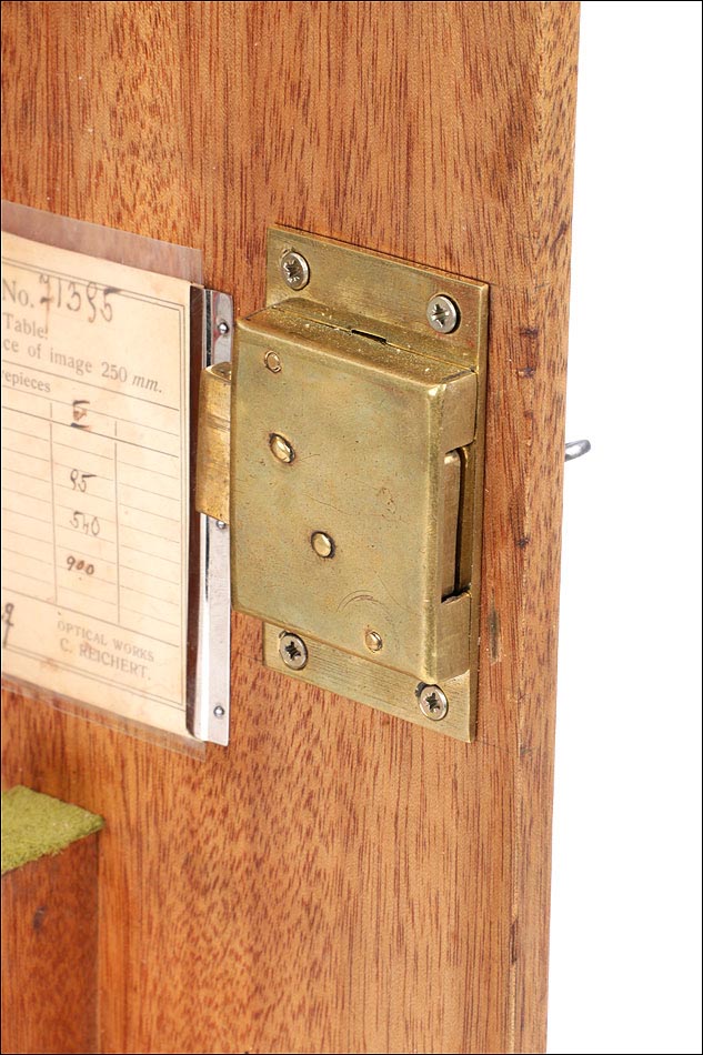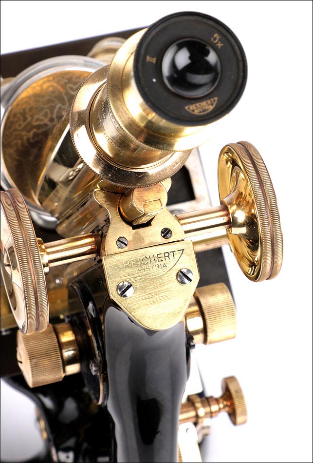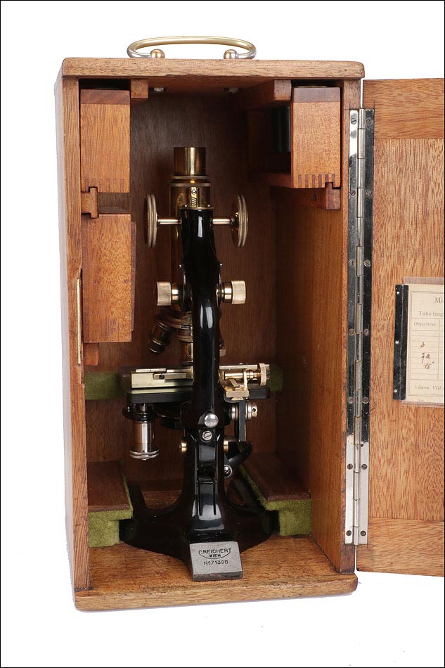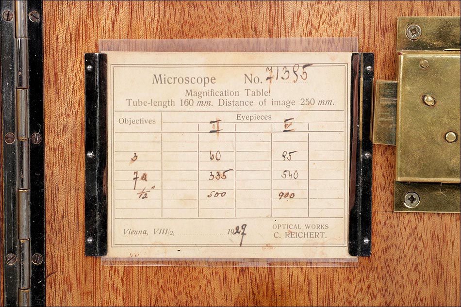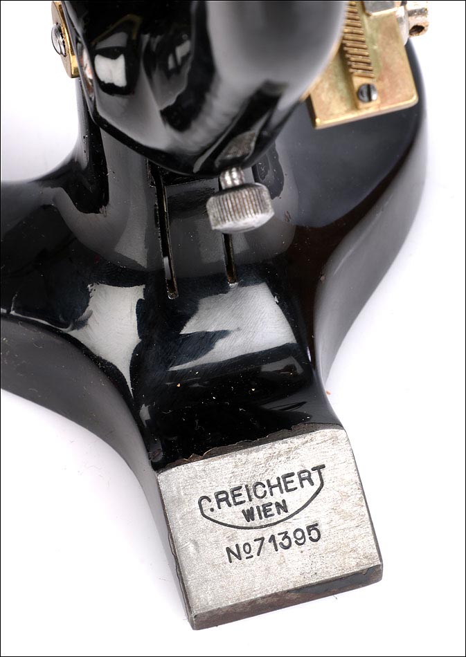 El microscopio lleva pie de herradura de hierro fundido esmaltado en negro y mecanismo formado por piezas de latón. El esmalte está en muy buenas condiciones, liso y brillante y sin rastros de desgaste. En cuanto al latón, aún conserva la laca transparente protectora de época, que le aporta una bella pátina. En la parte trasera de la base del microscopio podemos ver la marca (C. REICHERT – WIEN) y el número de serie Nº71395 grabados en el metal. En la pletina de ajuste micrométrico también aparece el nombre del fabricante junto con otro número de serie: Nº5019. Además, la marca está grabada en la torre del microscopio, los oculares y los objetivos e impresa en la hoja con las especificaciones incluida en el interior del estuche. Este es de madera de caoba maciza, con cerradura y llave originales en perfecto estado de funcionamiento.