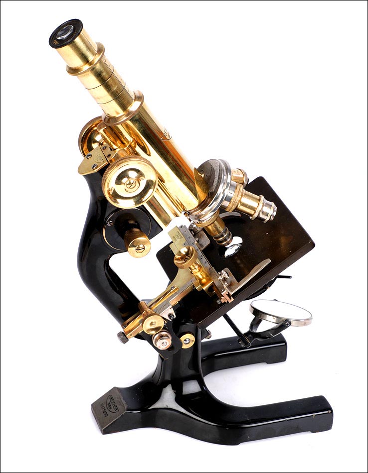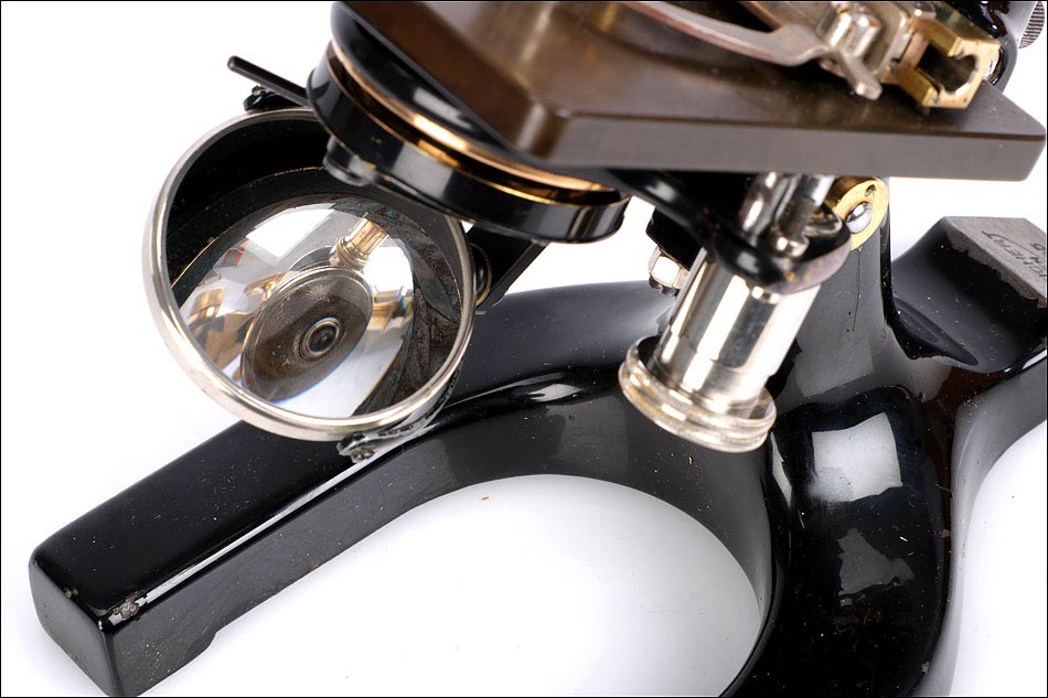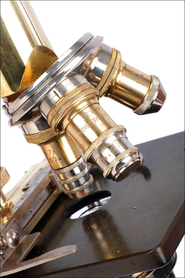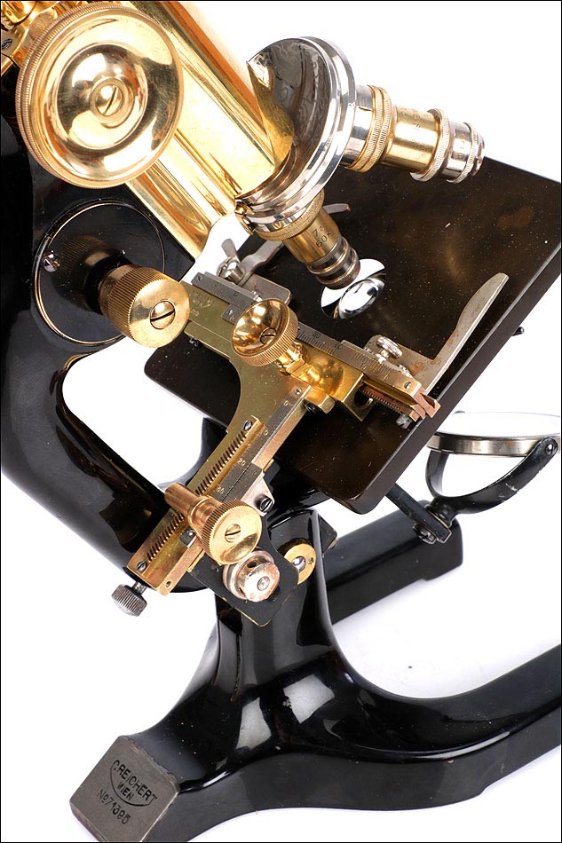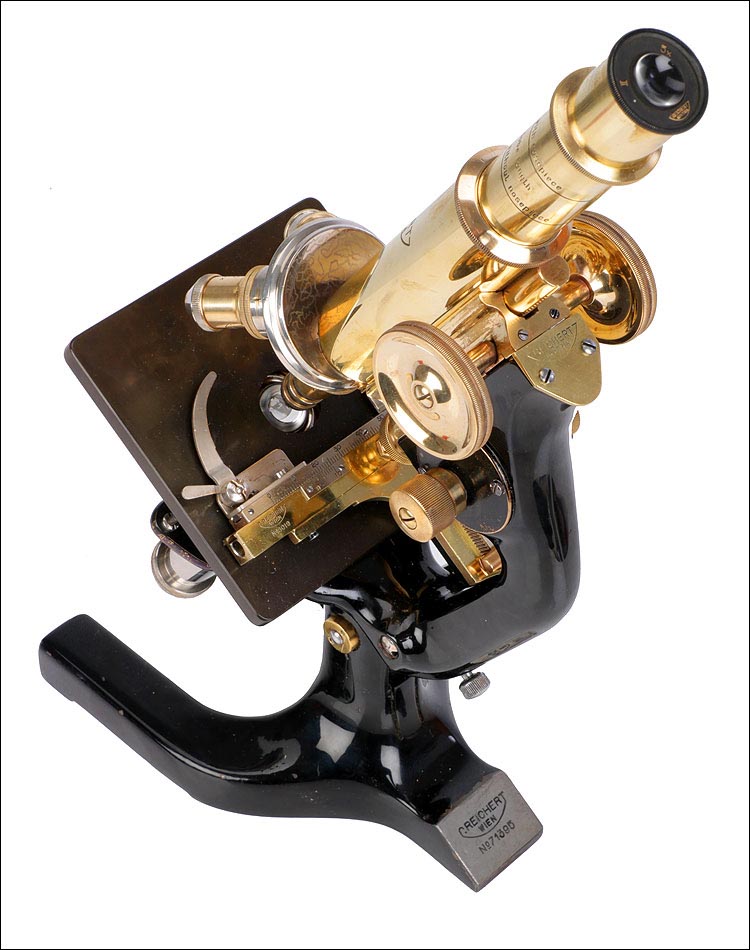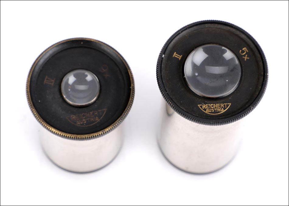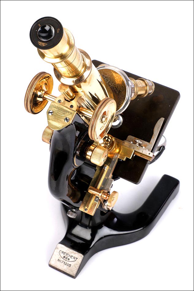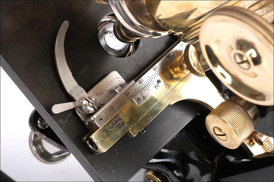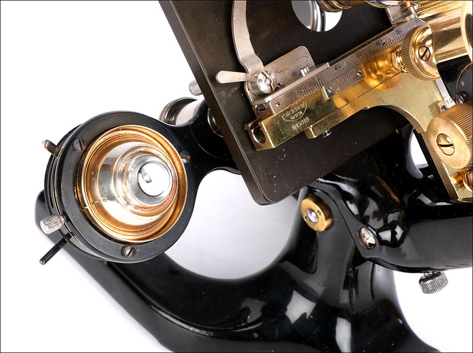 El microscopio lleva pie de herradura de hierro fundido esmaltado en negro y mecanismo formado por piezas de latón. El esmalte está en muy buenas condiciones, liso y brillante y sin rastros de desgaste. En cuanto al latón, aún conserva la laca transparente protectora de época, que le aporta una bella pátina. En la parte trasera de la base del microscopio podemos ver la marca (C. REICHERT – WIEN) y el número de serie Nº71395 grabados en el metal. En la pletina de ajuste micrométrico también aparece el nombre del fabricante junto con otro número de serie: Nº5019. Además, la marca está grabada en la torre del microscopio, los oculares y los objetivos e impresa en la hoja con las especificaciones incluida en el interior del estuche. Este es de madera de caoba maciza, con cerradura y llave originales en perfecto estado de funcionamiento.