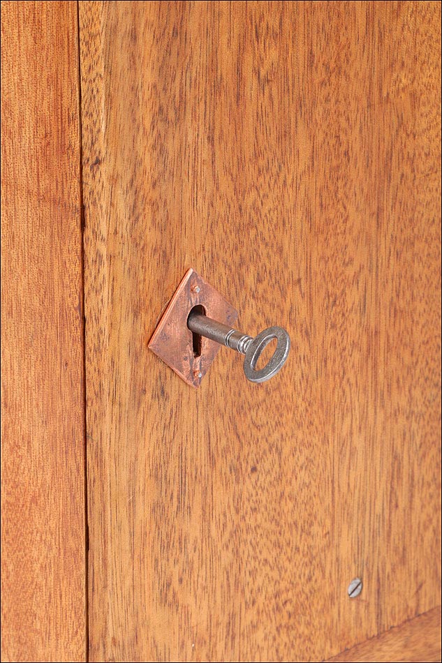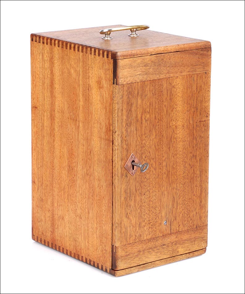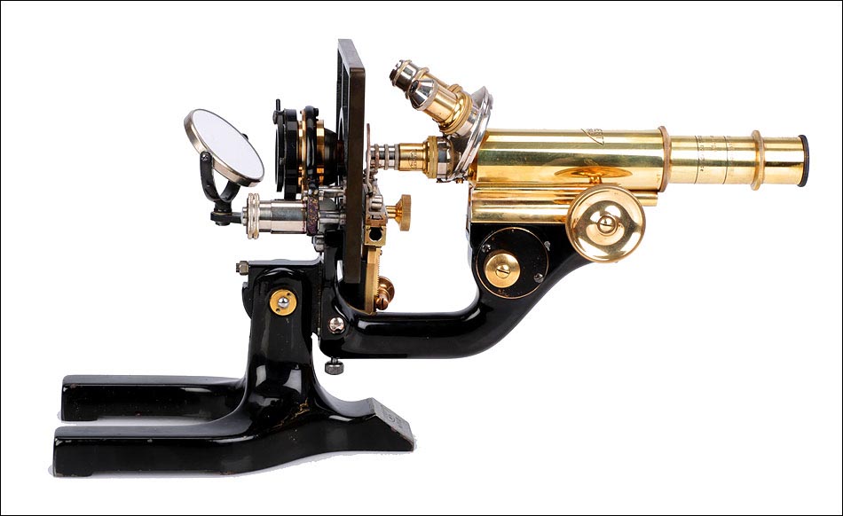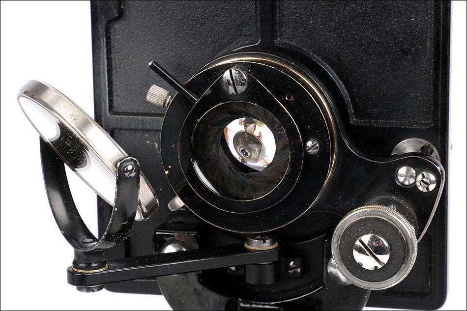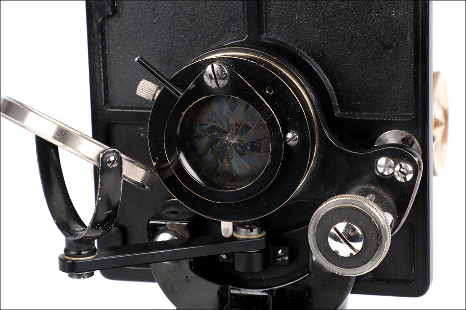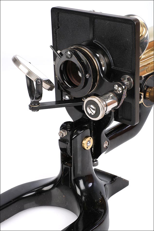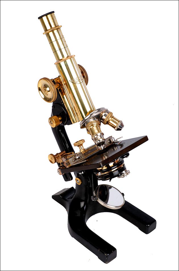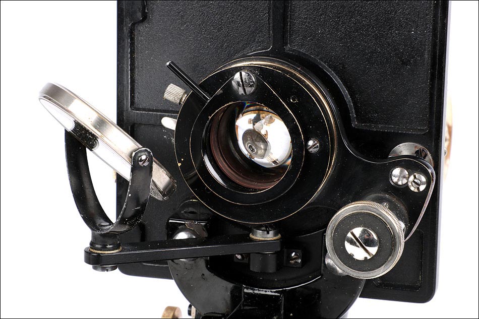El microscopio lleva pie de herradura de hierro fundido esmaltado en negro y mecanismo formado por piezas de latón. El esmalte está en muy buenas condiciones, liso y brillante y sin rastros de desgaste. En cuanto al latón, aún conserva la laca transparente protectora de época, que le aporta una bella pátina. En la parte trasera de la base del microscopio podemos ver la marca (C. REICHERT – WIEN) y el número de serie Nº71395 grabados en el metal. En la pletina de ajuste micrométrico también aparece el nombre del fabricante junto con otro número de serie: Nº5019. Además, la marca está grabada en la torre del microscopio, los oculares y los objetivos e impresa en la hoja con las especificaciones incluida en el interior del estuche. Este es de madera de caoba maciza, con cerradura y llave originales en perfecto estado de funcionamiento.