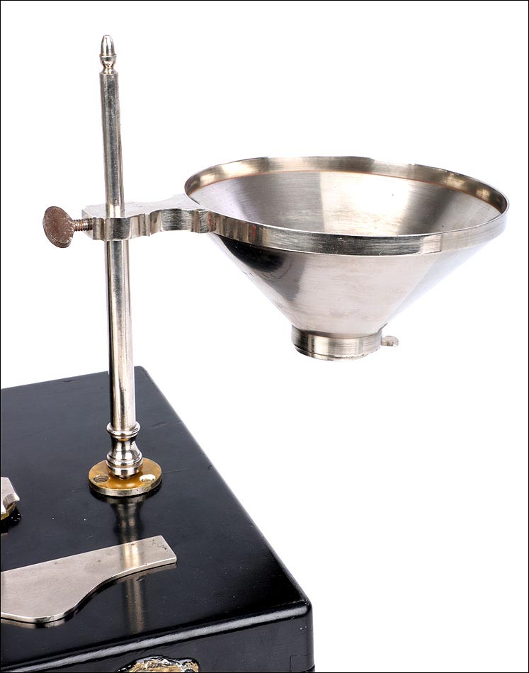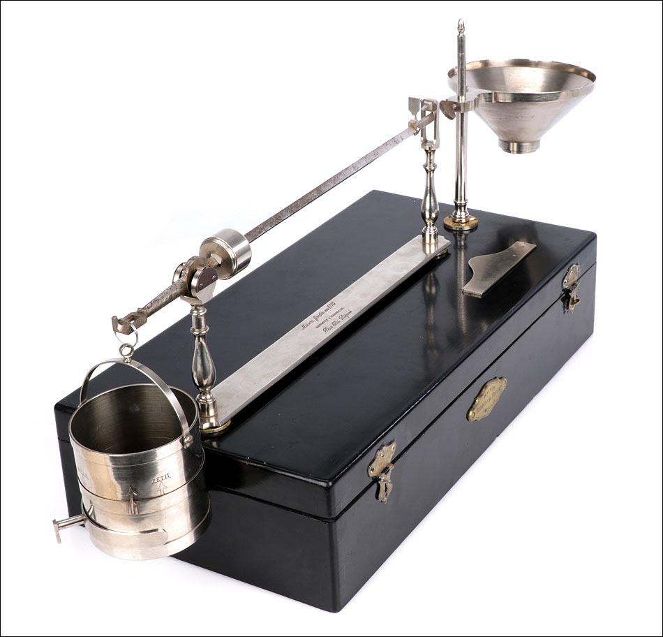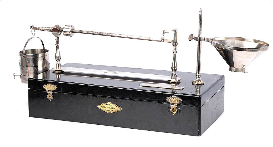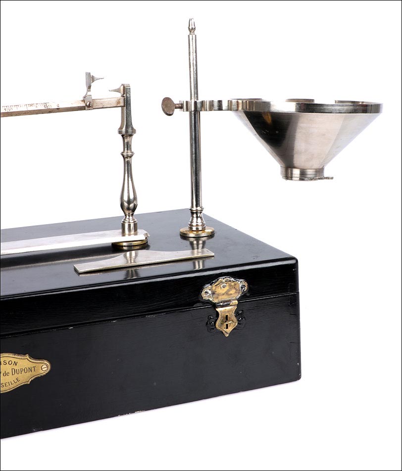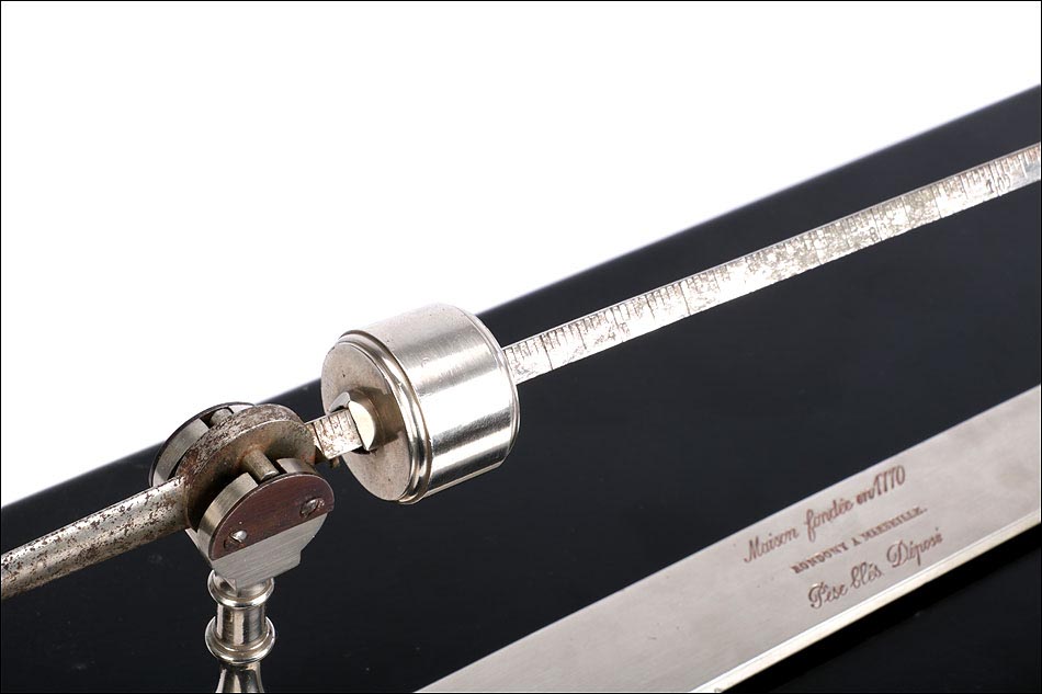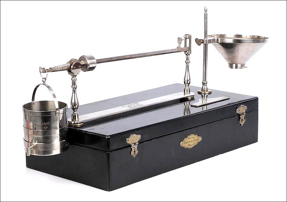Antiguo condómetro Rondony para pesar granos, completo y en muy buen estado de conservación. Este fascinante aparato es un instrumento para uso científico, fabricado en Francia en el siglo XIX. El término “condómetro” se empleaba en física; actualmente está obsoleto y designa a los instrumentos diseñados para pesar los granos y las harinas, y determinar su calidad. El aparato que vemos en las imágenes está muy bien conservado: se presenta desmontado en su estuche original, que también sirve como base para montarlo. Está formado por una serie de piezas de metal plateado, en buenas condiciones y con tan solo ligeros restos de óxido en la barra con la escala.