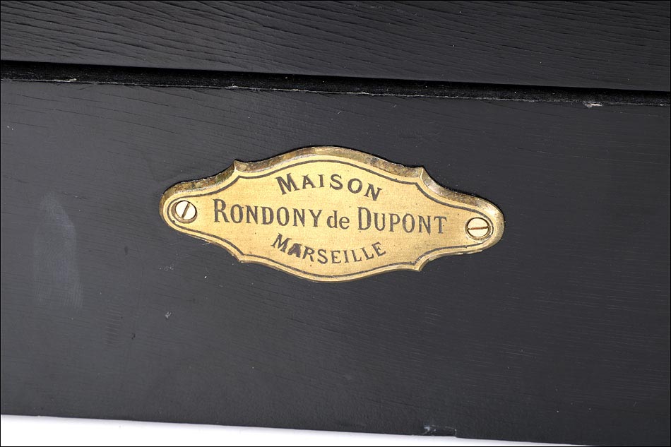 El estuche es una caja de madera rectangular con un precioso acabado lacado en color negro. El lacado está en excelentes condiciones, liso y brillante. En la parte delantera hay una placa de metal dorado con la inscripción MAISON RONDONY DE DUPONT – MARSEILLE. El interior del estuche está revestido de tela roja y lleva compartimentos para guardar las piezas ordenadas. La tela está bien conservada, sin manchas ni roturas.