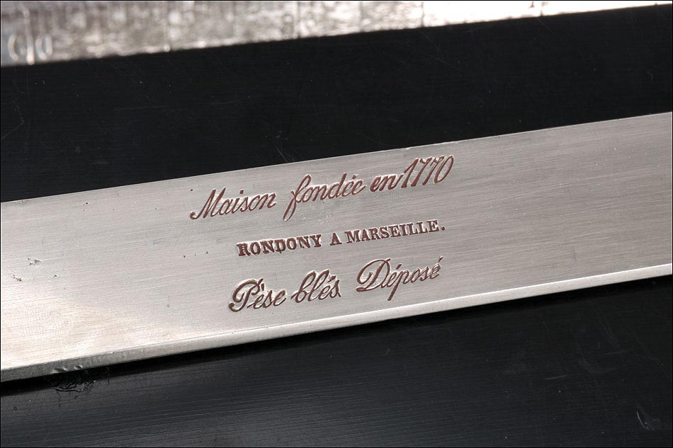 Una vez ensamblado, el aparato consta de dos partes: una delicada balanza romana con un gancho a la izquierda y un pilar con un embudo a la derecha. Del gancho pende un cubo de metal de forma cilíndrica, formado por dos partes que rotan. La barra se suspende sobre una base con dos pilares en los extremos, que se encajan en dos orificios practicados en la tapa. La placa de metal lleva grabada la inscripción Maison fondeé en 1770 - Rondony a Marseille – Pèse Blés Déposé. A la derecha, la tapa del estuche lleva un tercer orificio donde se encaja un pilar de metal que soporta un embudo. El embudo lleva una tapa en su extremo inferior, con un tornillo que permite abrirla y cerrarla.