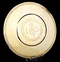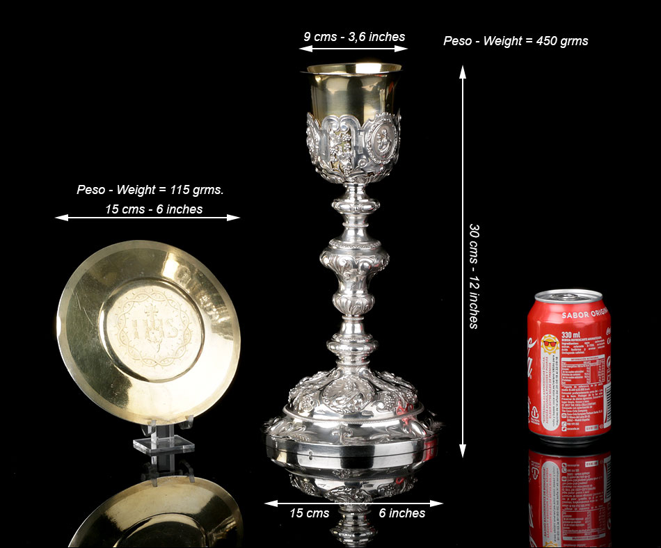 Medidas: Cáliz: Ancho de la Base: 15 cm. Altura: 30 cm. Ancho de la Copa: 9 cm. Peso: 450 g. Patena: Diámetro: 15 cm. Peso: 115 g.