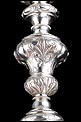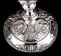 El tallo del cáliz lleva varios nudos, todos ellos decorados con finos relieves. El central tiene forma de jarra y muestra imágenes de espigas de trigo y racimos de uvas, acompañadas de motivos clásicos. Sobre él, la copa lleva base de filigrana de plata lisa con imágenes de las Virtudes Teologales: Fe, Esperanza y Caridad. Las imágenes representan a tres mujeres sosteniendo los iconos que identifican las virtudes. Situadas en el interior de medallones, son imágenes de gran delicadeza realizadas con todo detalle. La base sostiene la copa de plata dorada, lisa y con forma estilizada.