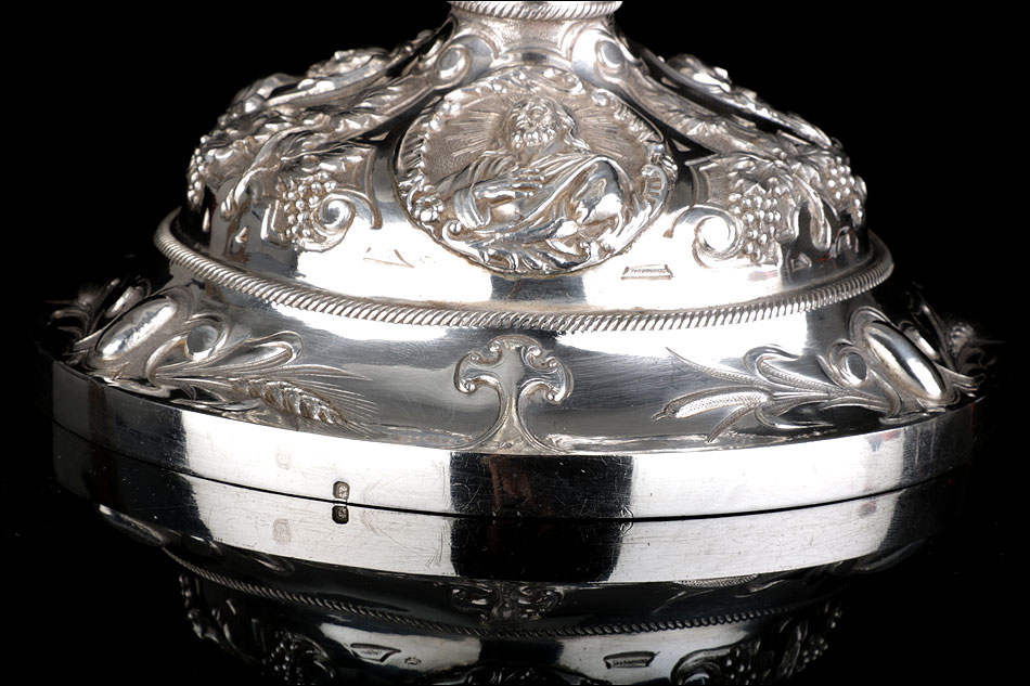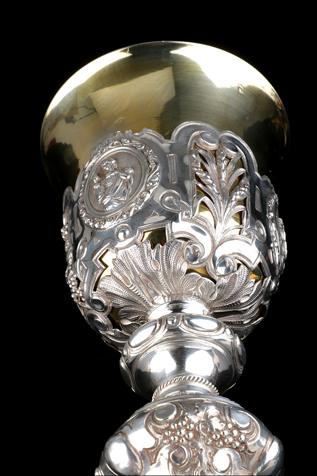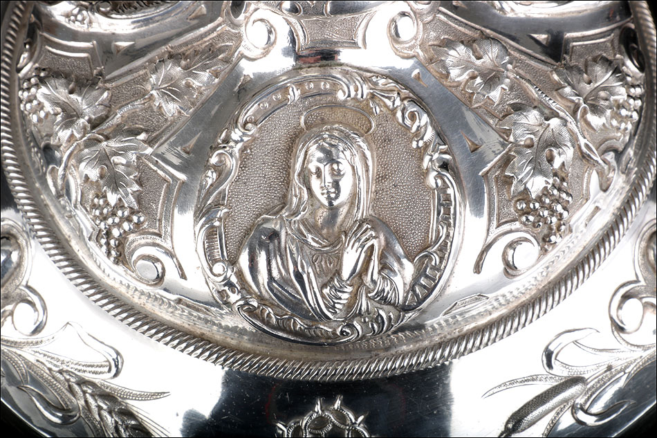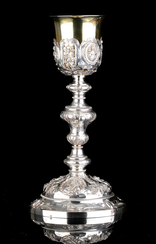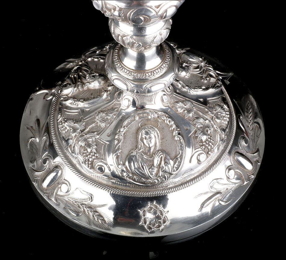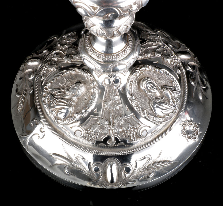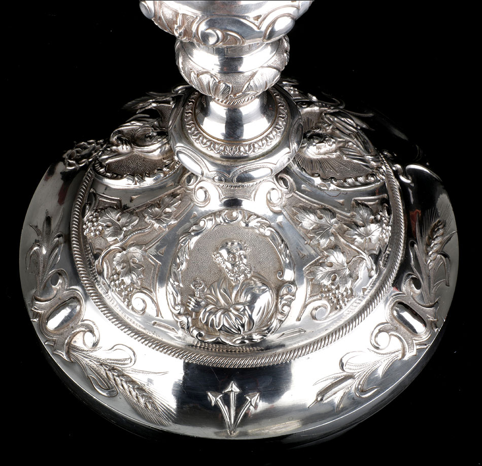 Bellísimo y espectacular cáliz repujado en plata maciza, acompañado de su patena y con el estuche original de época. El cáliz es una impresionante muestra de orfebrería litúrgica, fabricado en plata en su totalidad y completamente decorado con imágenes repujadas a mano. La base es una amplia pieza circular, estable y pesada, en cuya superficie tienen cabida tres bellos medallones con bustos de la Virgen María, San Pedro (con las llaves) y Jesucristo. Es curioso señalar que, en este caso, la efigie de San José ha sido sustituida por la del apóstol. En el borde podemos ver espigas de trigo y juncos repujados, pertenecientes a la simbología eucarística y cristiana respectivamente. Además, separando los medallones hay preciosos relieves con racimos de uvas que nos remiten al vino de la eucaristía.