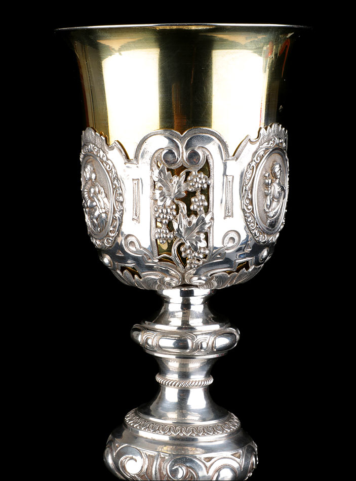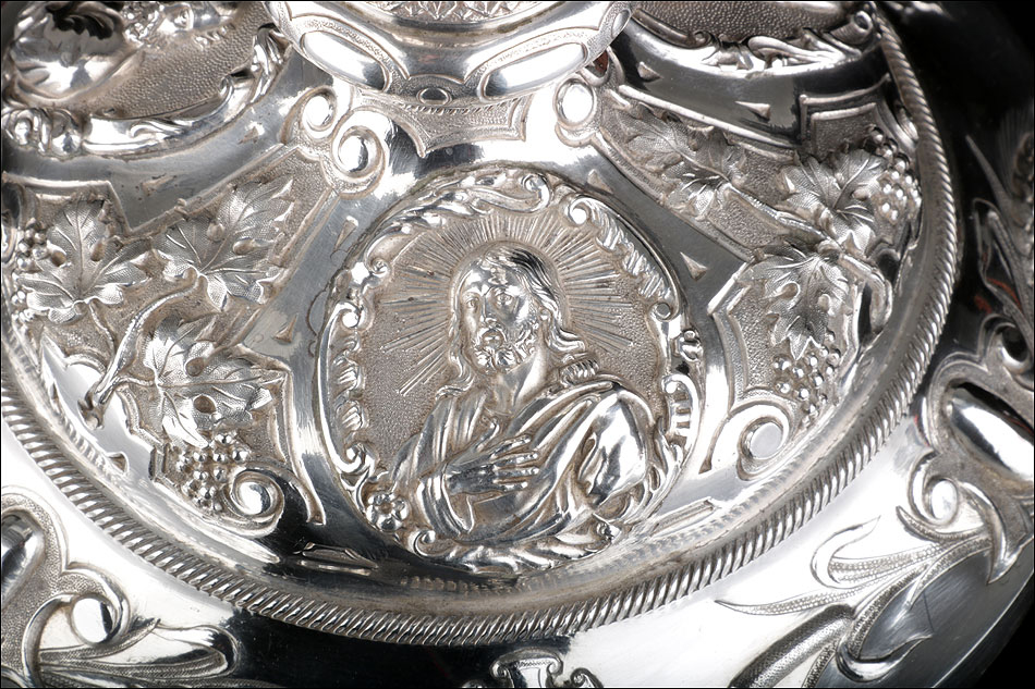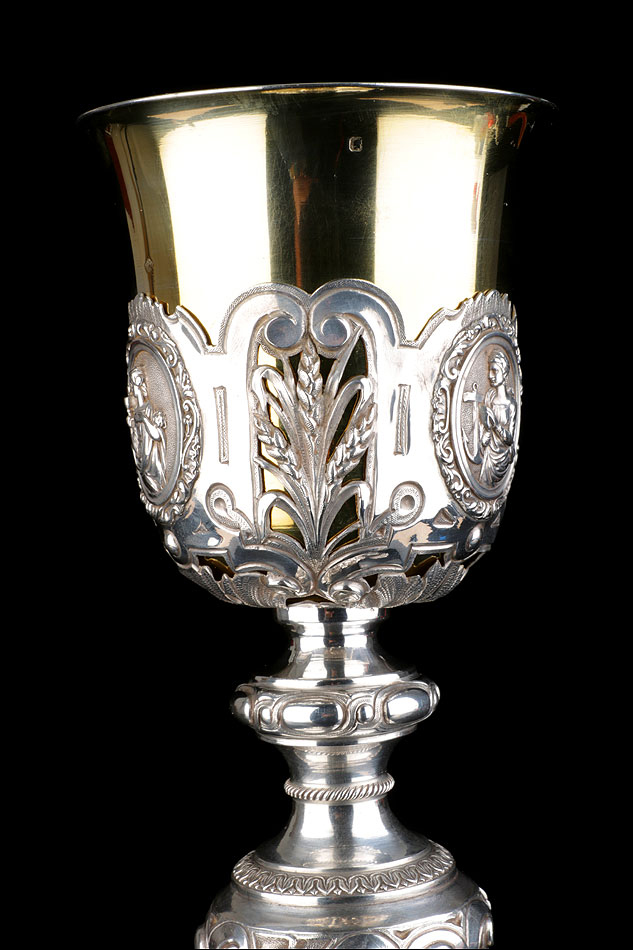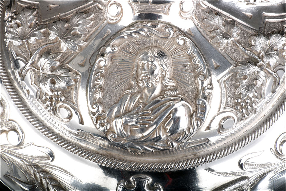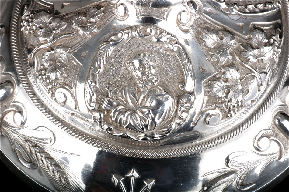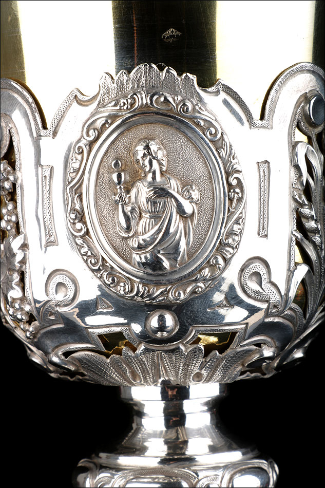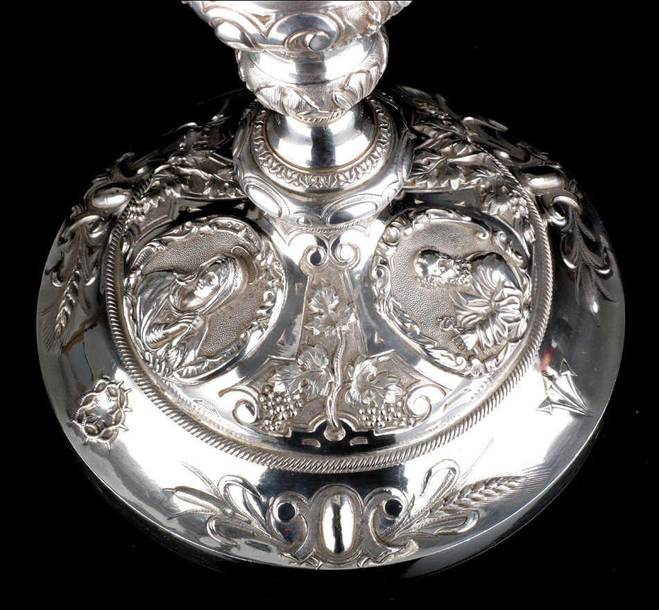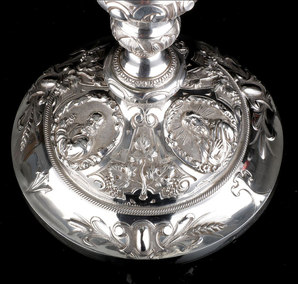 Bellísimo y espectacular cáliz repujado en plata maciza, acompañado de su patena y con el estuche original de época. El cáliz es una impresionante muestra de orfebrería litúrgica, fabricado en plata en su totalidad y completamente decorado con imágenes repujadas a mano. La base es una amplia pieza circular, estable y pesada, en cuya superficie tienen cabida tres bellos medallones con bustos de la Virgen María, San Pedro (con las llaves) y Jesucristo. Es curioso señalar que, en este caso, la efigie de San José ha sido sustituida por la del apóstol. En el borde podemos ver espigas de trigo y juncos repujados, pertenecientes a la simbología eucarística y cristiana respectivamente. Además, separando los medallones hay preciosos relieves con racimos de uvas que nos remiten al vino de la eucaristía.