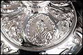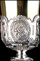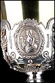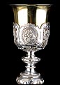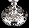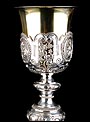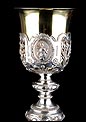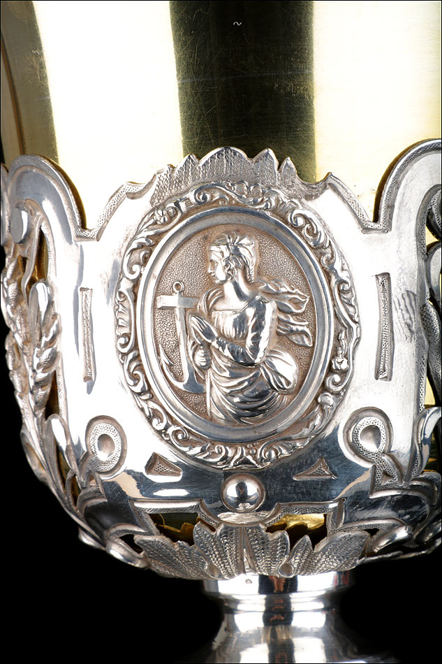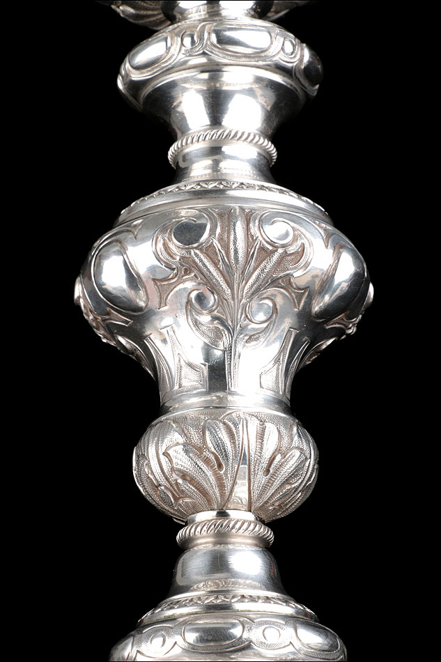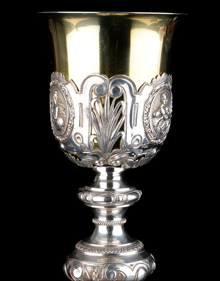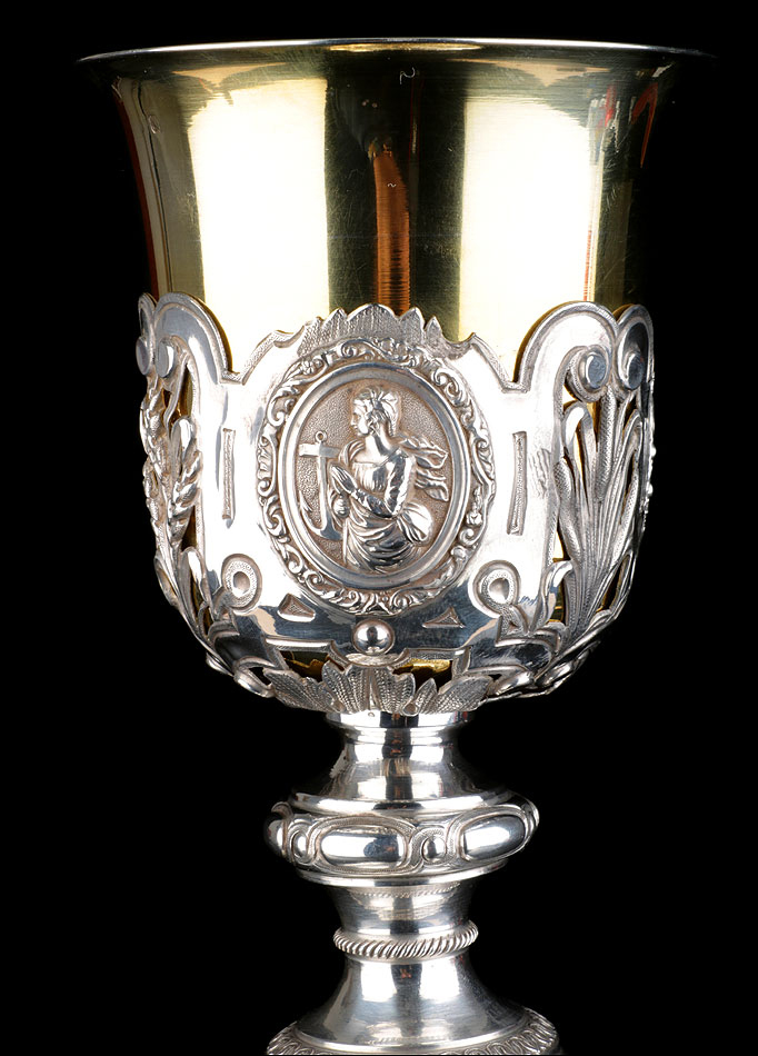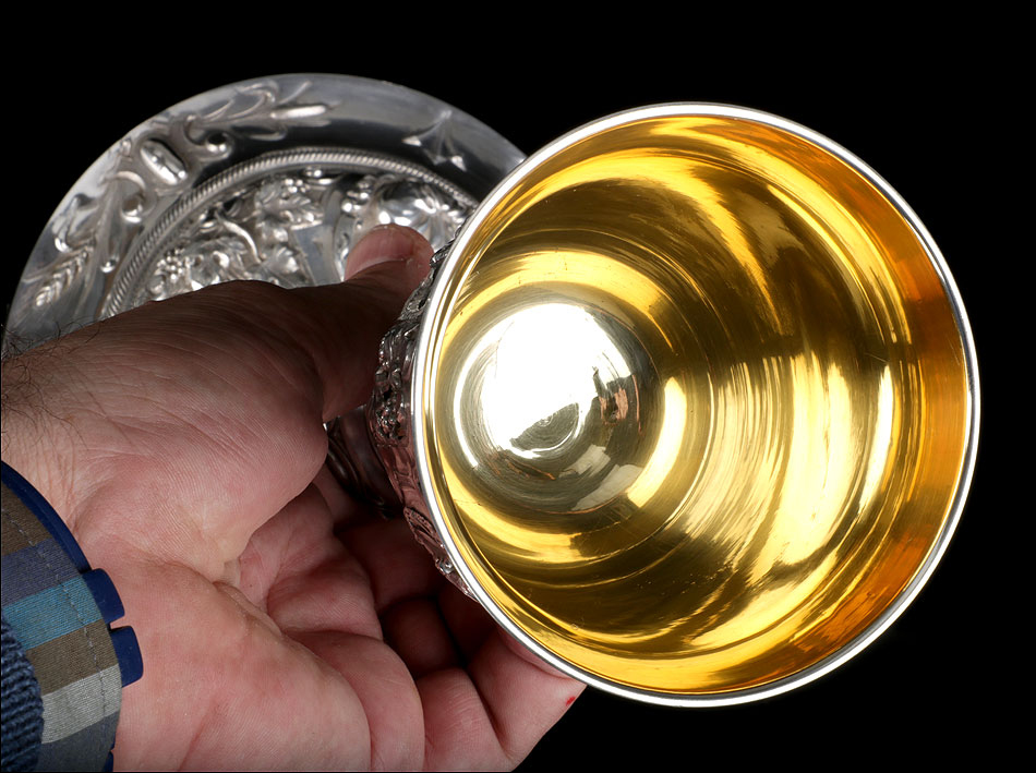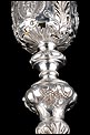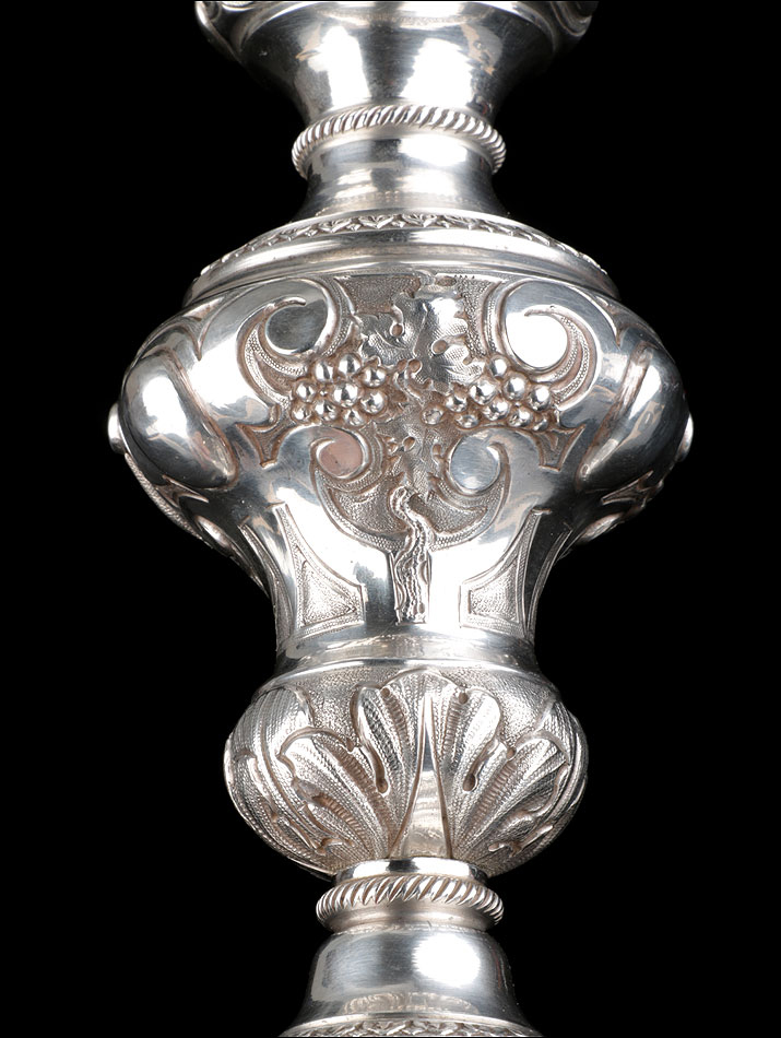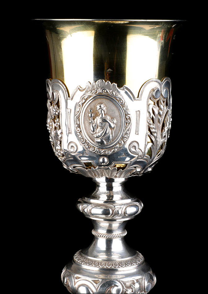 Bellísimo y espectacular cáliz repujado en plata maciza, acompañado de su patena y con el estuche original de época. El cáliz es una impresionante muestra de orfebrería litúrgica, fabricado en plata en su totalidad y completamente decorado con imágenes repujadas a mano. La base es una amplia pieza circular, estable y pesada, en cuya superficie tienen cabida tres bellos medallones con bustos de la Virgen María, San Pedro (con las llaves) y Jesucristo. Es curioso señalar que, en este caso, la efigie de San José ha sido sustituida por la del apóstol. En el borde podemos ver espigas de trigo y juncos repujados, pertenecientes a la simbología eucarística y cristiana respectivamente. Además, separando los medallones hay preciosos relieves con racimos de uvas que nos remiten al vino de la eucaristía.