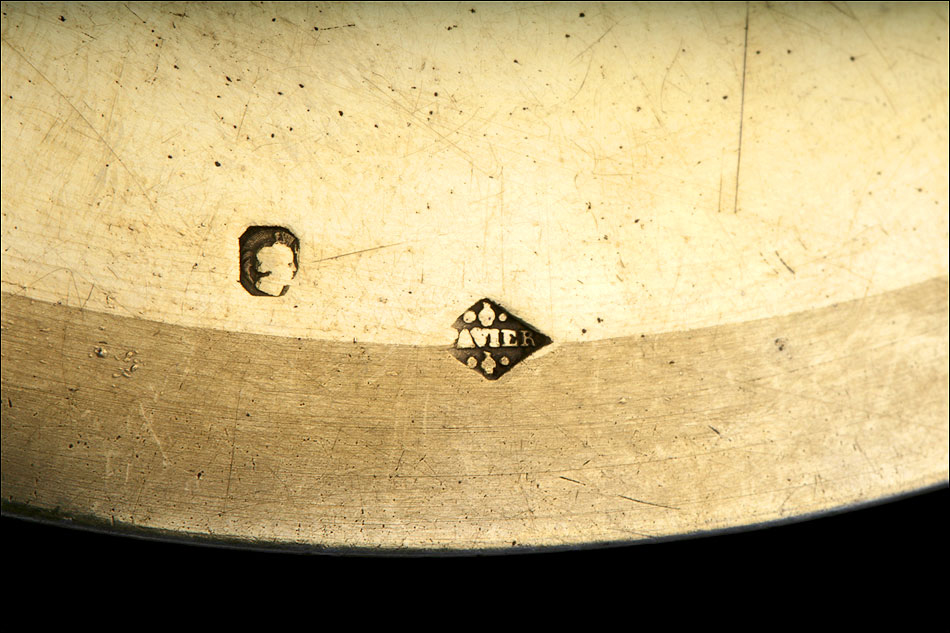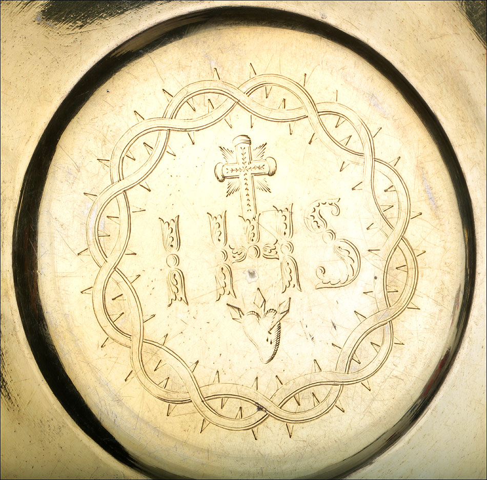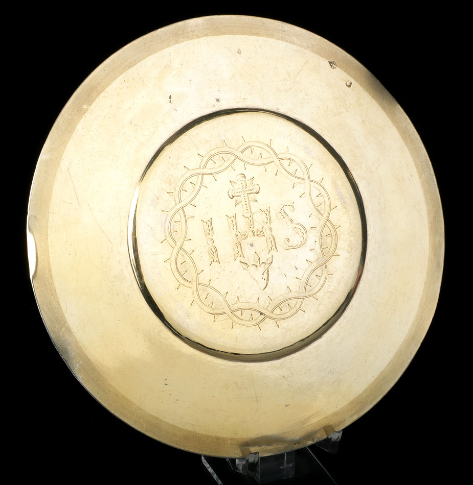 La patena que acompaña al cáliz, realizada también en plata maciza dorada, lleva una decoración consistente en la inscripción IHS (acrónimo del nombre griego de Jesucristo) rodeada por una corona de espinas y encima del Sagrado Corazón. Ambas piezas llevan contrastes: podemos distinguir el de la plata francesa antigua (el perfil de la diosa Minerva) y el del orfebre, con el nombre FAVIER. El juego completo se puede guardar y transportar en el estuche original de época. El revestimiento exterior de símil piel negro está bastante desgastado por el paso del tiempo, pero el estuche todavía cumple perfectamente su función.