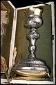 Medidas: Ancho de la Base: 13,5 cm. Altura: 24 cm. Ancho de la Copa: 7,8 cm. Peso: 615 g. Patena: Diámetro: 13,5 cm. Peso: 90 g.