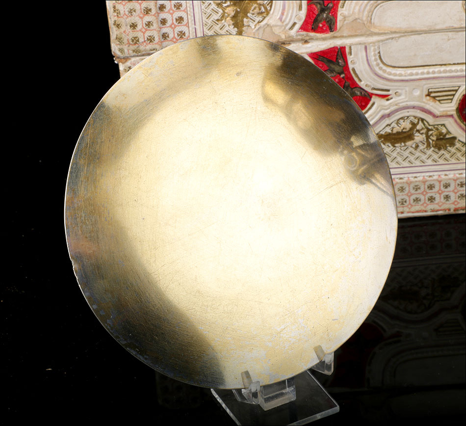 Evocador y antiguo cáliz español en plata maciza acompañado de patena y con estuche de época. Este cáliz es una pieza muy antigua, procedente de Barcelona y fechado en el siglo XIX. Está totalmente grabado con imágenes iconográficas: se trata de una decoración rara y muy especial, ya que en lugar de mostrar retratos de personajes santos o virtudes personalizadas lo que aparece grabado en la plata son las Arma Christi. Con este nombre se conoce a los símbolos que representan los objetos que fueron empleados en el martirio de Cristo o lo acompañaron durante el sufrimiento.
