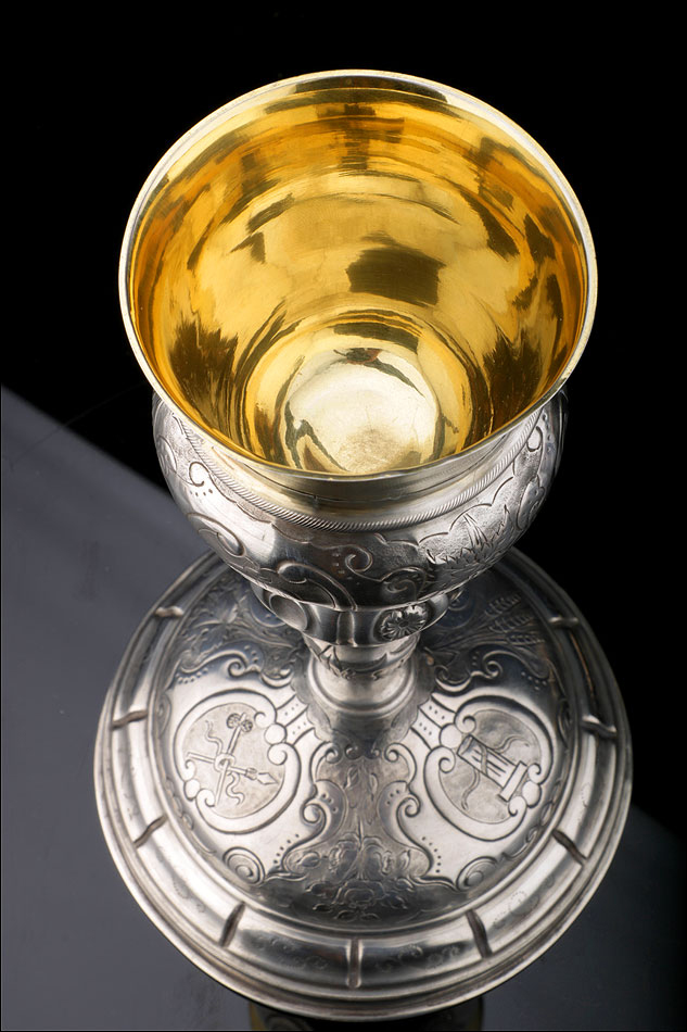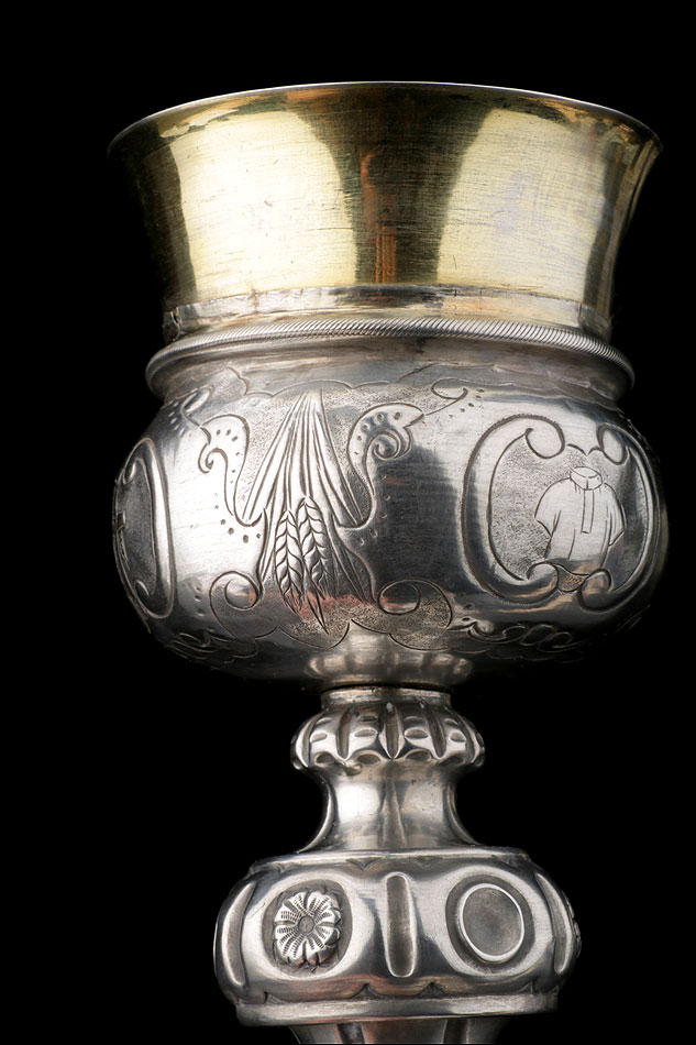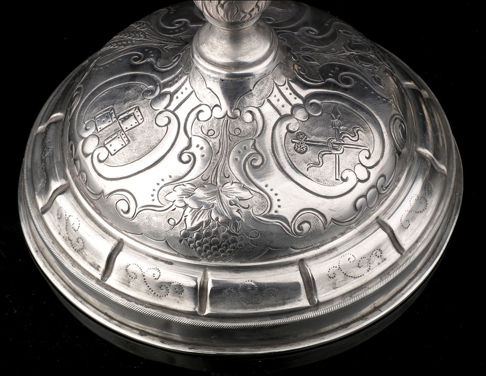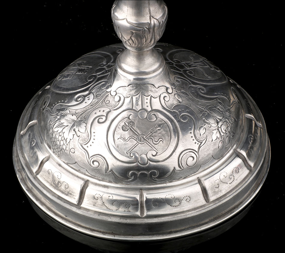 Estos símbolos empezaron a ser venerados durante la baja Edad Media, apareciendo en numerosas obras de arte y objetos de artesanía. En la base del cáliz podemos ver los dados con los que los soldados se echaron a suertes las prendas de Jesús, la columna de la flagelación y la lanza y el palo con la esponja con los que martirizaron a Cristo Crucificado. Por otra parte, en la copa aparecen la cruz con el sudario, la túnica inconsútil (túnica sin costuras con la que le vistió Herodes Antipas) y una corneta con la inscripción SPQUR que representa al Imperio Romano. Los grabados son sencillos y lineales, pero muy gráficos.