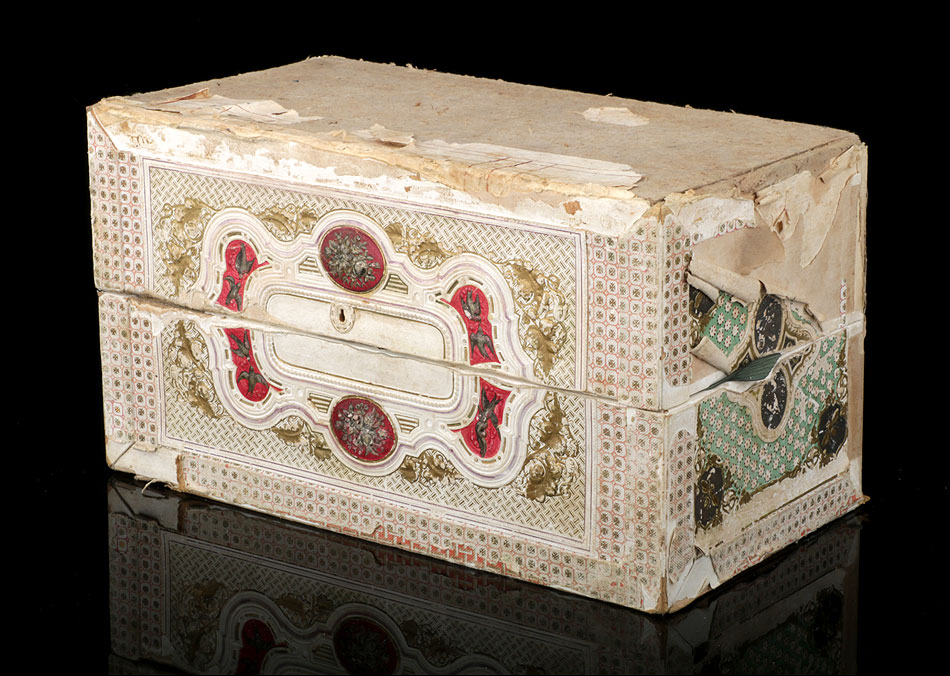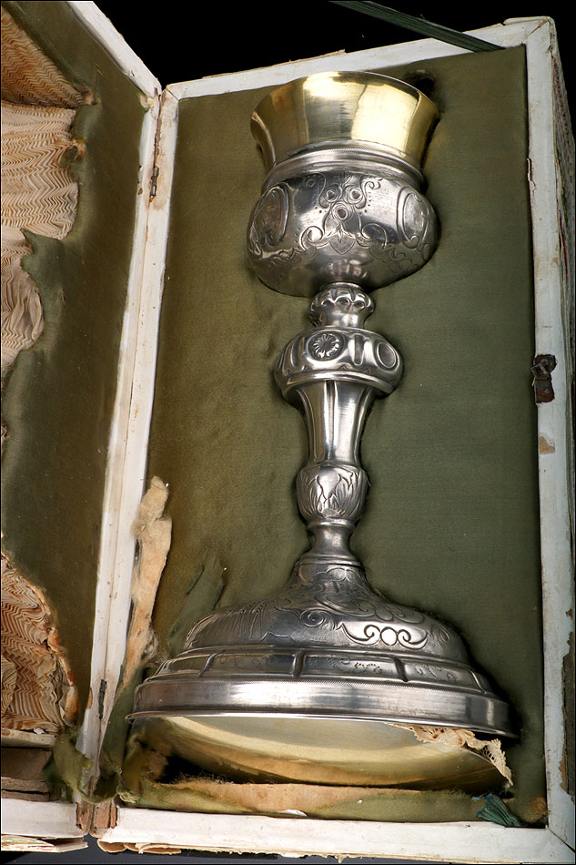 En la parte inferior, el cáliz lleva un contrapeso; excepto esta parte, el resto de la pieza es de plata. Tanto la patena como el cáliz llevan contrastes, pero están muy desgastados por el paso del tiempo. La patena es un sencillo disco sin decoración alguna, pero también de plata maciza cien por cien. En cuanto al estuche, es una caja de madera rectangular forrada de un precioso papel impreso en colores. El interior del estuche lleva un hueco con la forma del cáliz para evitar que se desplace durante el transporte.