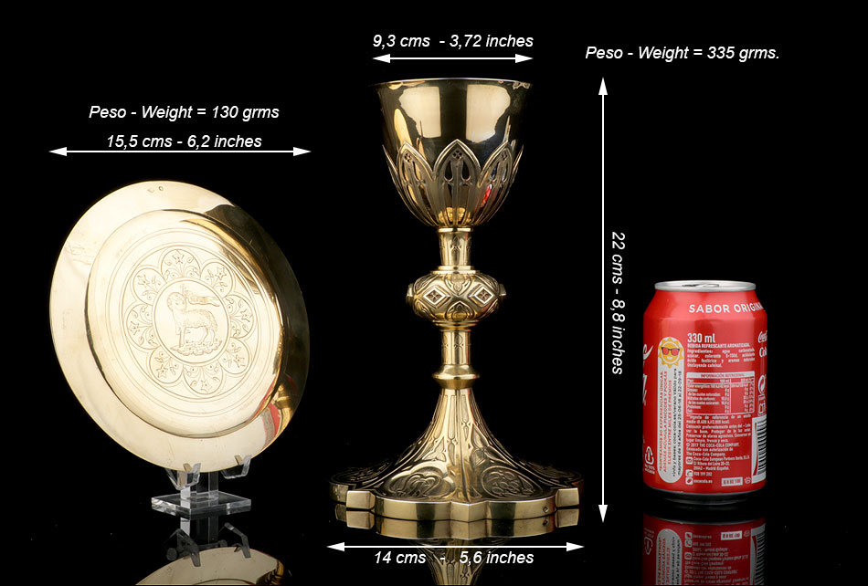 Medidas: Cáliz: Ancho de la Base: 14 cm. Altura: 22 cm. Ancho de la Copa: 9,3 cm. Peso: 335 g. Patena: Diámetro: 15,5 cm. Peso: 130 g.