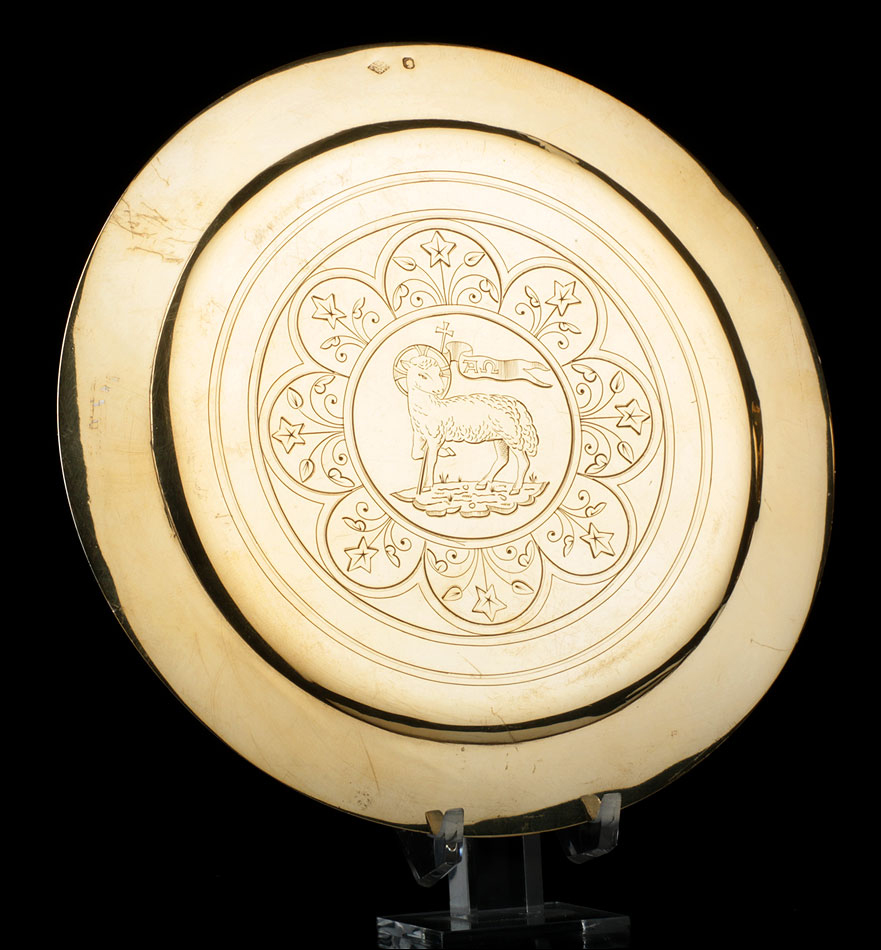 Precioso y antiguo cáliz neogótico en plata maciza dorada, con patena de plata y procedente de Francia. El conjunto fue fabricado circa 1900, por lo que cuenta actualmente con más de 100 años de antigüedad. A pesar de ello, el cáliz se conserva en magníficas condiciones: la decoración grabada permanece impecable y los contrastes que marcan las piezas se ven con claridad. El diseño es de estilo neogótico, una corriente muy de moda en la época que reproducía la estética medieval. El resultado es una pieza muy equilibrada y sobria, pero al mismo tiempo muy decorativa. La base del cáliz es lobulada y lleva grabados seis medallones: tres de ellos contienen motivos abstractos, mientras que los otros tres contienen acrónimos de dos letras. Uno de ellos lleva las letras SJ (San José), el otro muestra las letras SM (Santa María) y el último está grabado con las letras IHS, acrónimo del nombre griego de Jesucristo. Los tres configuran la Sagrada Familia, un tema recurrente en muchos cálices de la época. En el tallo y la base de la copa, la plata está decorada con tracerías y arcos apuntados de estilo medieval. La patena es una hermosa pieza de plata dorada; si bien no podemos asegurar que sea la propia del cáliz, resulta muy atractiva. Lleva grabado el Agnus Dei (Cordero de Dios, símbolo de Jesucristo) rodeado de tracerías medievales. Tanto el cáliz como la patena llevan contrastes que dan fe de su calidad y antigüedad.