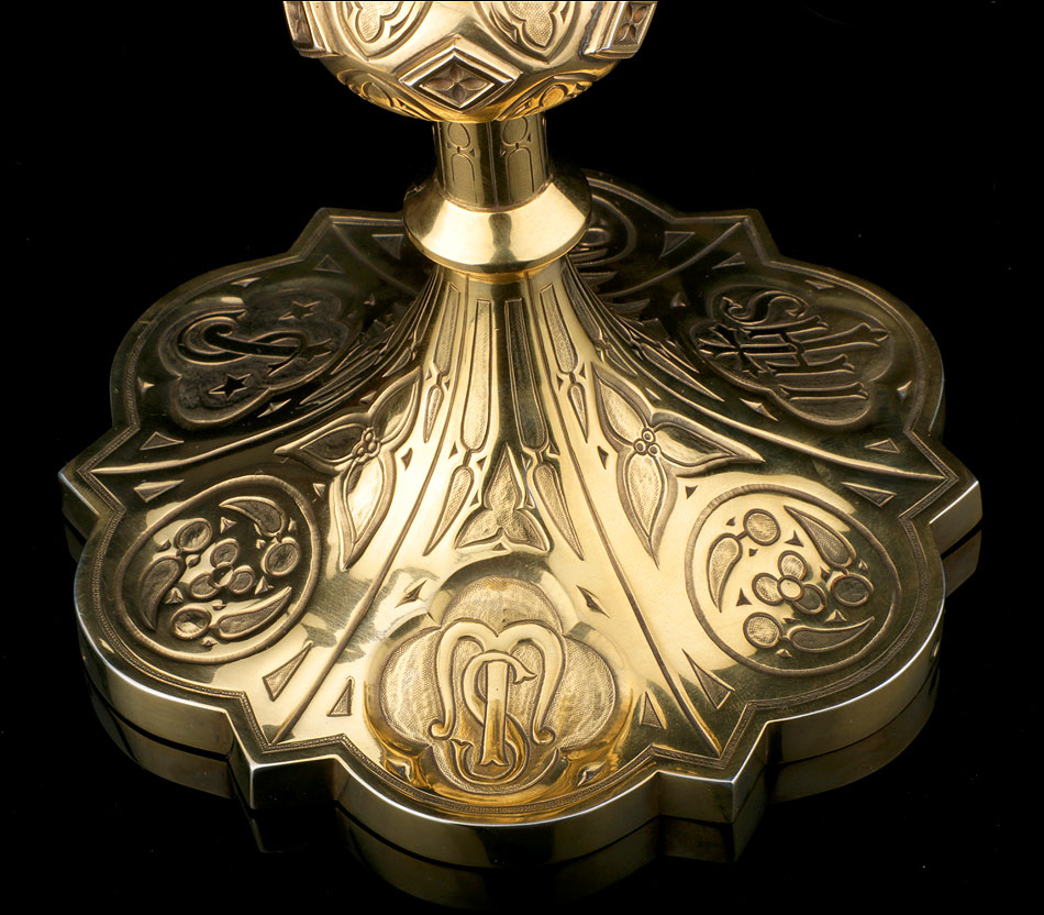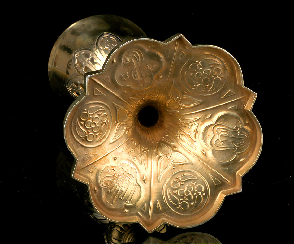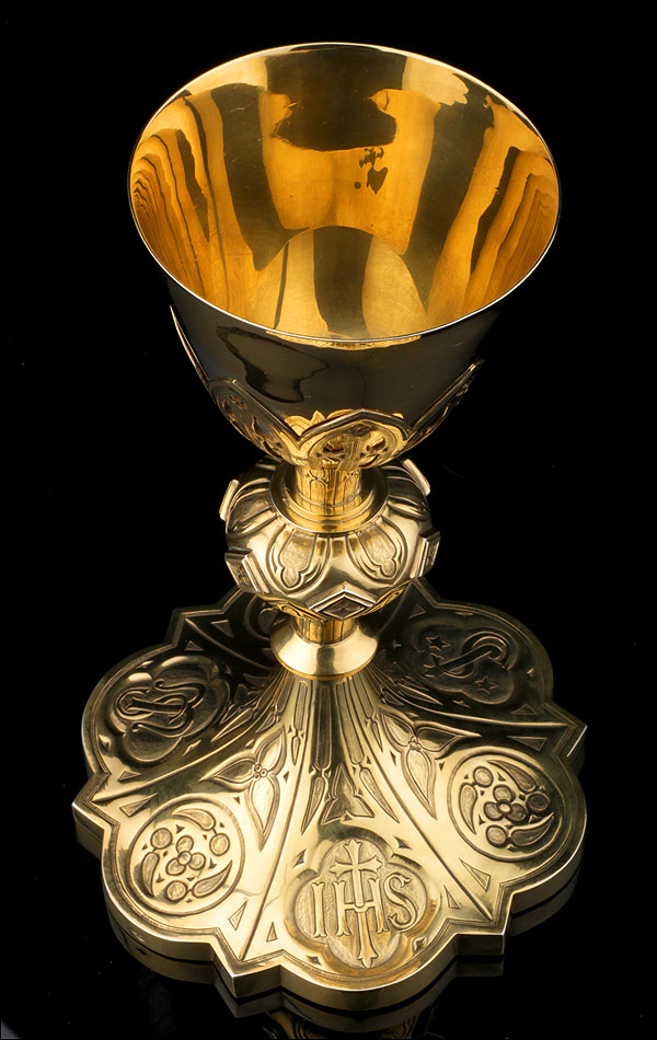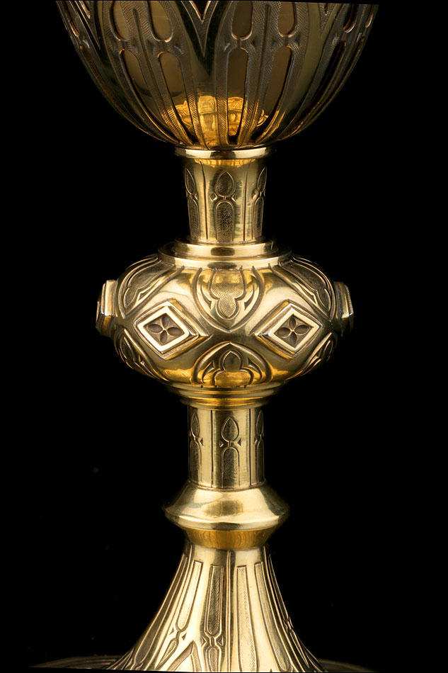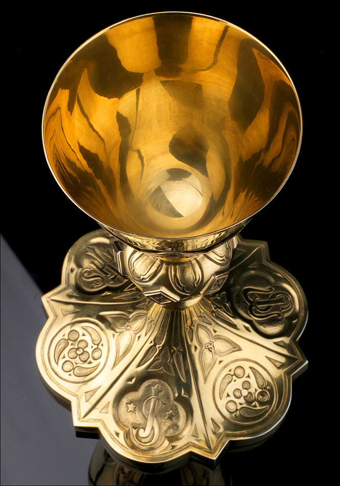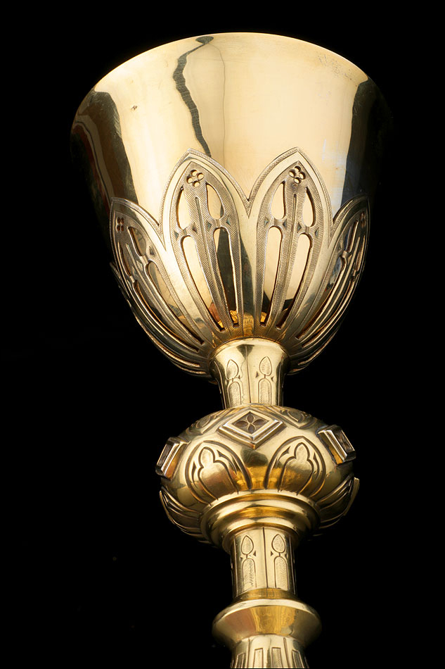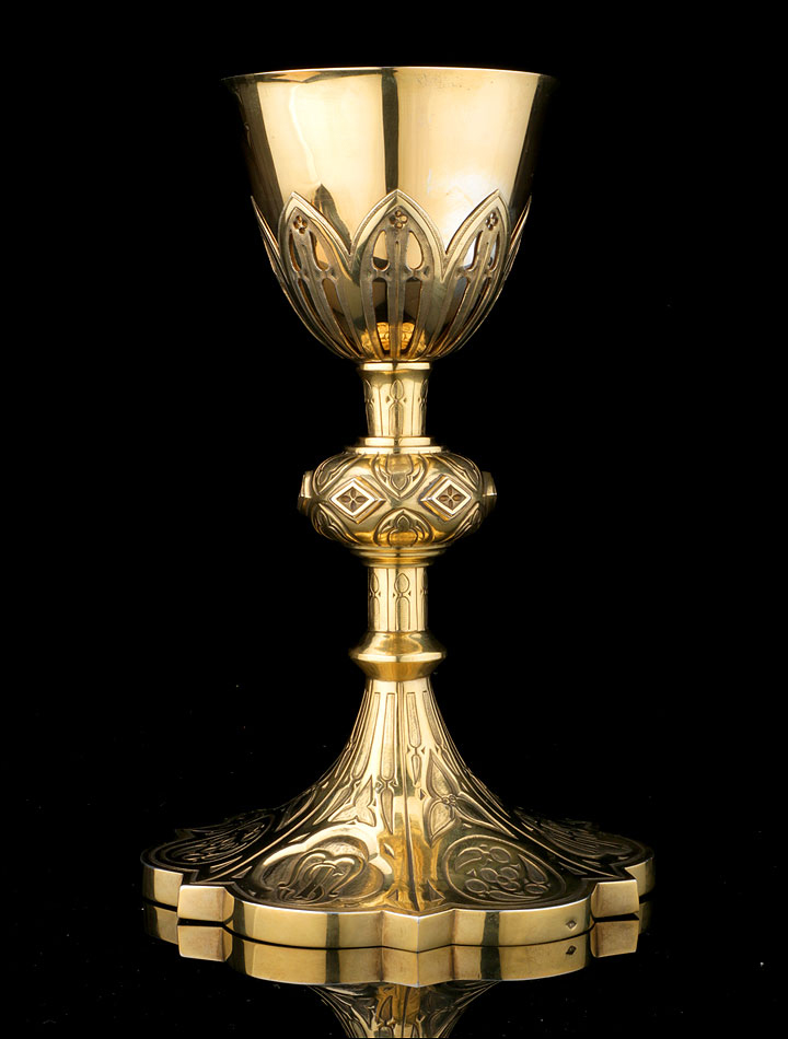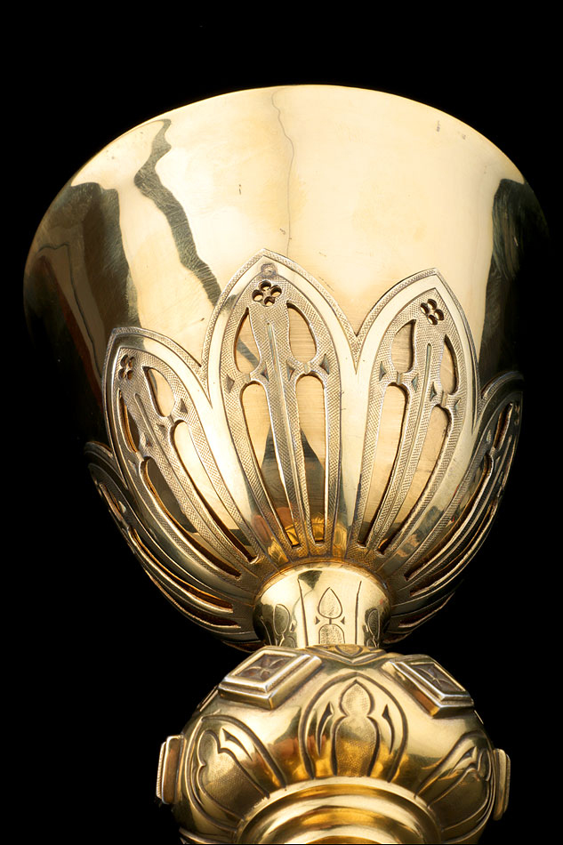 Este magnífico y antiguo cáliz neogótico en plata maciza dorada destaca por su elegante sobriedad.