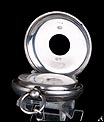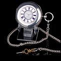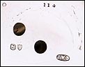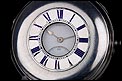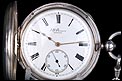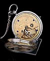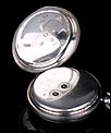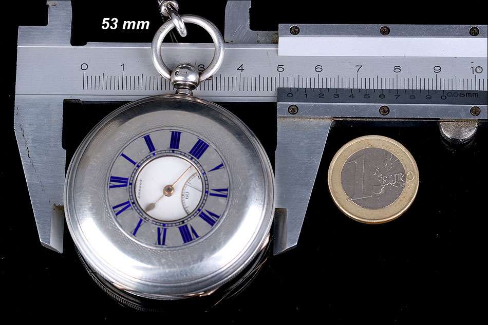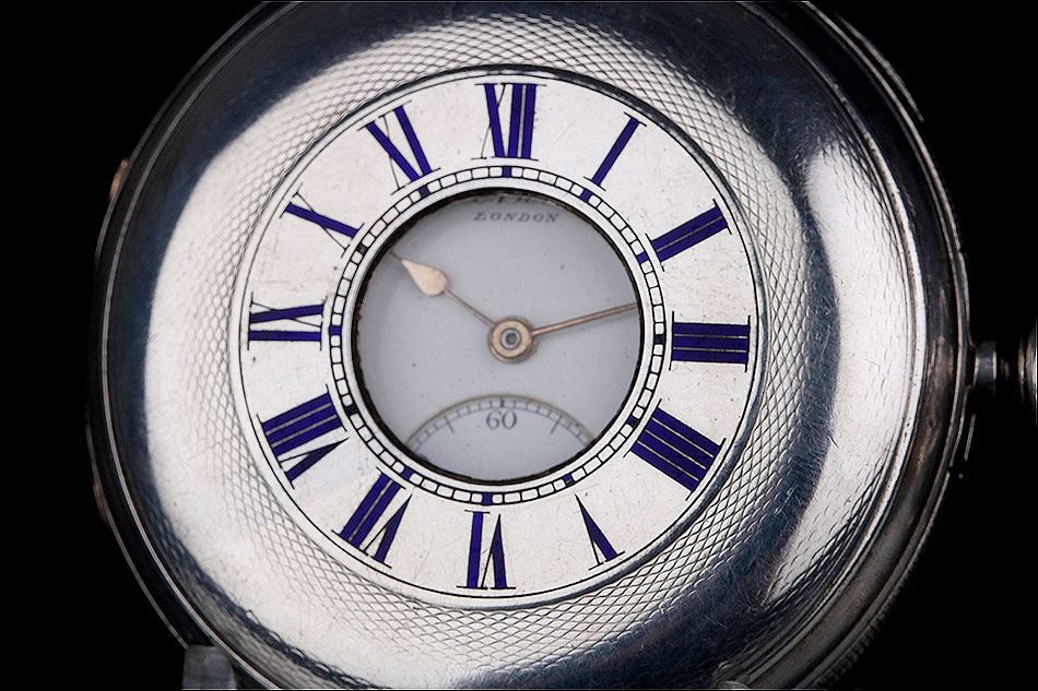 La cubierta frontal lleva números romanos en azul con un anillo de minutos en el interior y una abertura circular para leer la hora en la esfera sin abrir la caja. En el interior de la tapa se puede encontrar el león de plata de ley inglesa y la marca de la letra de la fecha, en mayúscula, “L" correspondiente a 1886.