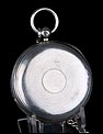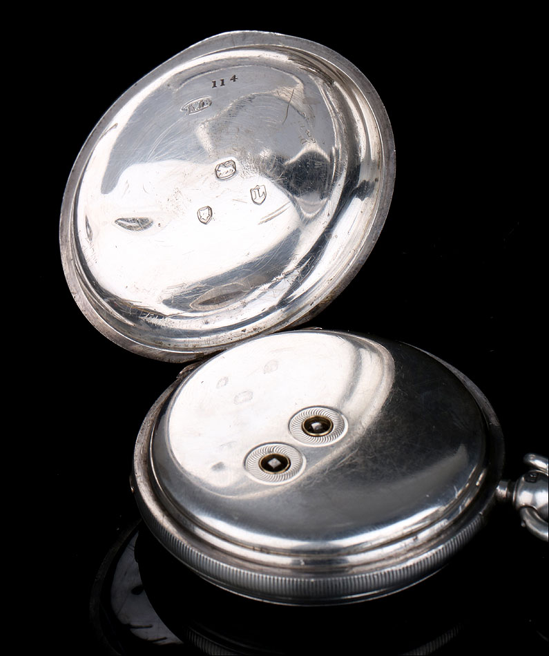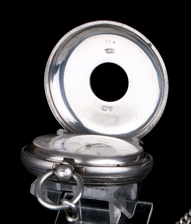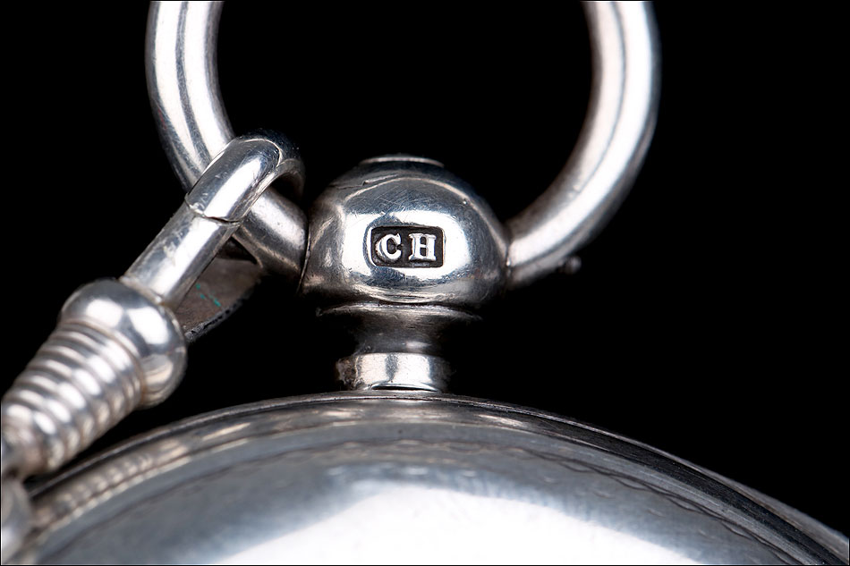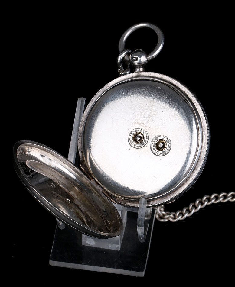 Caja: 53mm de diámetro, plata de ley, cuatro hojas o tapas, caja de reloj de bolsillo de tipo semi-cazador con colgante de bola de plata y anillo colocado en las posición de las 3 y opuesta a la bisagra de la caja. Los bordes de la carcasa están moleteados. El colgante de plata tiene el sello de la plata maciza y lleva una estilizada marca de la letra de fecha 'm', quizás 1867. El colgante también lleva una marca de fabricante 'CH' en un camafeo rectangular lo que indica que tal vez fue hecho por Charles Hill de Russell Terrace, en Coventry.