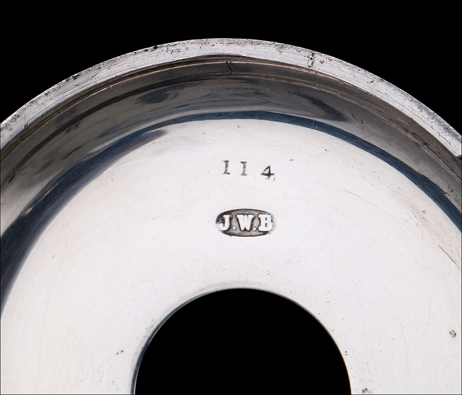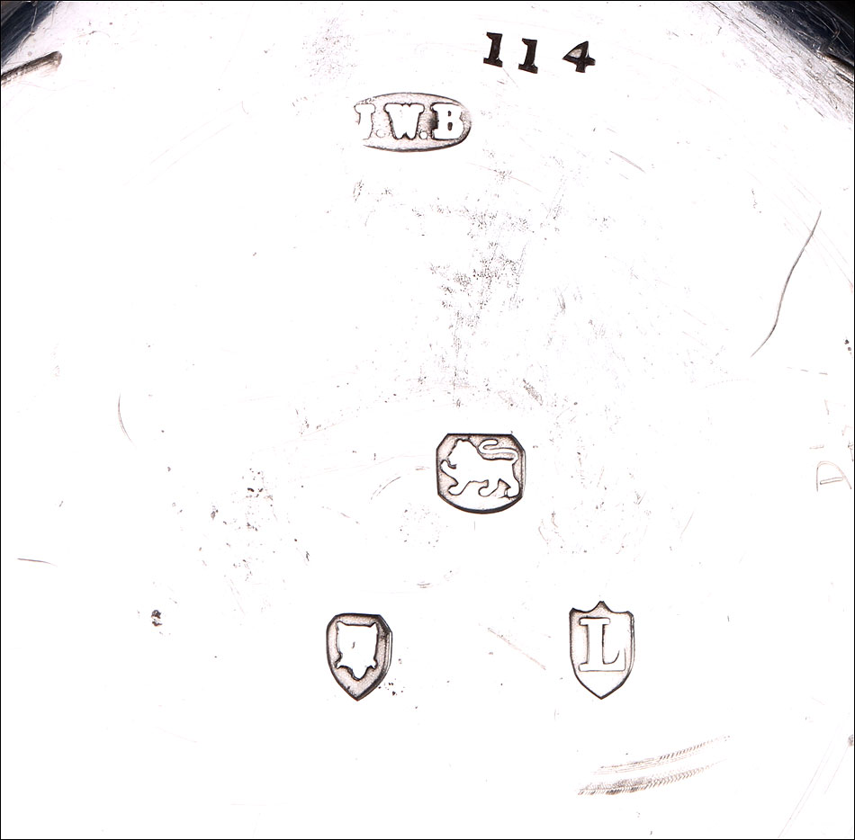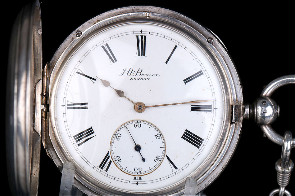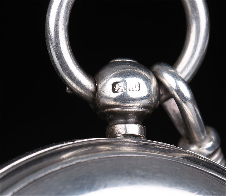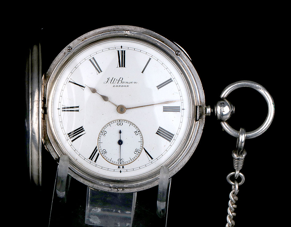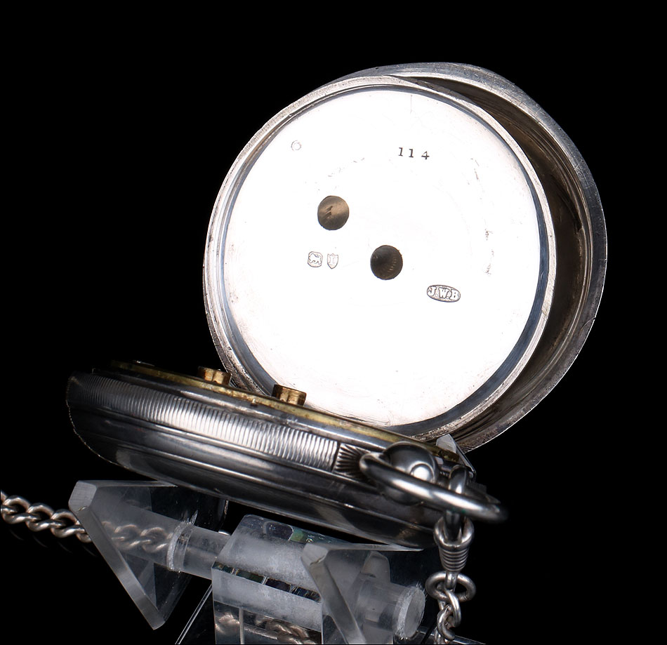 La marca J.W.B. en un camafeo en forma de cigarro también está presente. Las diferentes tapas están marcadas de forma similar y difieren de la marca en el colgante. Un colgante tal vez suministrado por el platero Charles Hill para uso de Benson. Esfera redonda esmaltada en blanco con números romanos, y manecillas doradas de doble pica. El dial está firmado por J.W. Benson, Londres.
