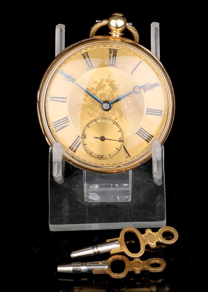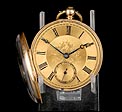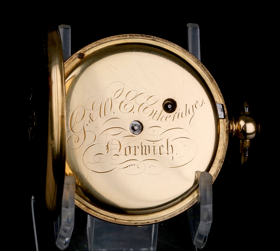 Reloj de bolsillo de caballero semi-catalino en oro amarillo de 18 K, con cuerda y puesta en hora a llave, con esfera abierta, fabricado por John B. Cross de Londres para el distribuidor y joyero Etheridge & Ellis de Norwich (Norfolk). Fabricado alrededor de 1853.