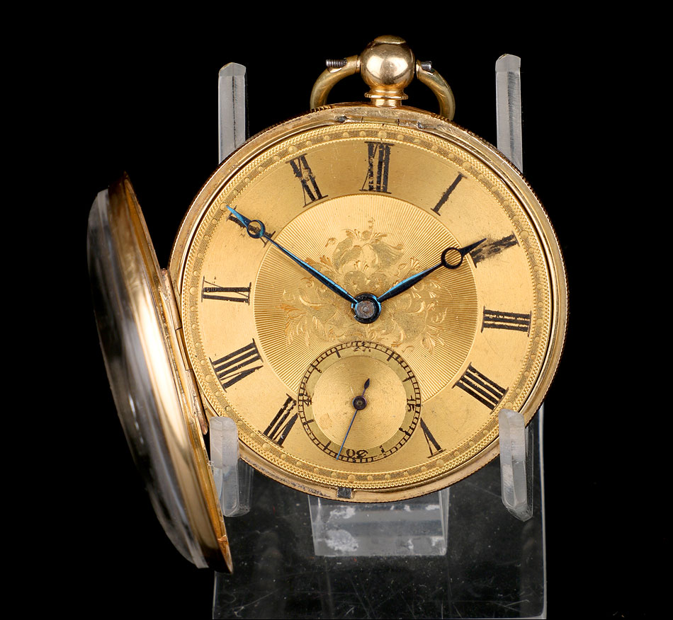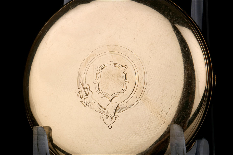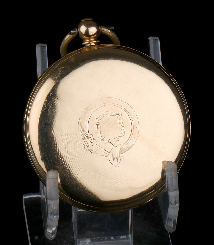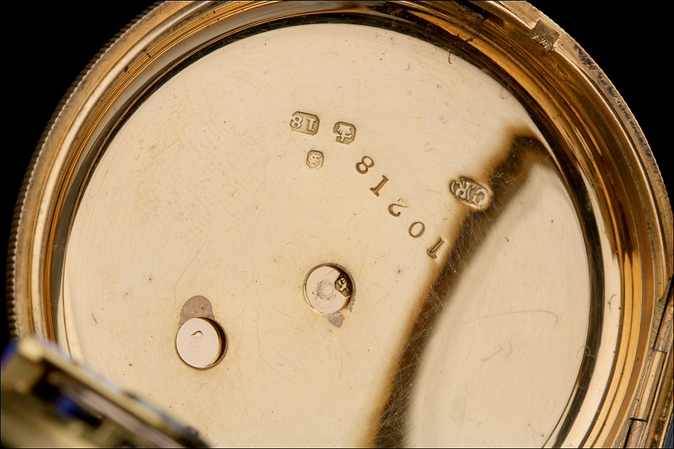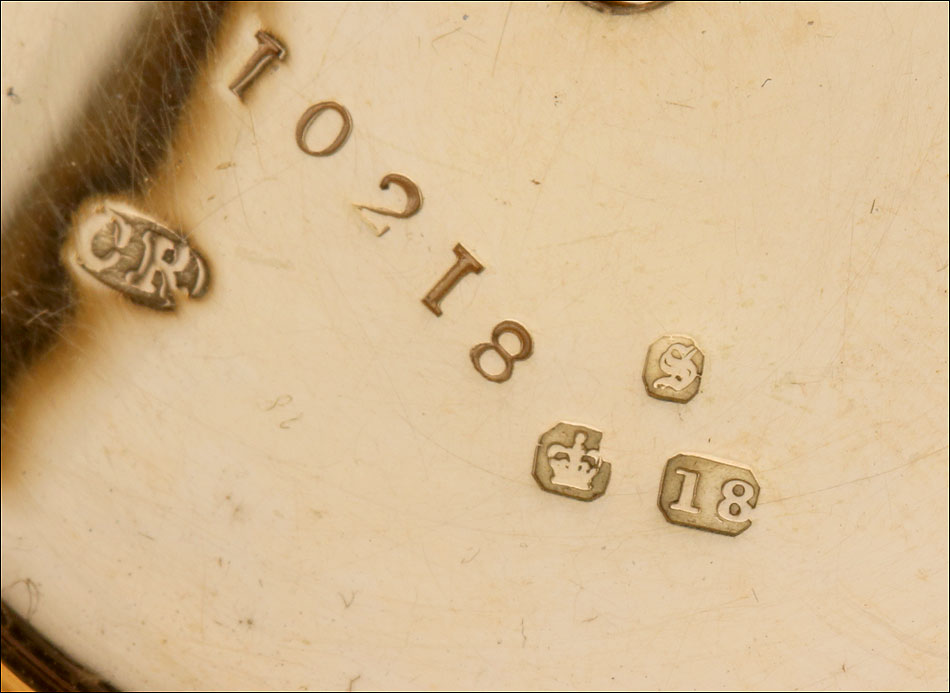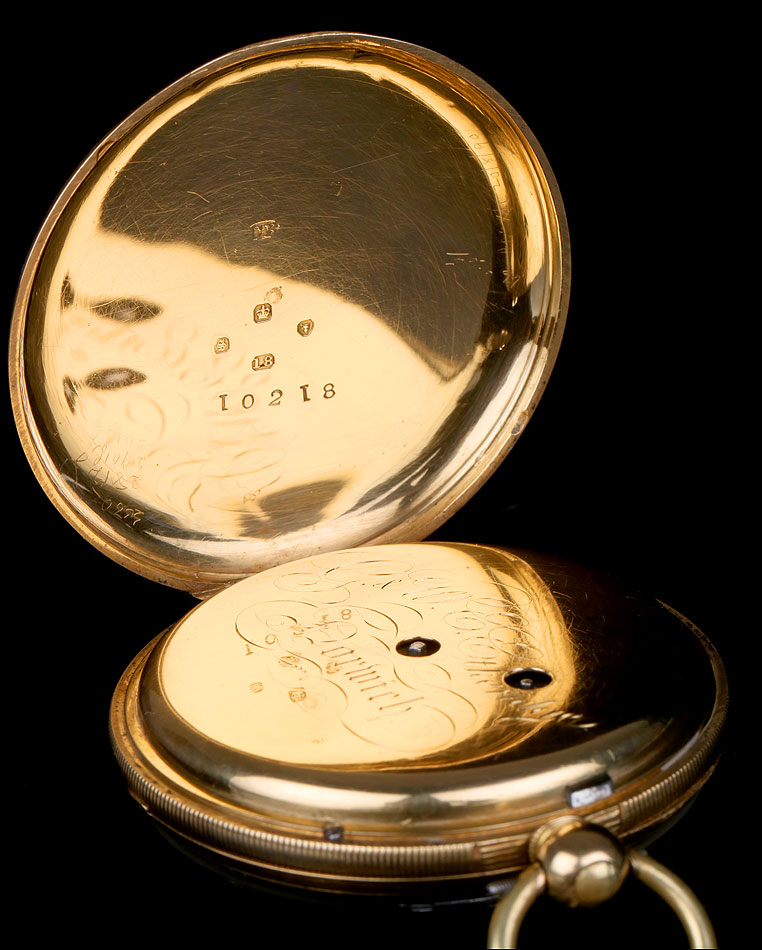 Caja: reloj de bolsillo de 44mm de diámetro, en oro amarillo de 18K, de tres hojas, con esfera dorada y con colgante y aro de oro macizo en la posición de las 12. La cubierta exterior está grabada con un camafeo en forma de escudo para las iniciales del propietario. El interior de la cubierta contiene los siguientes sellos distintivos: Cabeza de leopardo sin corona = Londres. Corona y el número 18 por la calidad del oro de 18K. La marca de fecha es la letra 'S' en caligrafía antigua, equivalente a 1853. Las iniciales CR, pertenecientes al fabricante de la caja, muy probablemente del orfebre Christopher Rowlands, 33 Smith Street, Northampton Square, Clerkenwell. La cubeta tiene dos aberturas para la cuerda y puesta en hora y está firmada, "G. & W.E. Etheridge, Norwich", la firma joyera que vendió este reloj.