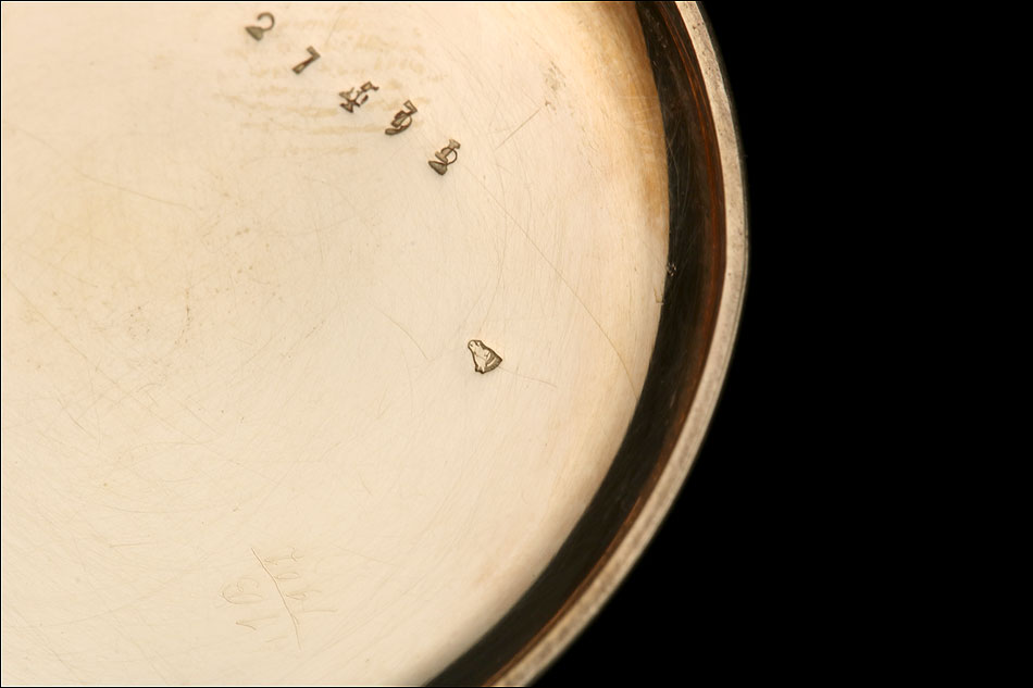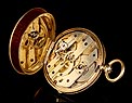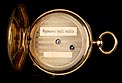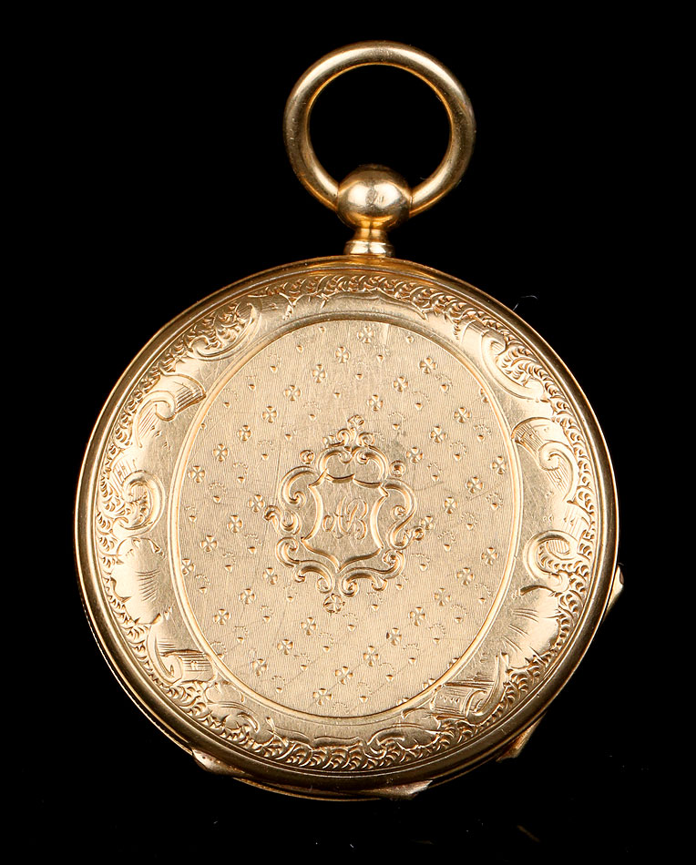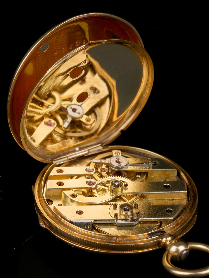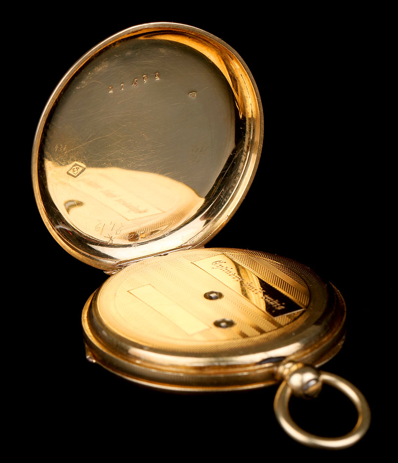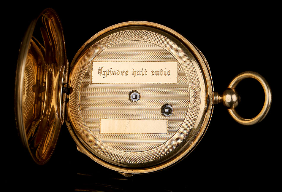 Caja: caja de 33 mm de diámetro, de tres hojas. Caja del reloj de oro amarillo macizo de 18 K con aro y colgante colocado en la posición doce. La contraportada con un camafeo en forma de escudo grabado en rococó con las iniciales del propietario rodeado de un campo de grabados dorados de Flores de Lys y un borde de lleno de remolinos. El interior de la tapa lleva las iniciales del fabricante de cajas en Francia,'EP', junto con un sello francés de oro macizo de 18k usado entre 1838 y 1919 ( una cabeza de caballo o cabeza de burro). La cubeta tiene dos aberturas para puesta hora y cuerda con llave (incluida) y marcada en francés: "Escape de cilindro con ocho rubís".