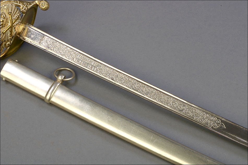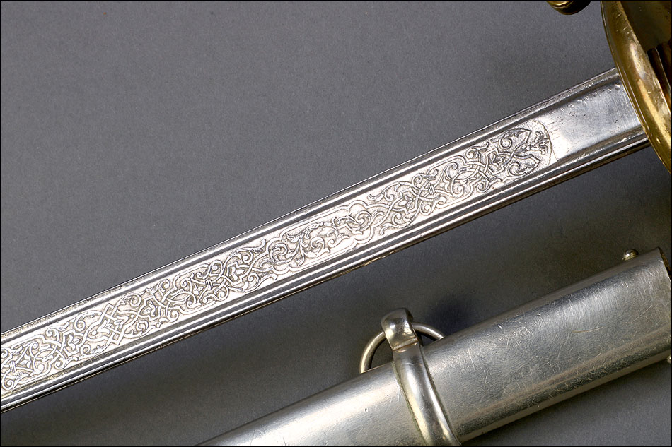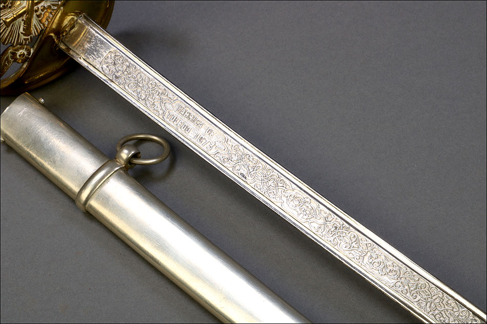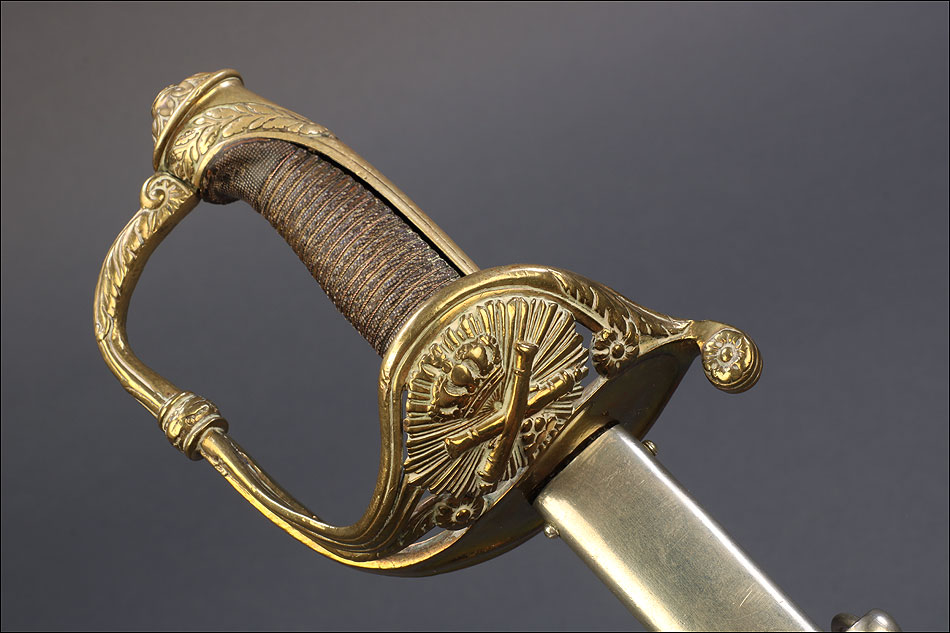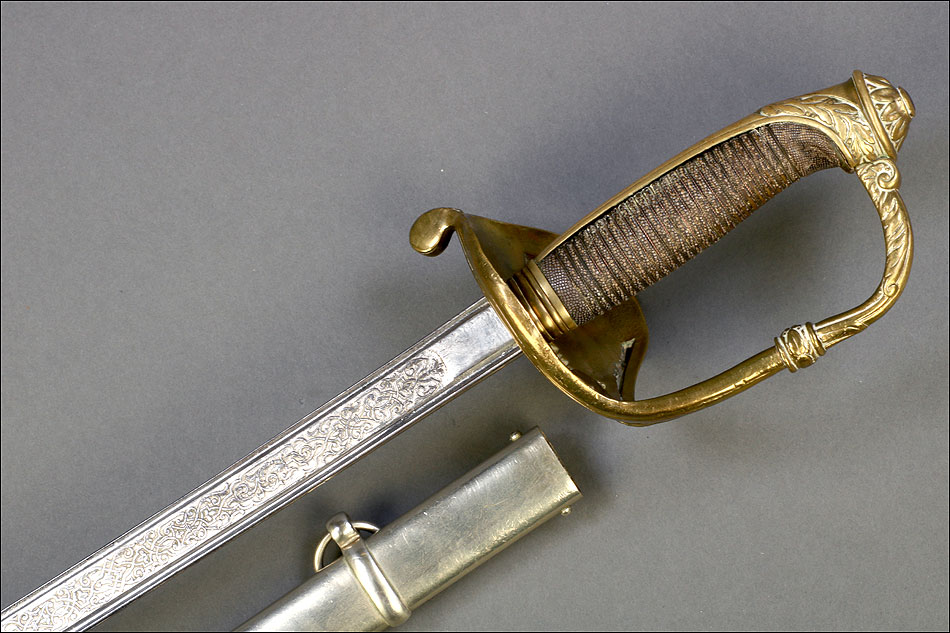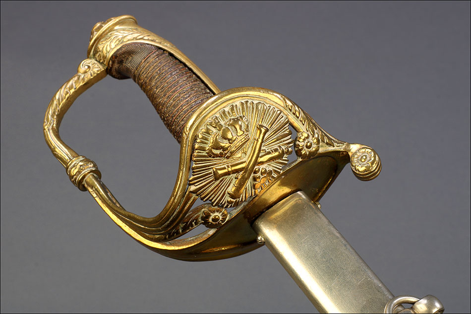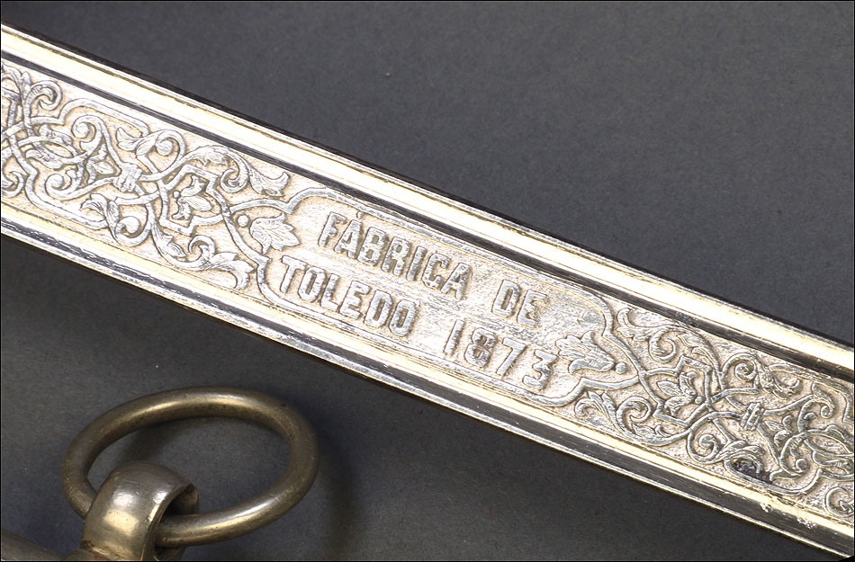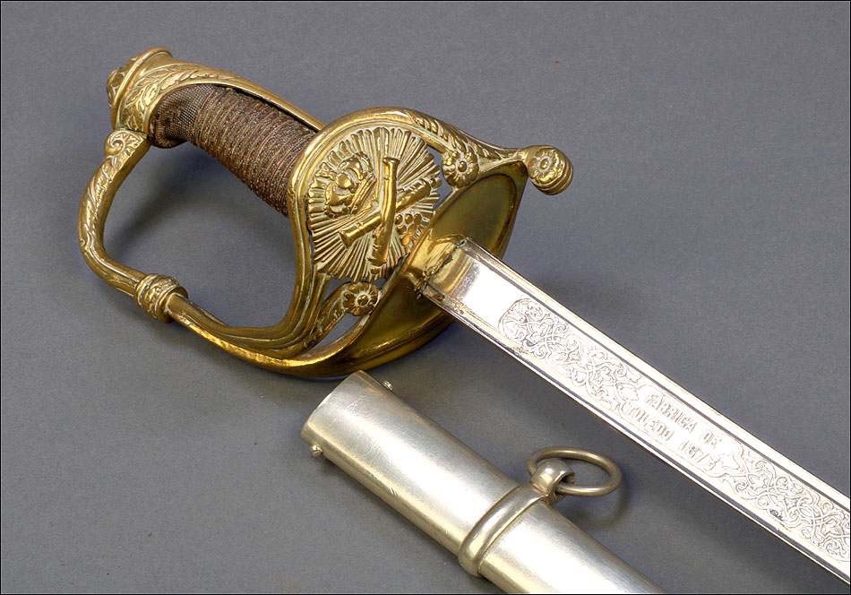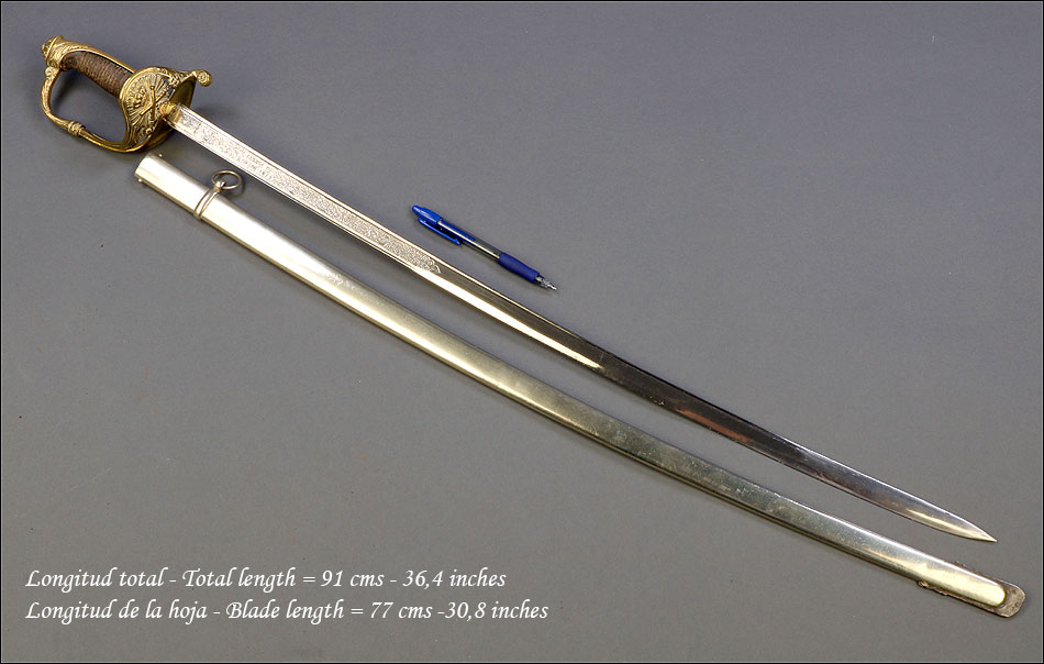 Hermosa y antigua espada de oficial de artillería española modelo 1862. Esta espectacular espada fue fabricada en España en 1873 y ha llegado a nosotros en el magnífico estado que se puede apreciar en las fotografías. La espada se presenta con su vaina de acero original, lisa y brillante. La hoja, también de acero, está grabada con motivos decorativos y contiene la inscripción FÁBRICA DE TOLEDO 1873, que nos permite localizar y fechar la pieza con seguridad. Pero si la hoja es hermosa, también lo es la elegante empuñadura de la espada. Fabricada en latón, en la cazoleta podemos ver el símbolo del cuerpo de artillería (dos cañones cruzados con la corona real sobre ellos) grabado en relieve. El guardamano que une la cazoleta con el pomo lleva grabado un motivo vegetal que se prolonga por el puño. Este conserva la lija y el torzal que la mantiene en su sitio.