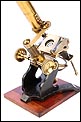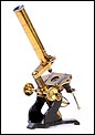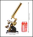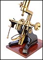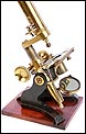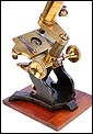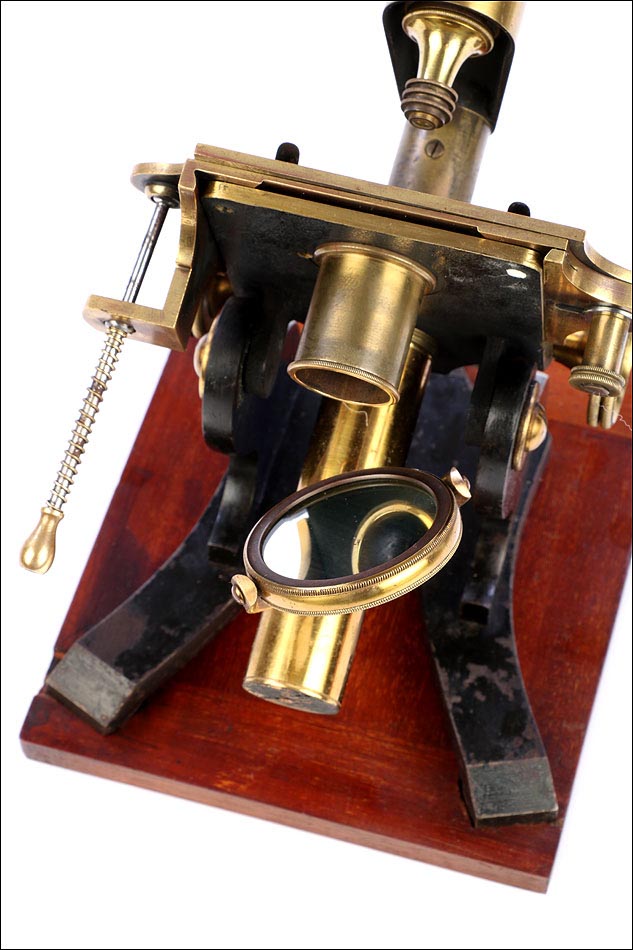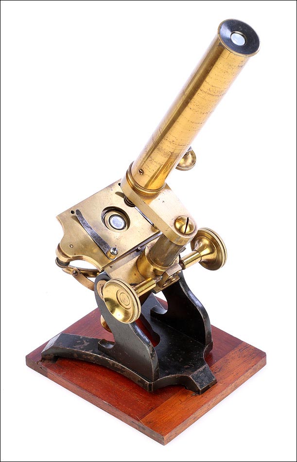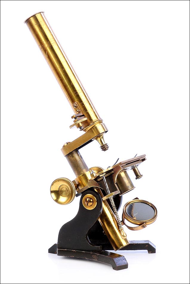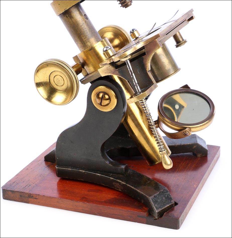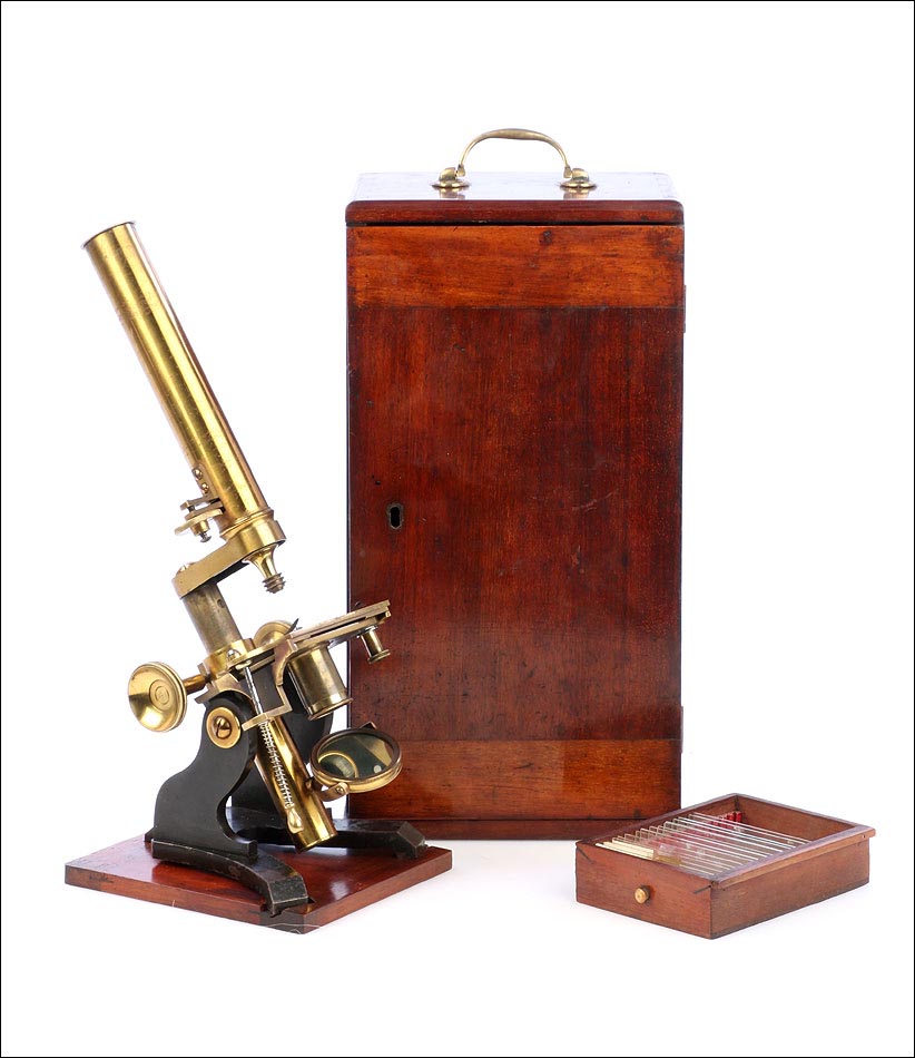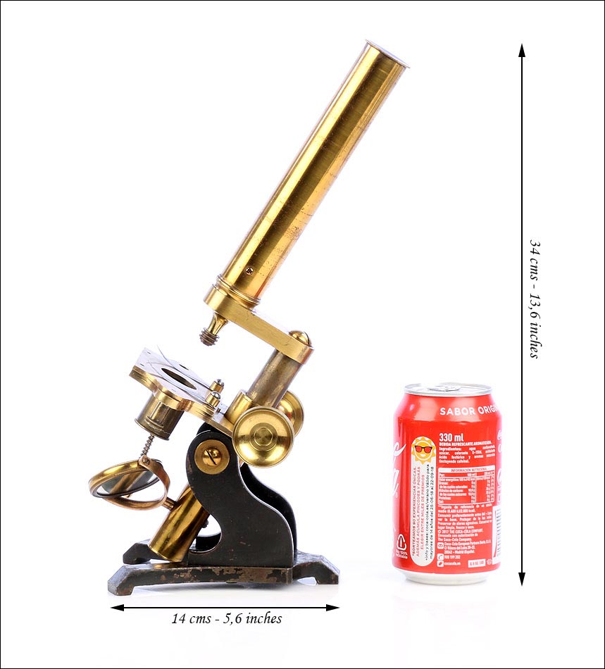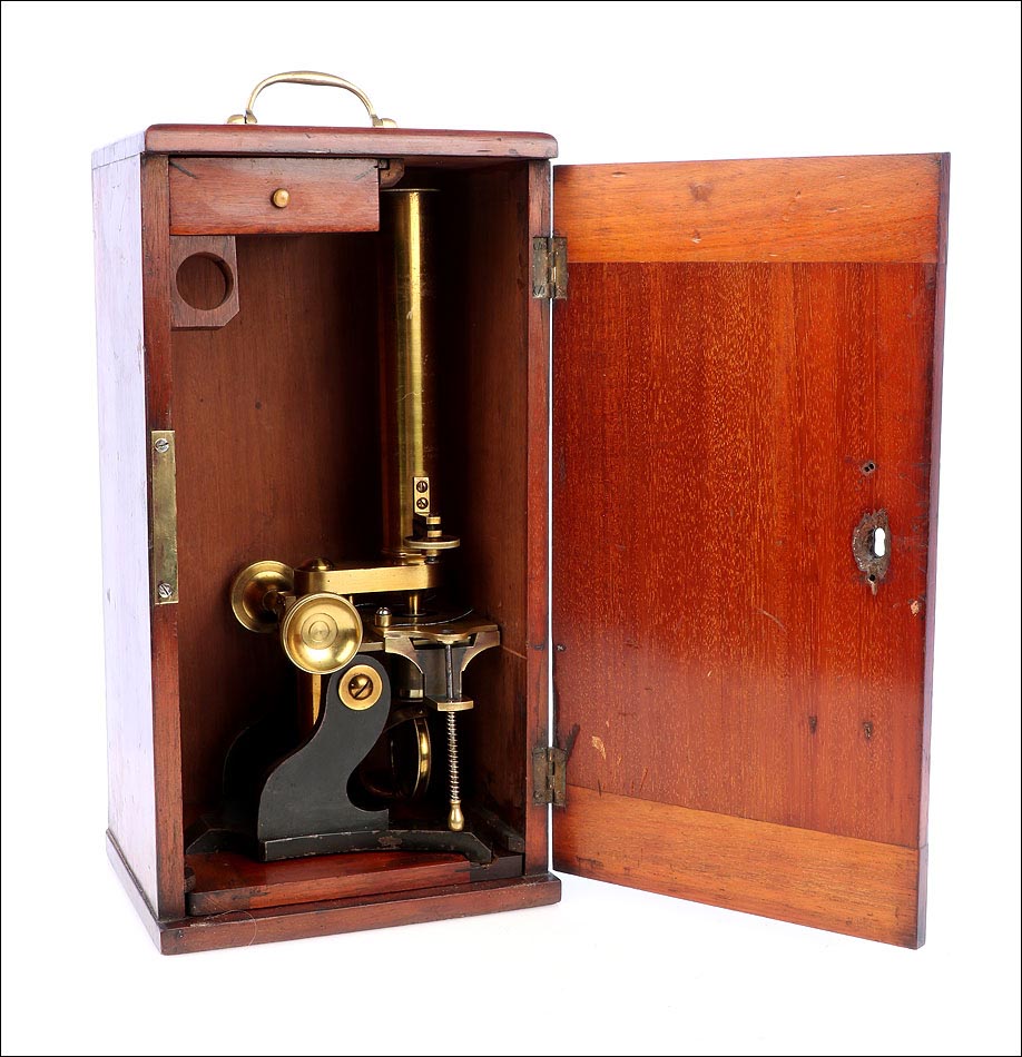 Antiguo microscopio compuesto inglés con estuche, fabricado a finales del siglo XIX (circa 1880) y muy bien conservado. Este hermoso aparato de investigación se presenta en su estuche original de época, fabricado en madera de caoba maciza y también en buenas condiciones. El microscopio está fabricado en latón, con soportes laterales de hierro y base de madera de caoba. Se encuentra en estado de funcionamiento: las lentes están limpias y permiten visualizar las muestras sin problemas. El artículo incluye también algunas muestras originales de época, perfectas para disfrutar del aparato.