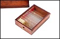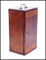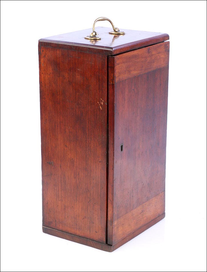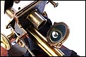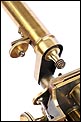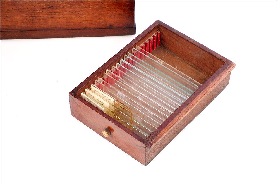 Las piezas de latón están muy bien conservadas, sin rastros de óxido y con la laca transparente protectora original de época. Los tornillos y partes móviles se mueven con fluidez; entre ellos destaca la pletina para las muestras, un curioso dispositivo que incluye una palanca con muelle. Los soportes de hierro son sólidos y fiables, y conservan la pintura negra original en buenas condiciones. En cuanto al estuche, la madera de caoba de la que está construido está magníficamente conservada y mantiene el acabado a muñequilla original. La madera conserva el bello color rojizo característico de la especie. El asa de latón es la original y está en un estado impecable. En el interior del estuche, en la parte superior encontramos el cajón extraíble con tres muestras de época y varias pletinas de cristal sin utilizar.